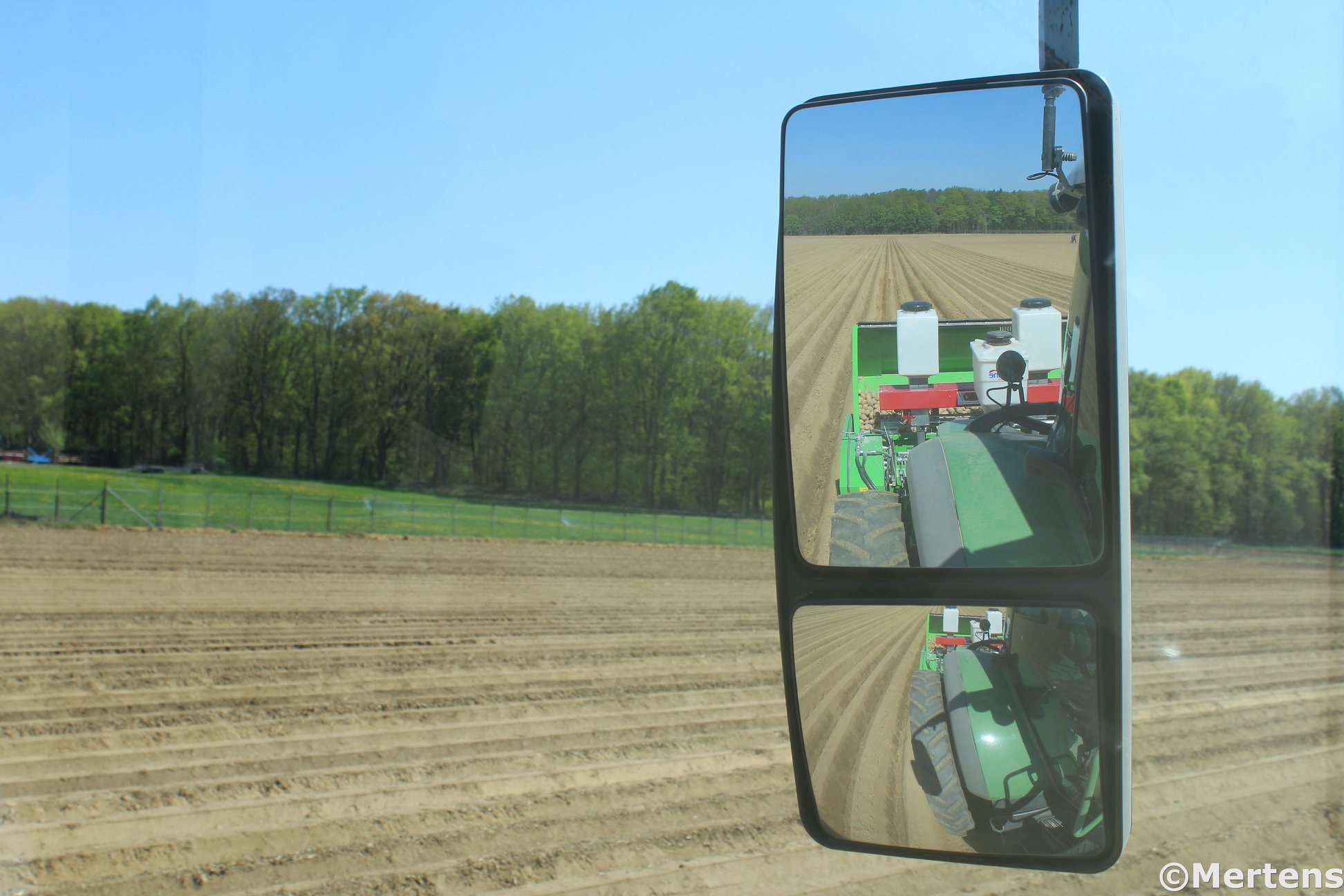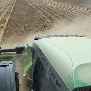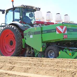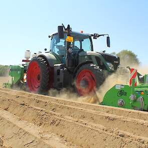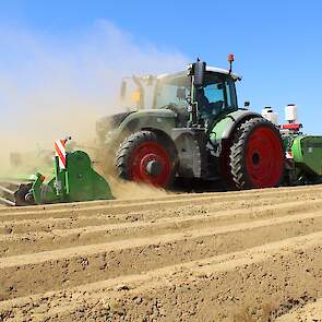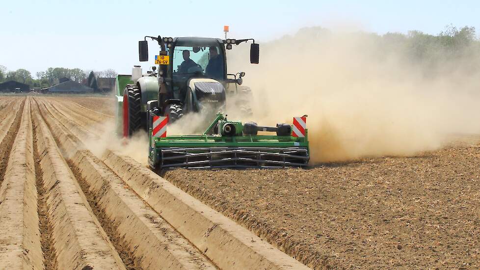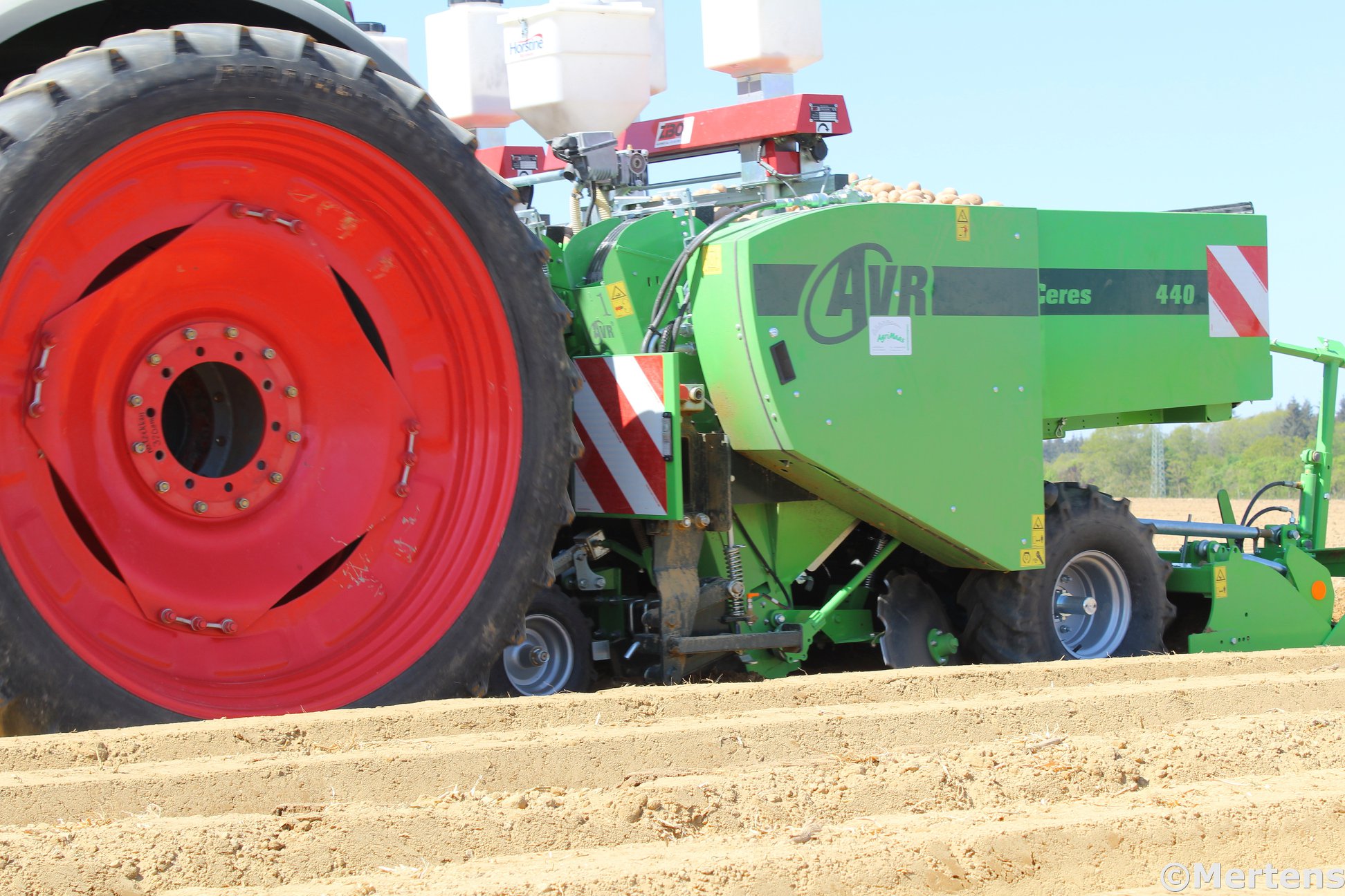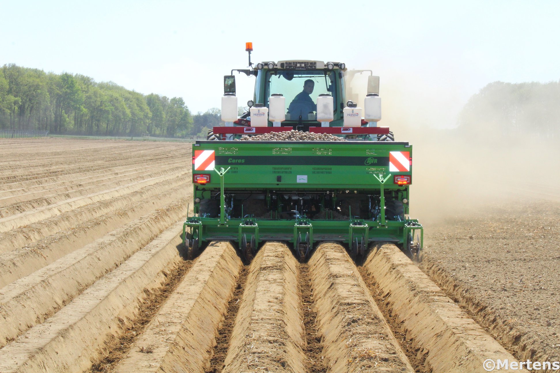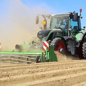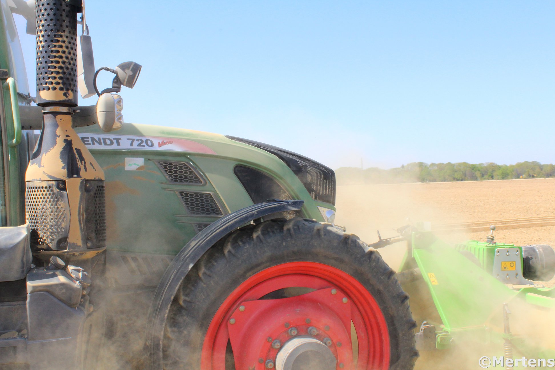 Met de Fendt 720 Vario met Avr-multivator en Ceres-pootmachine met aanaardkap aan het poten bij Mts Peeters- Rijs.