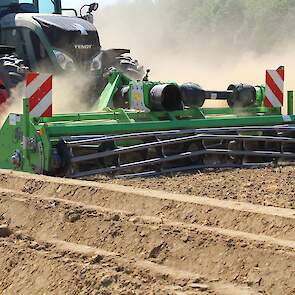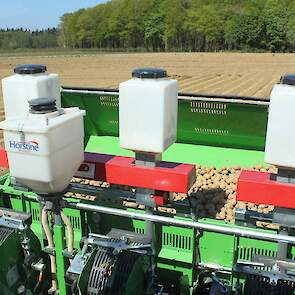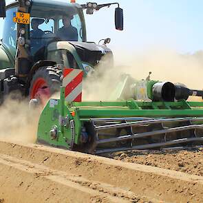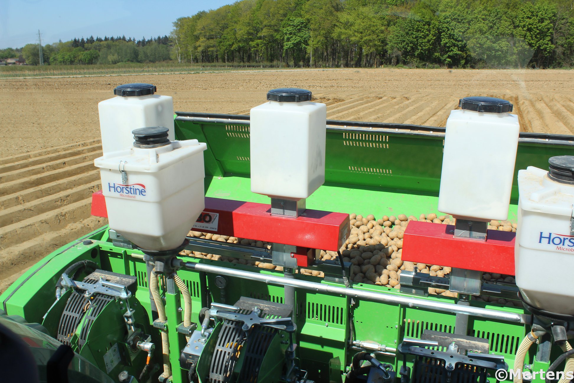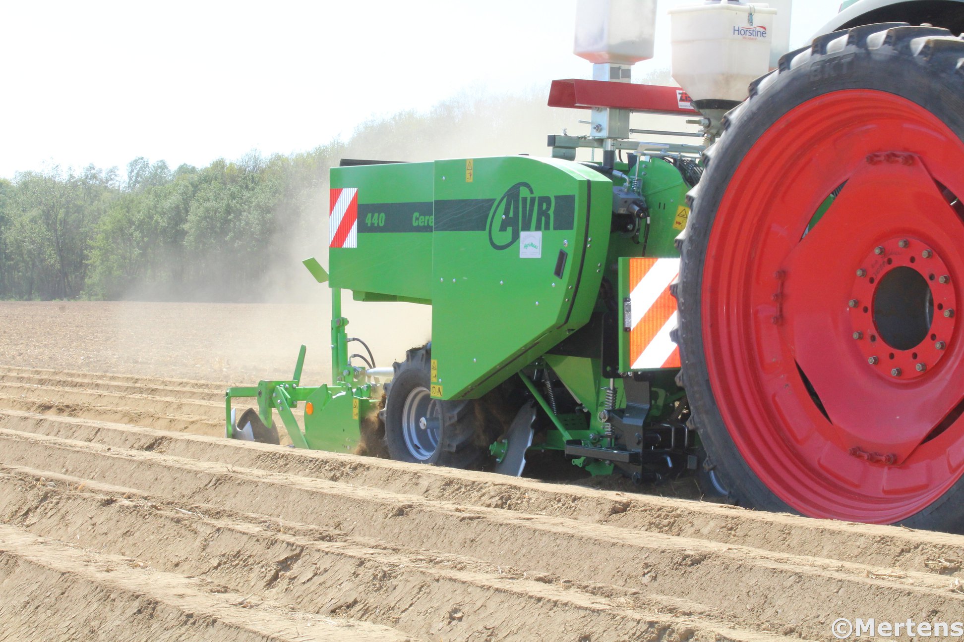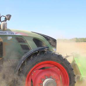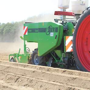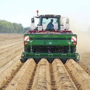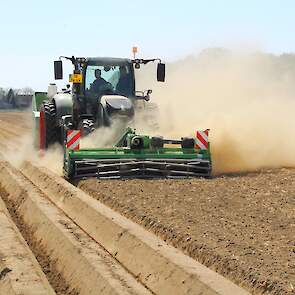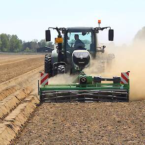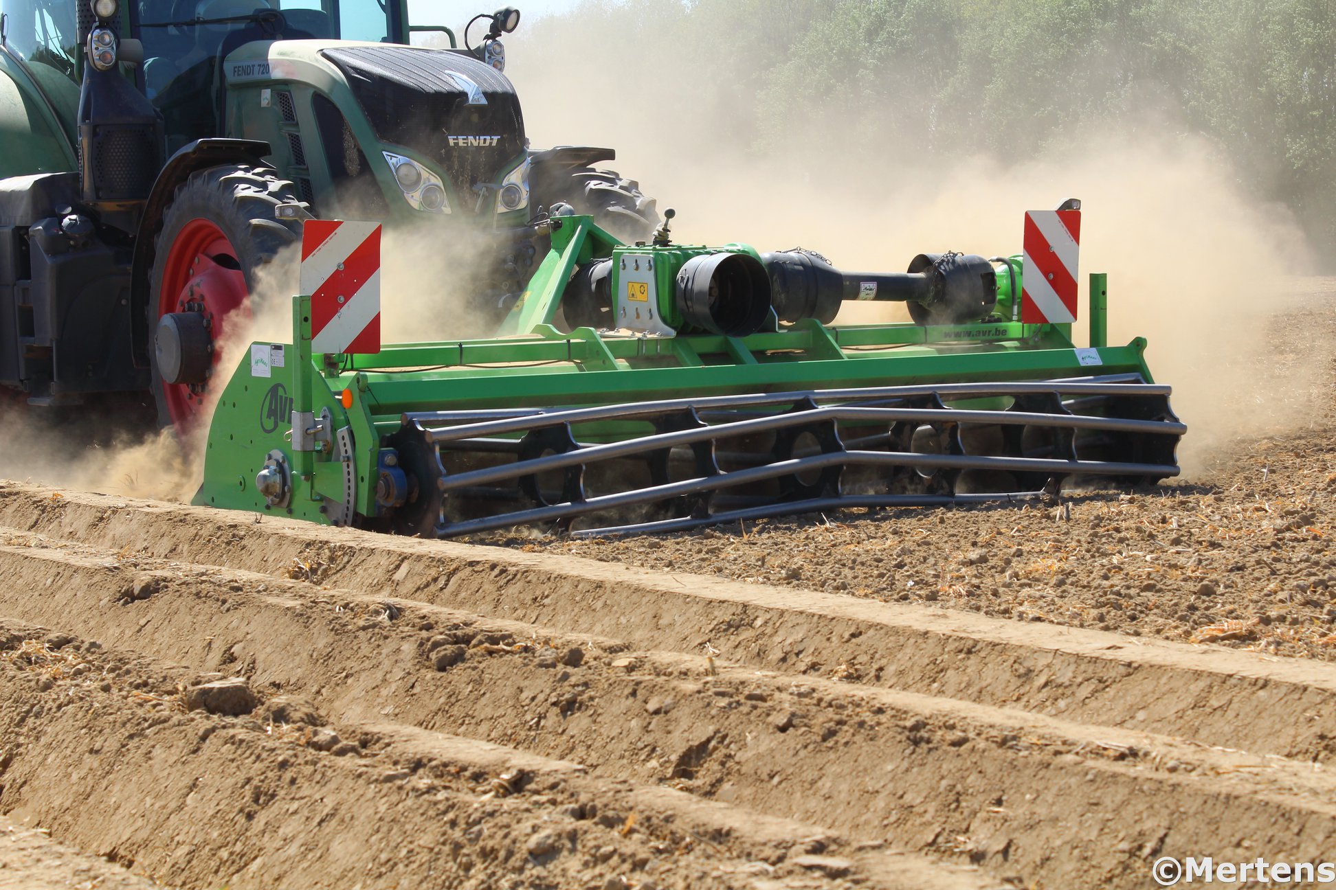 Met de Fendt 720 Vario met Avr-multivator en Ceres-pootmachine met aanaardkap aan het poten bij Mts Peeters- Rijs.