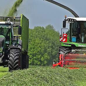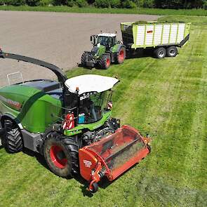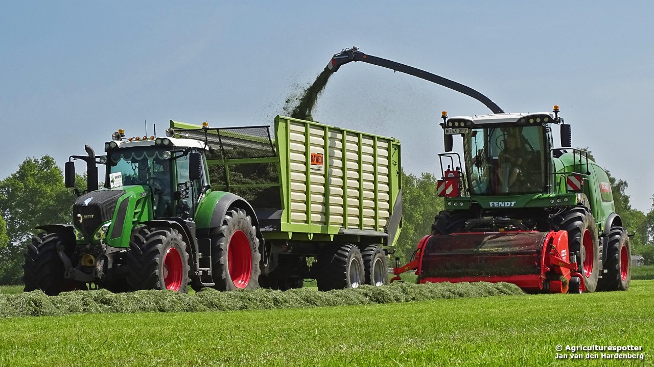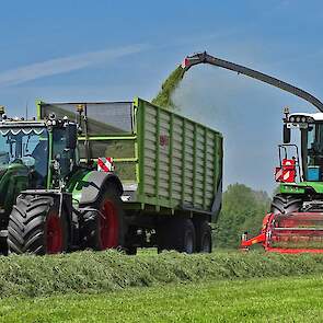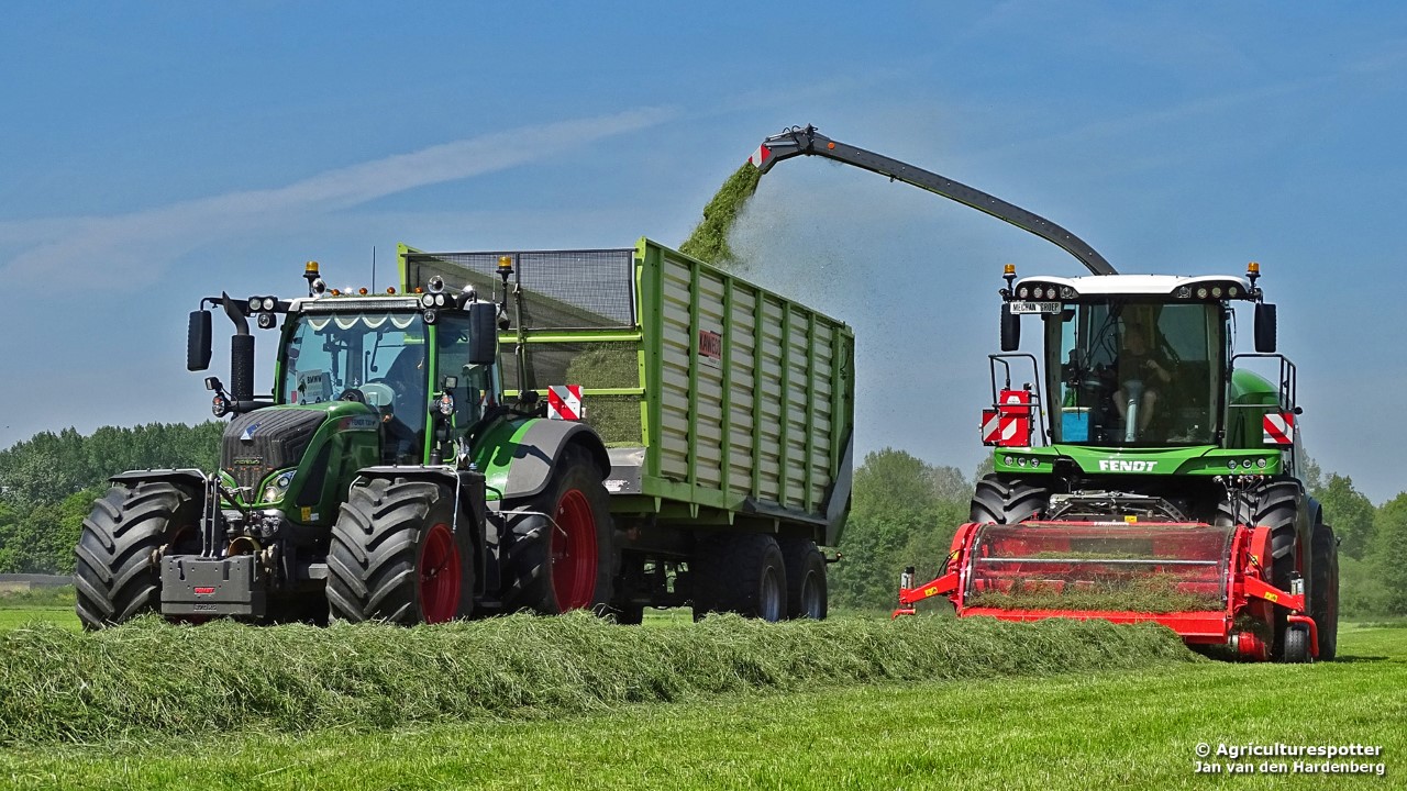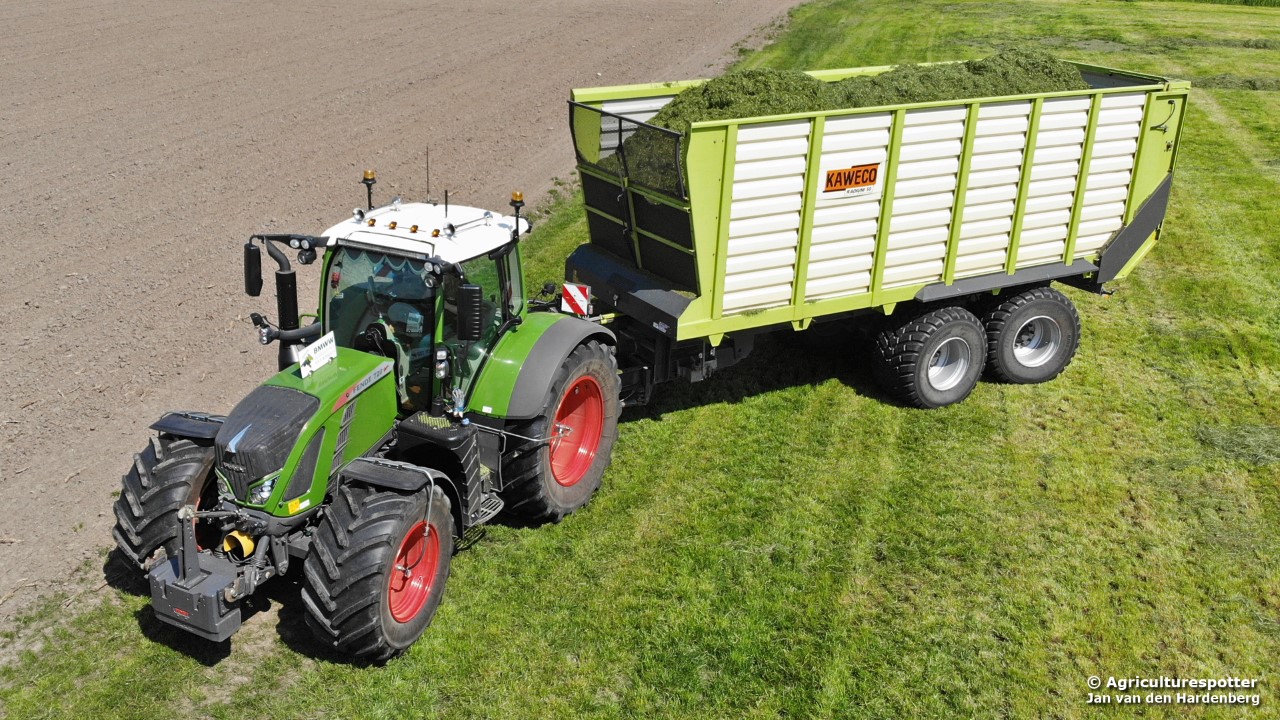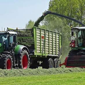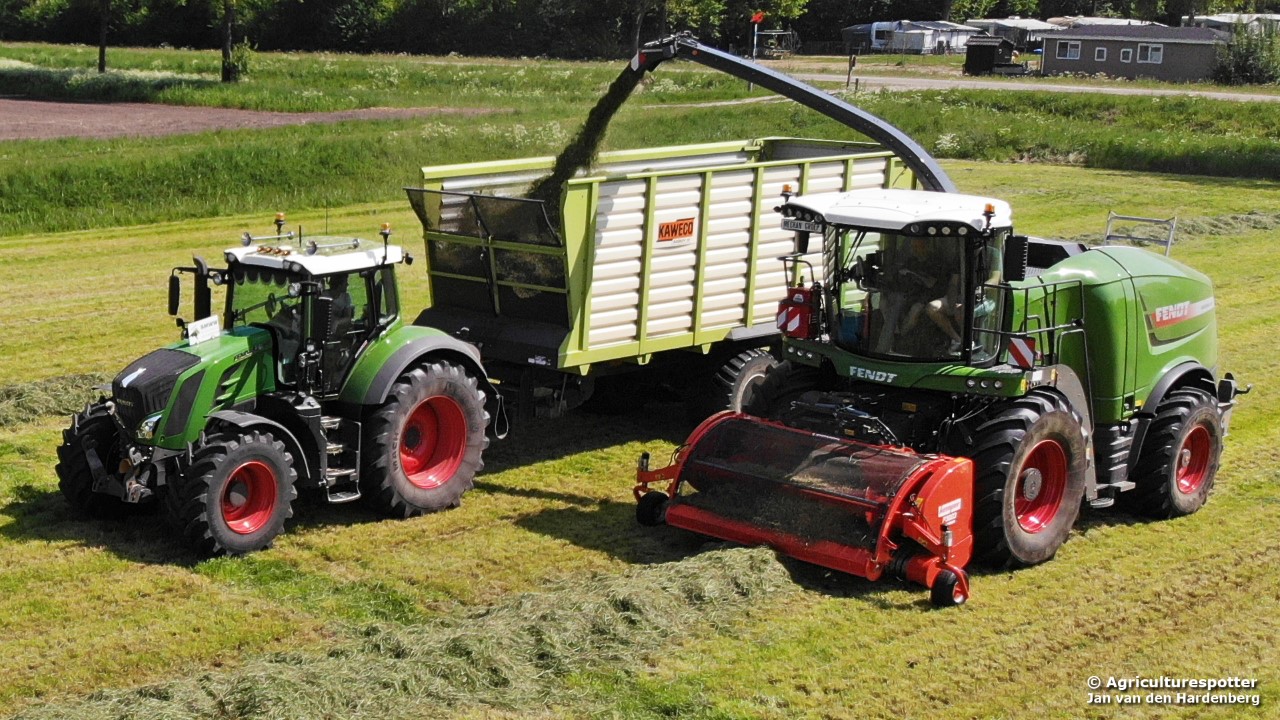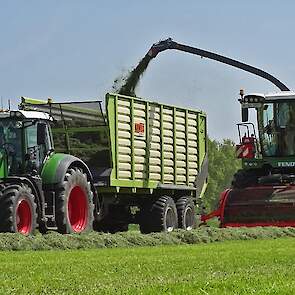 Gras hakselen door BMWW Agriservice uit Nijkerkerveen met een Fendt Katana 65, een Fendt 828 en een 720 Vario met Kaweco Radium-silagewagens.