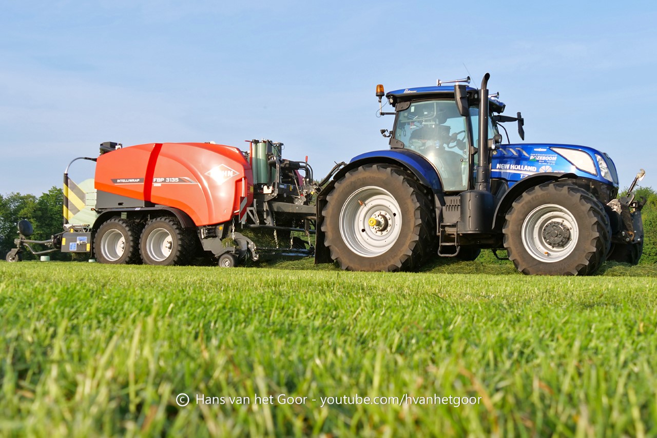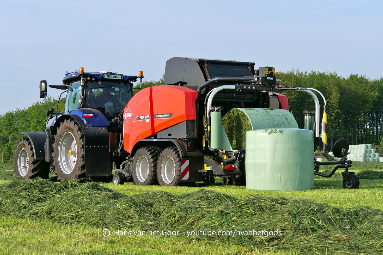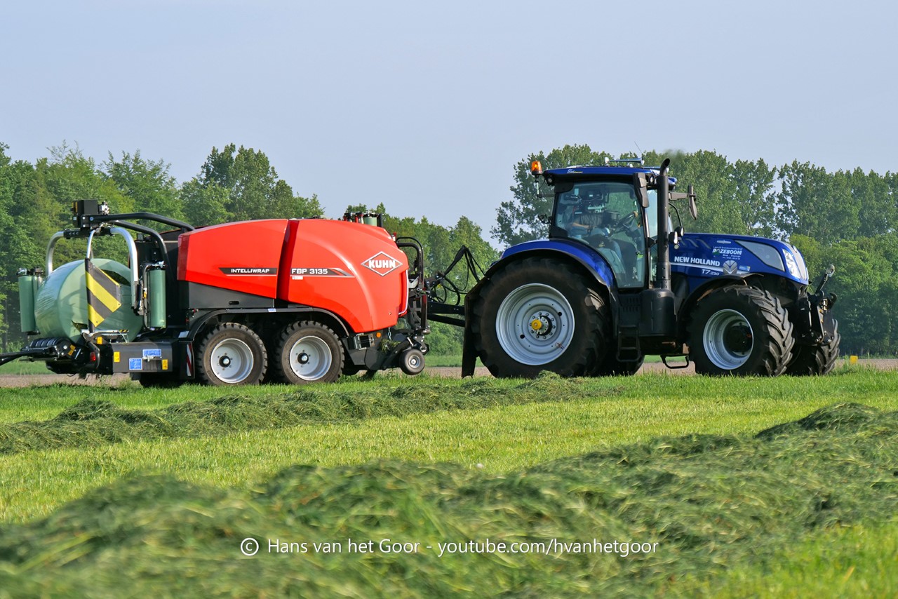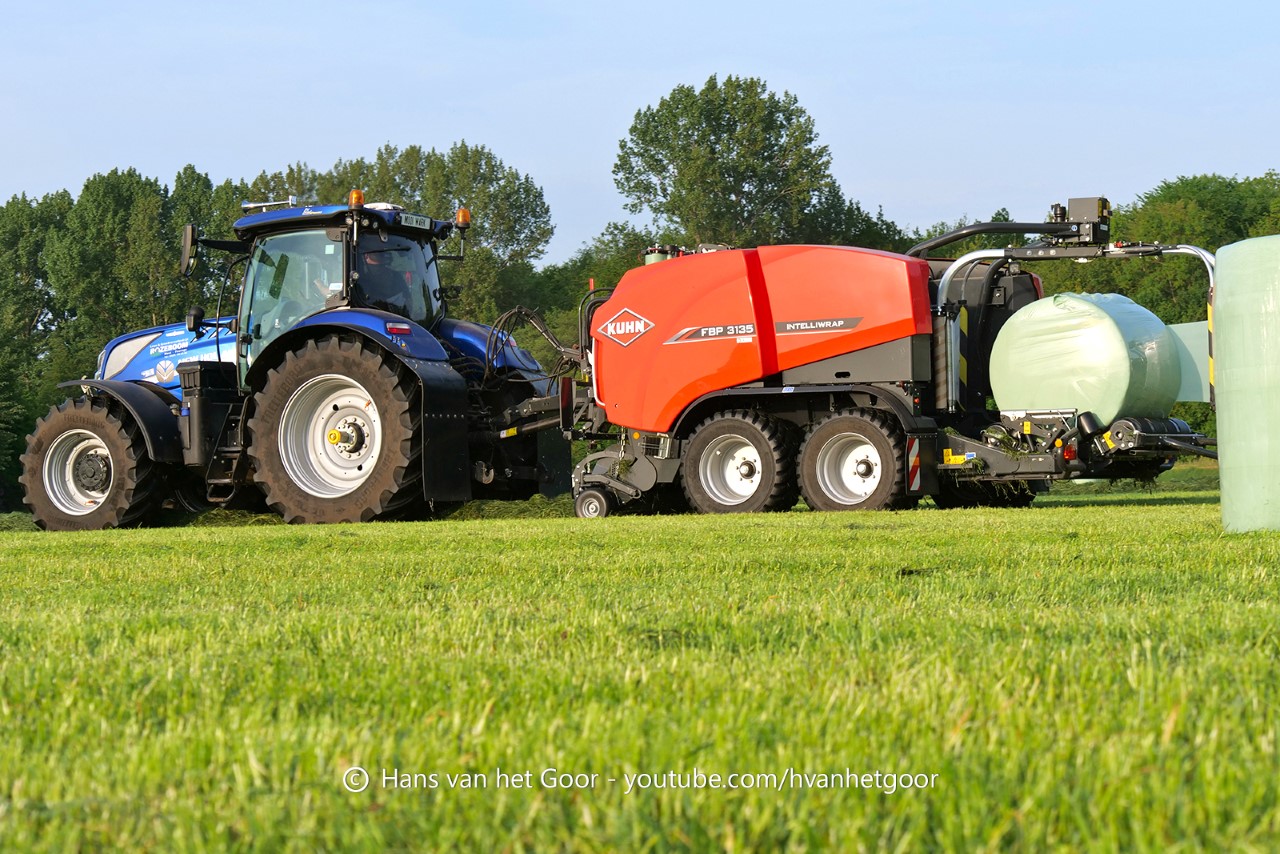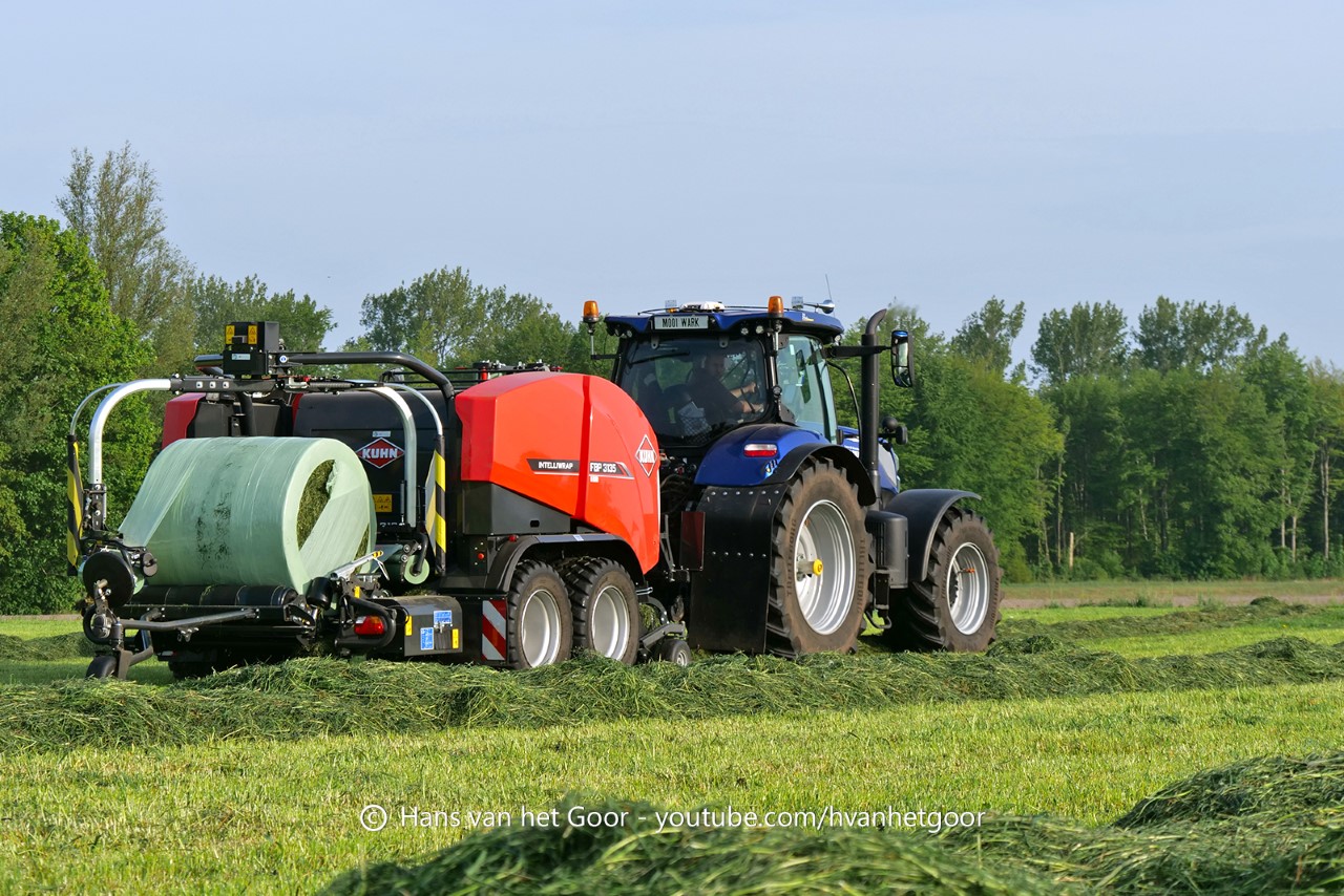Balen persen en wikkelen bij een melkveehouderij in Dronten met de nieuwe Kuhn Intelliwrap FBP 3135 van loonbedrijf Rozeboom uit 't Harde. Voor de perswikkelcombinatie voor ronde balen staat een New Holland T7.230 Blue Power.