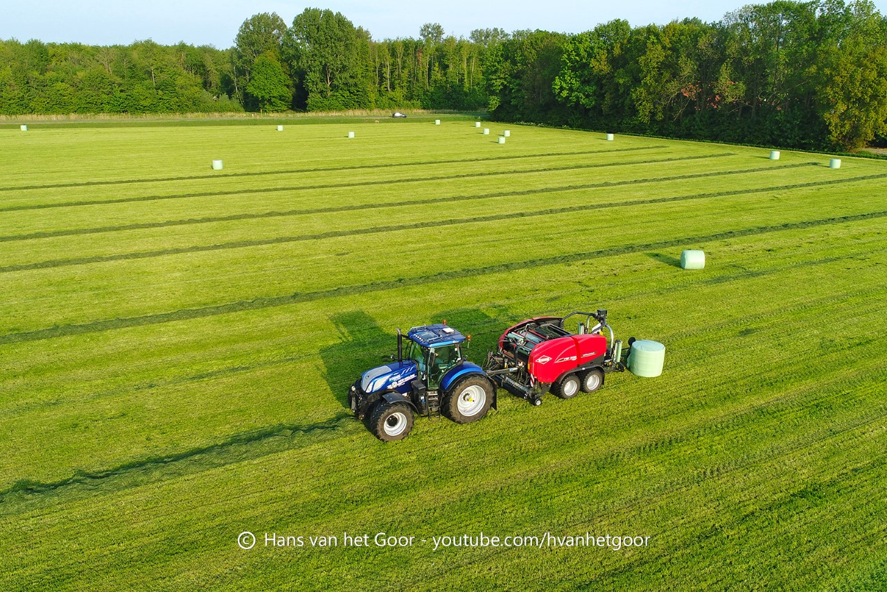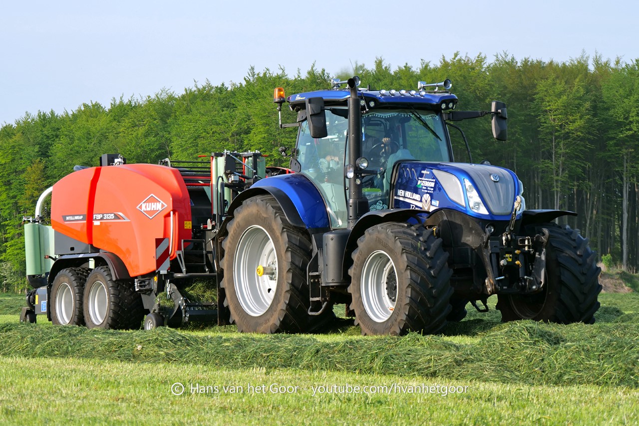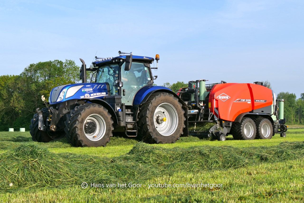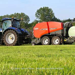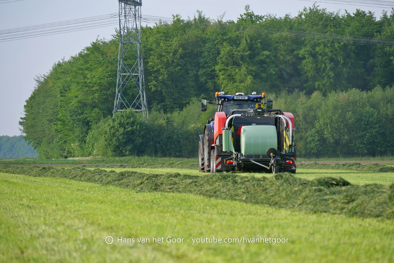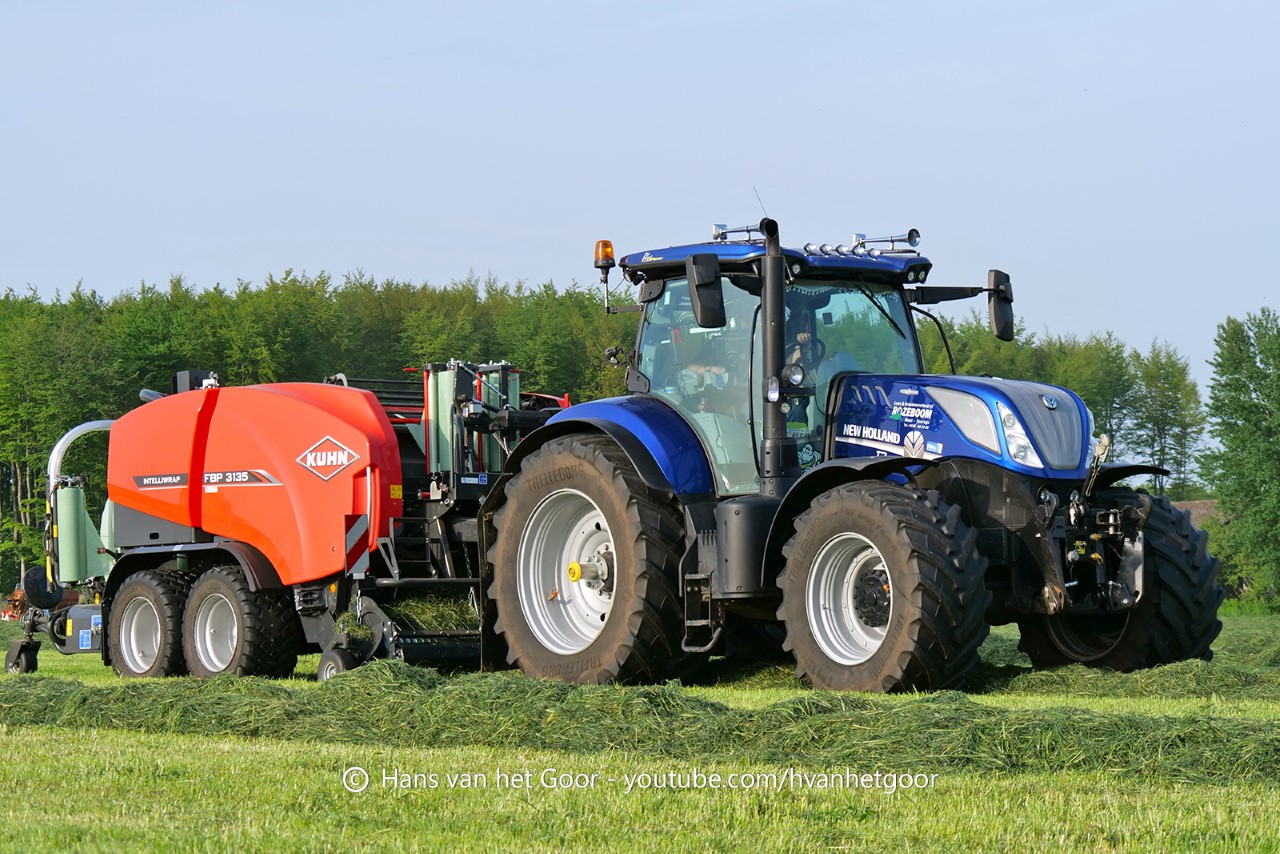 Balen persen en wikkelen bij een melkveehouderij in Dronten met de nieuwe Kuhn Intelliwrap FBP 3135 van loonbedrijf Rozeboom uit 't Harde. Voor de perswikkelcombinatie voor ronde balen staat een New Holland T7.230 Blue Power.