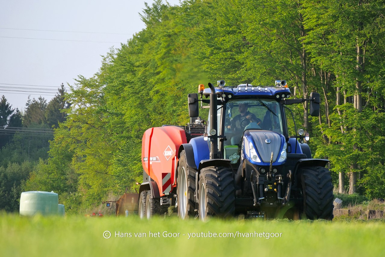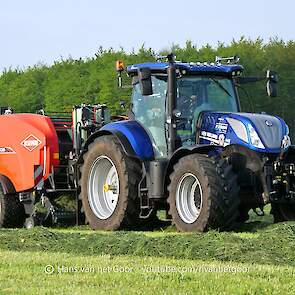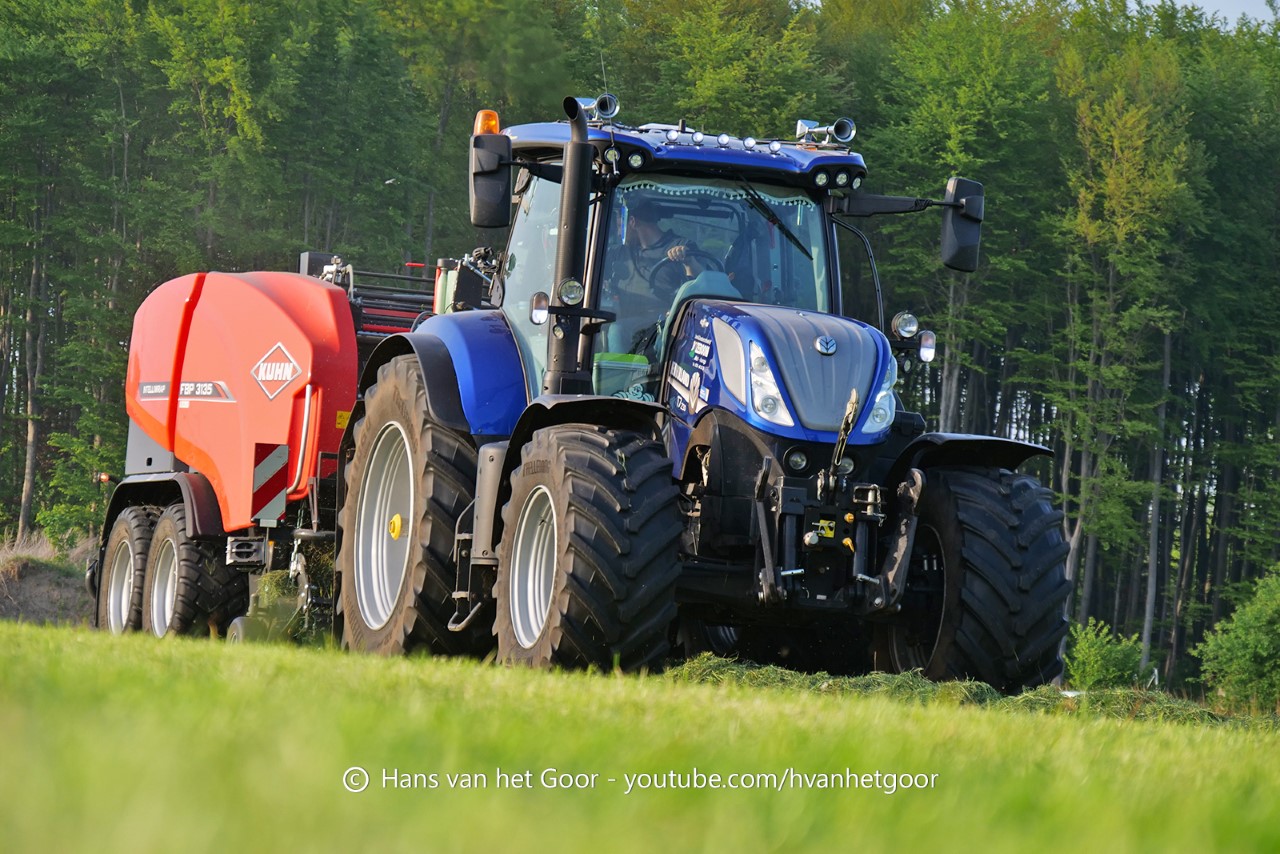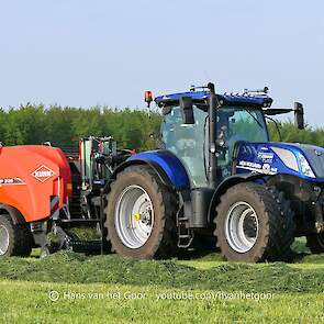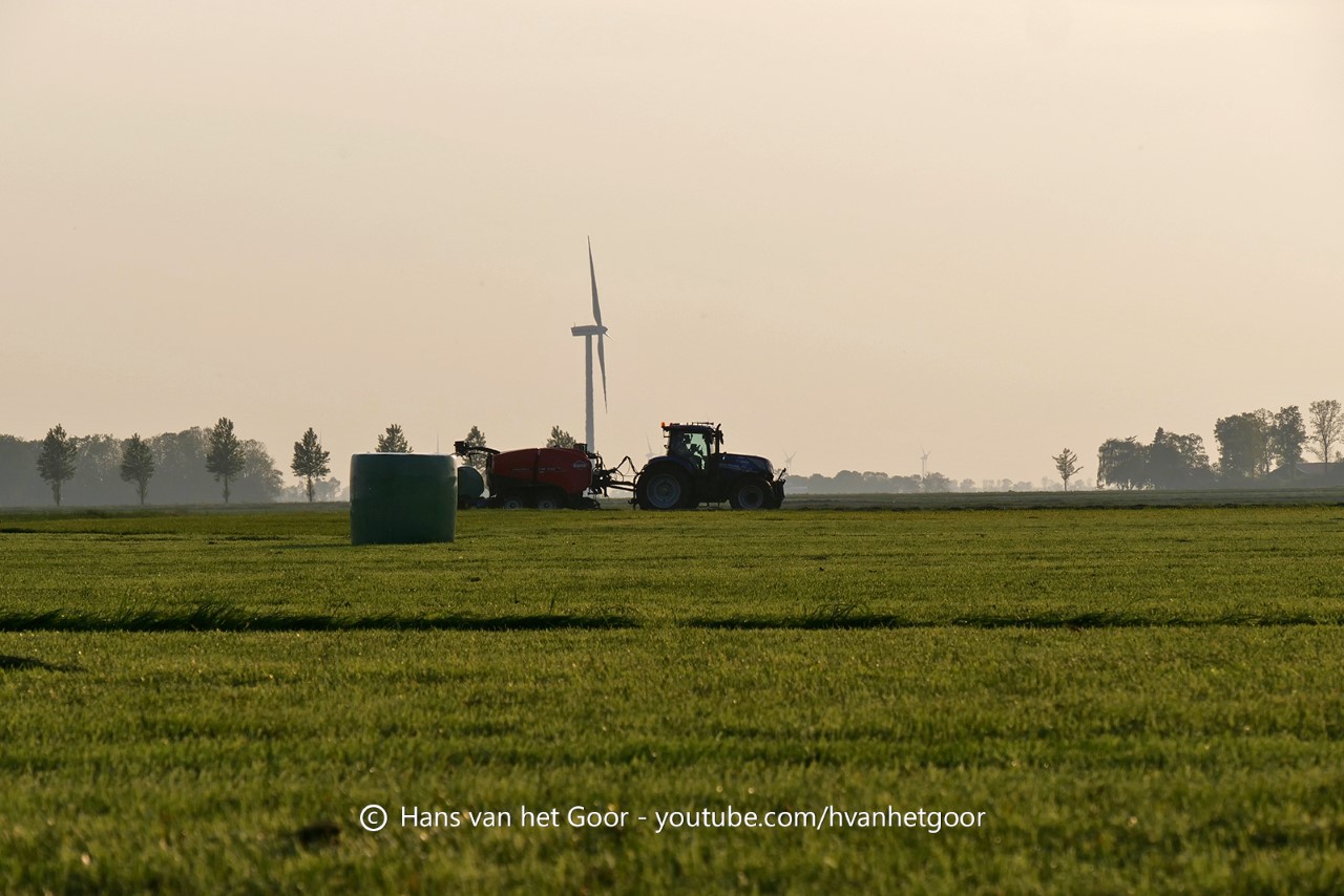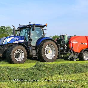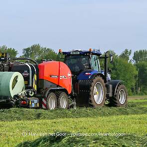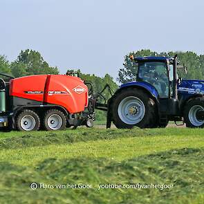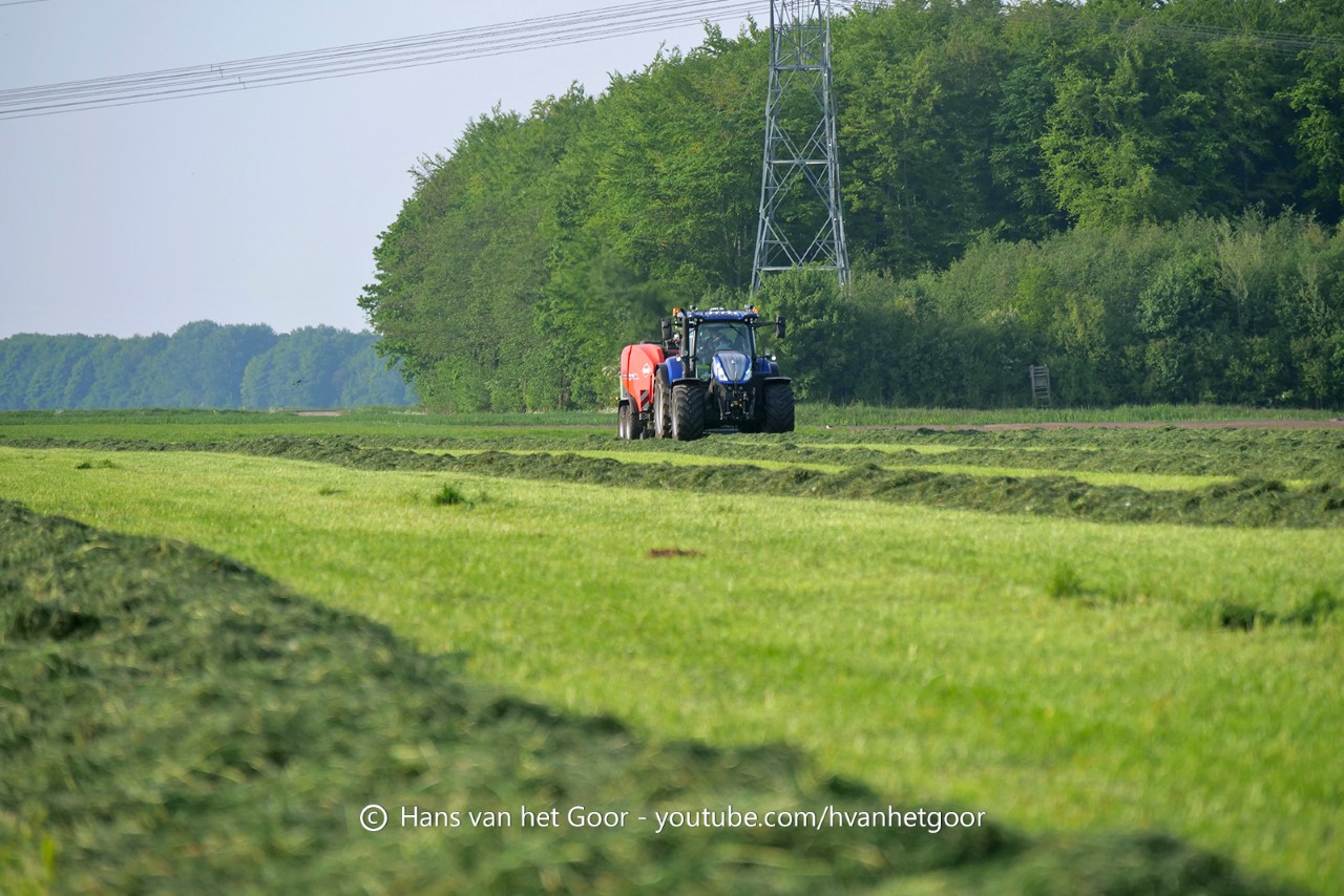 Balen persen en wikkelen bij een melkveehouderij in Dronten met de nieuwe Kuhn Intelliwrap FBP 3135 van loonbedrijf Rozeboom uit 't Harde. Voor de perswikkelcombinatie voor ronde balen staat een New Holland T7.230 Blue Power.