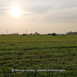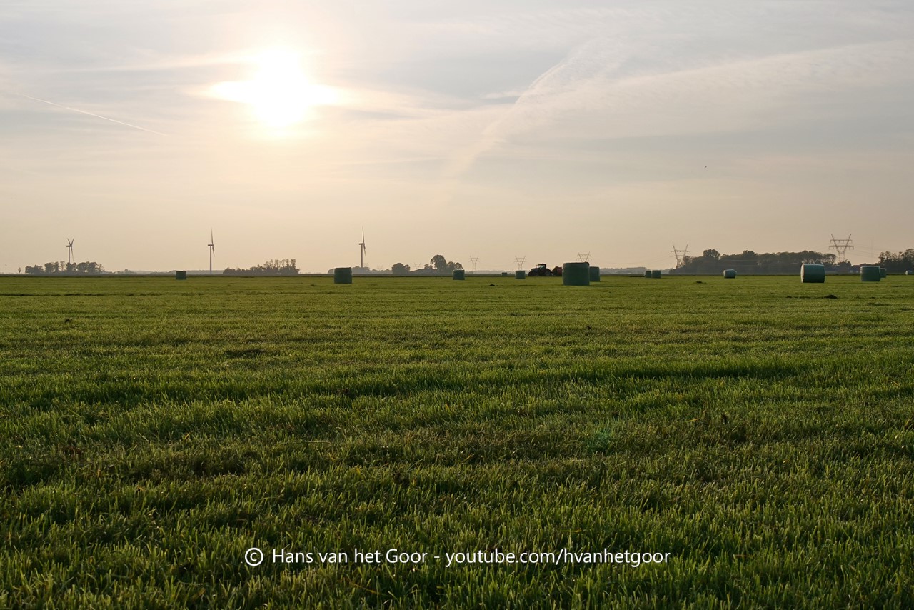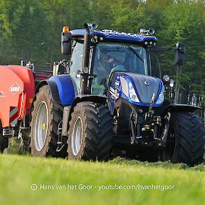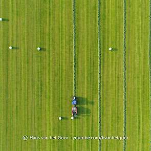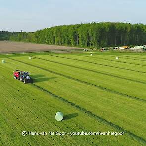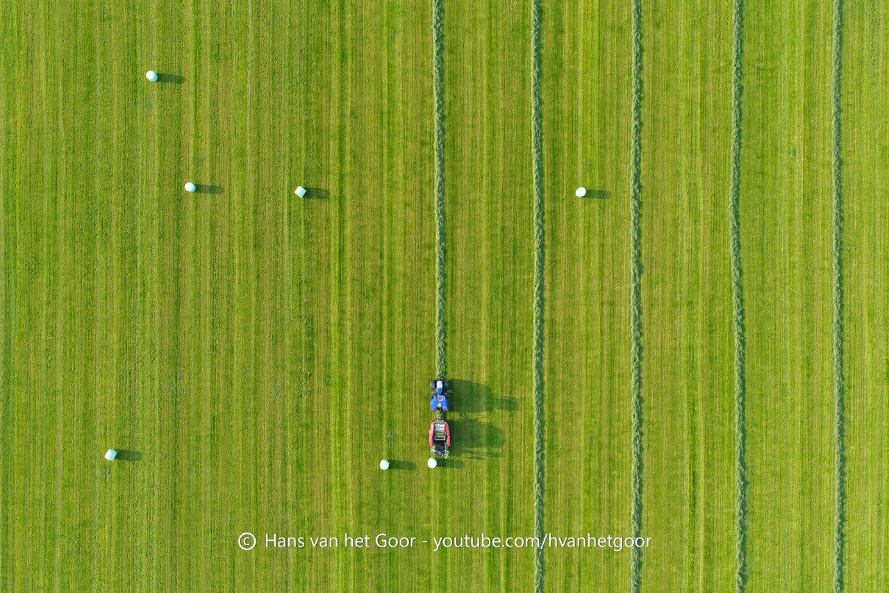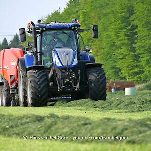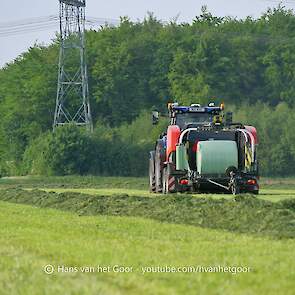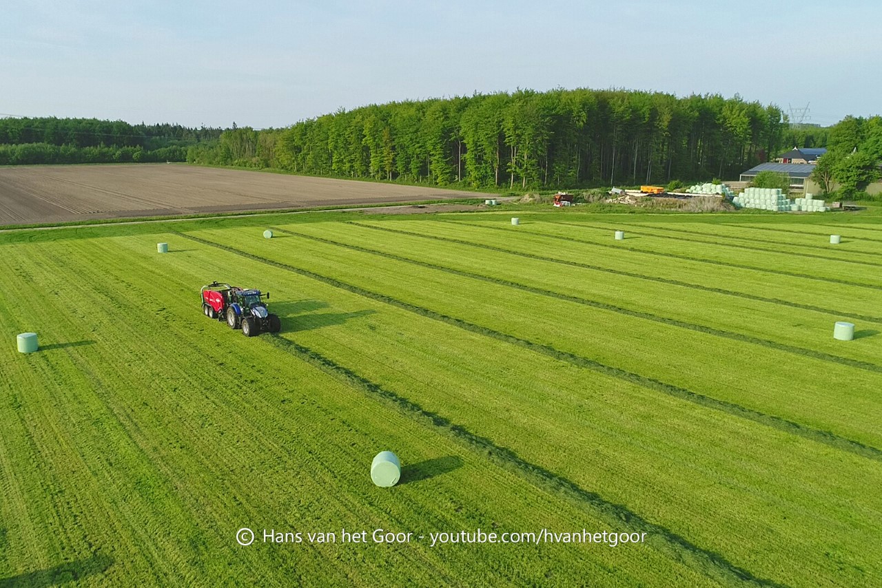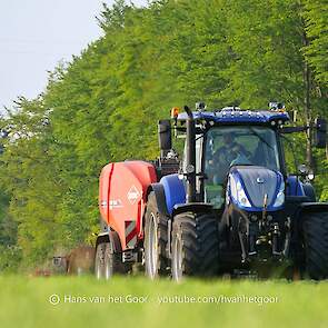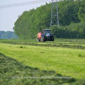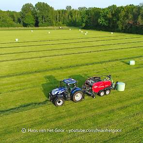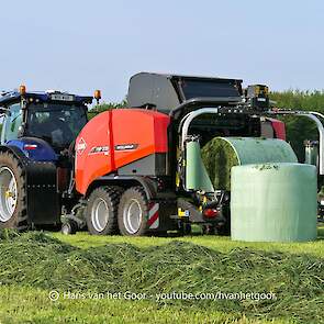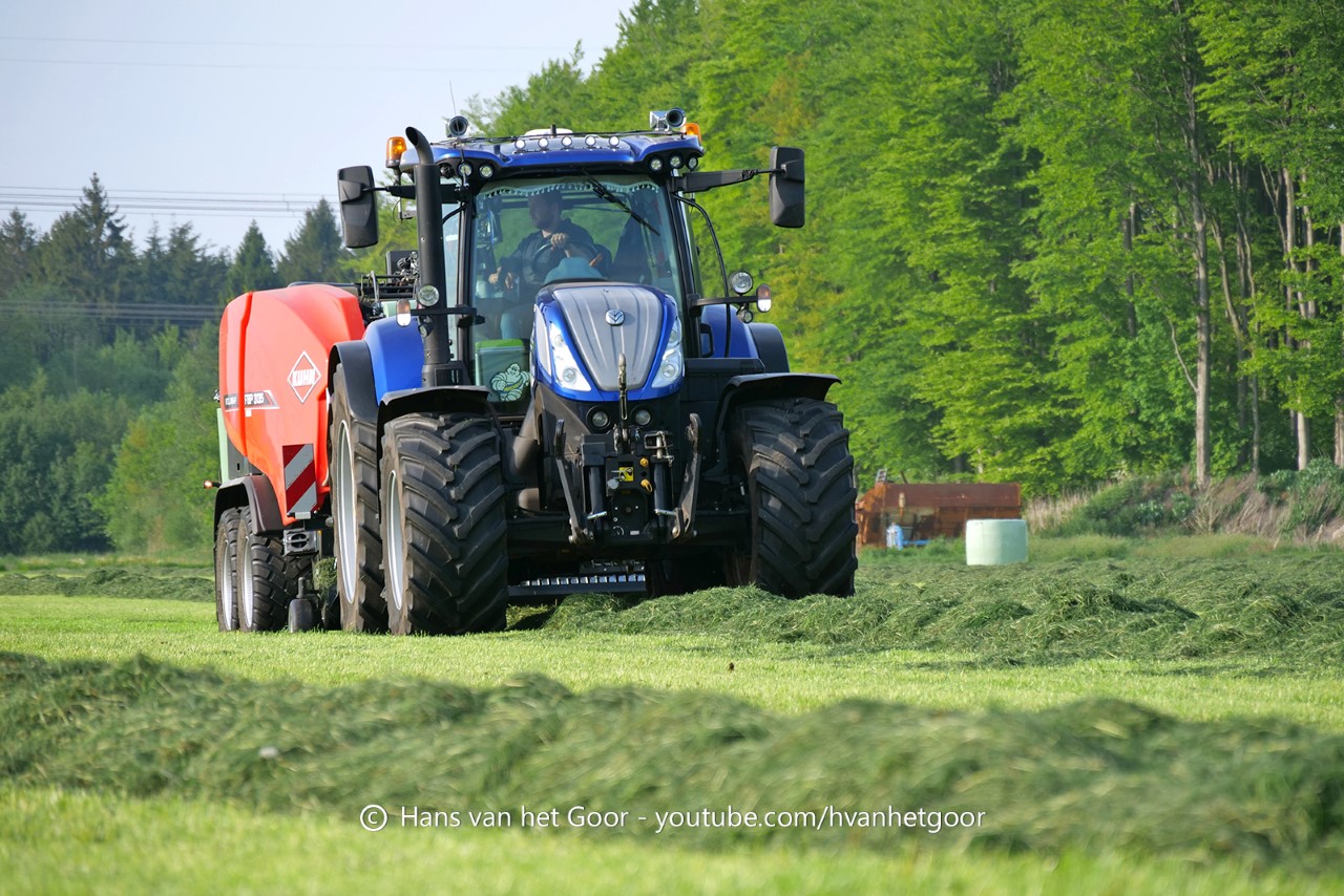 Balen persen en wikkelen bij een melkveehouderij in Dronten met de nieuwe Kuhn Intelliwrap FBP 3135 van loonbedrijf Rozeboom uit 't Harde. Voor de perswikkelcombinatie voor ronde balen staat een New Holland T7.230 Blue Power.