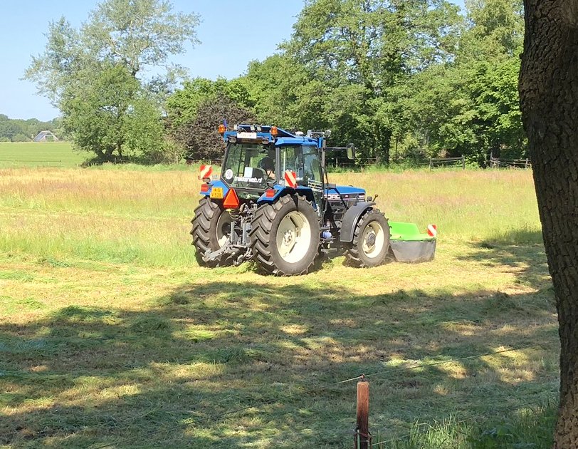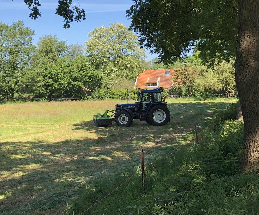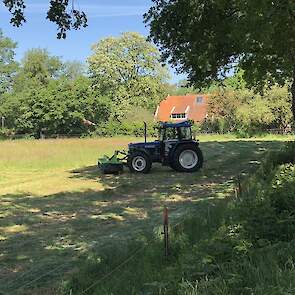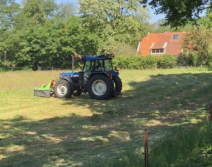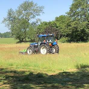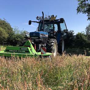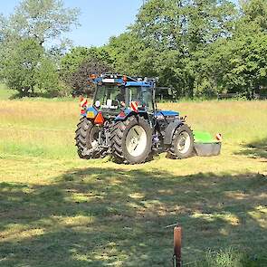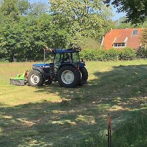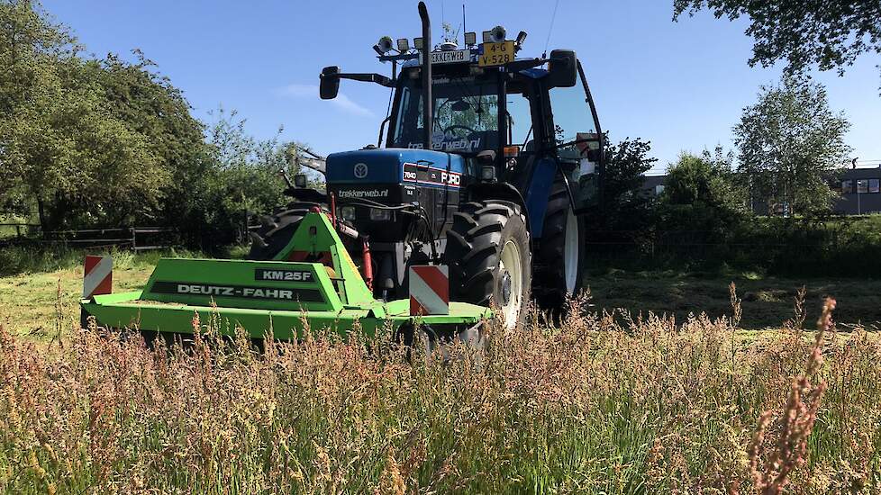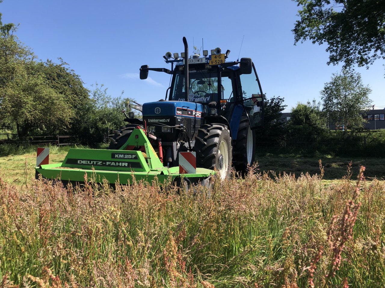Een Ford 7840 SLE met een Deutz Fahr KM25F-frontmaaier aan het gras maaien.