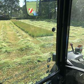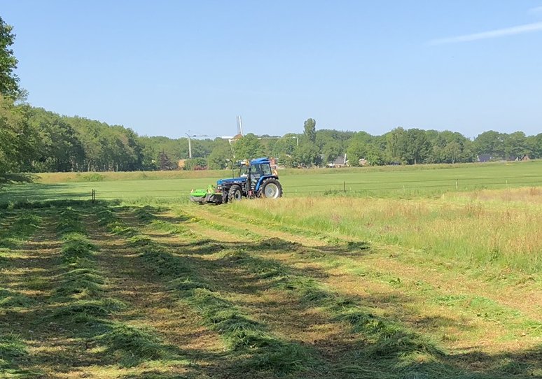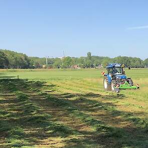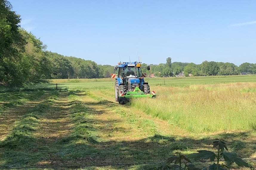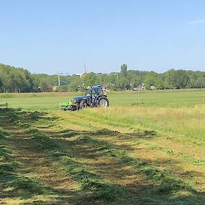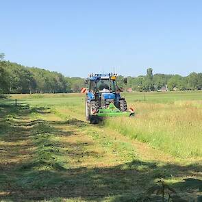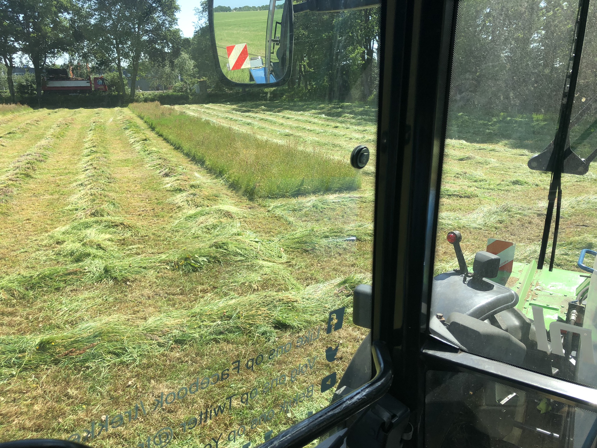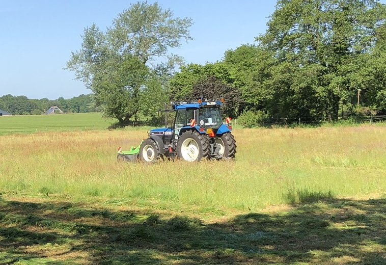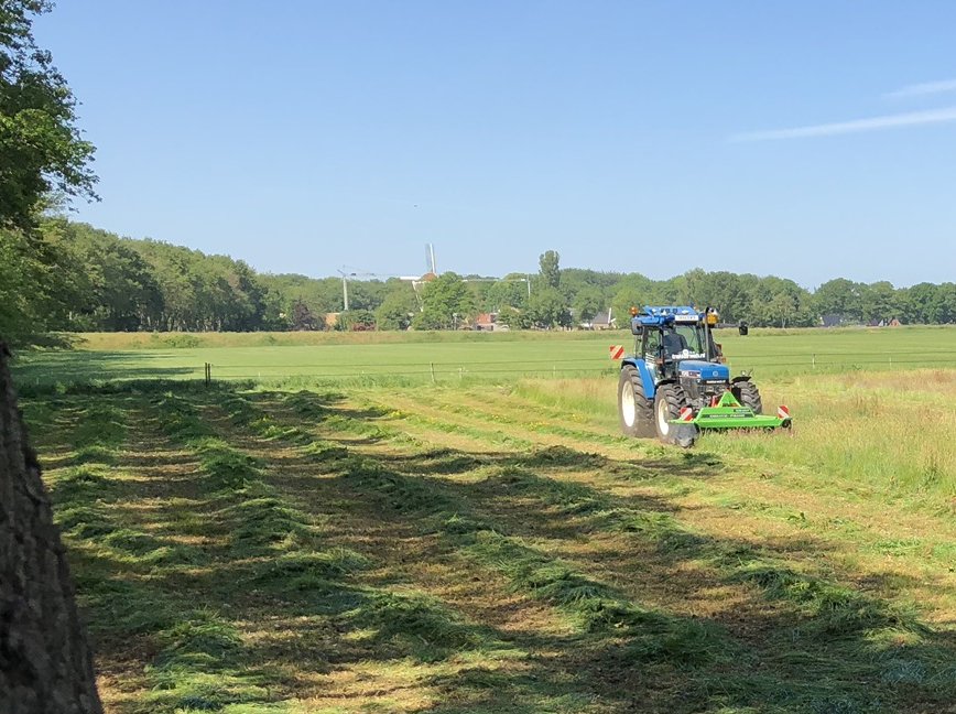Een Ford 7840 SLE met een Deutz Fahr KM25F-frontmaaier aan het gras maaien.