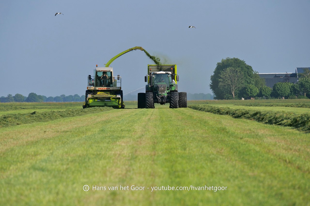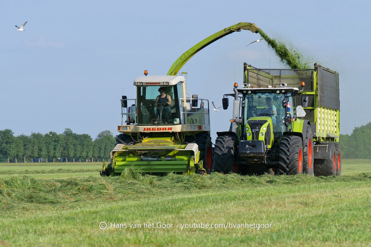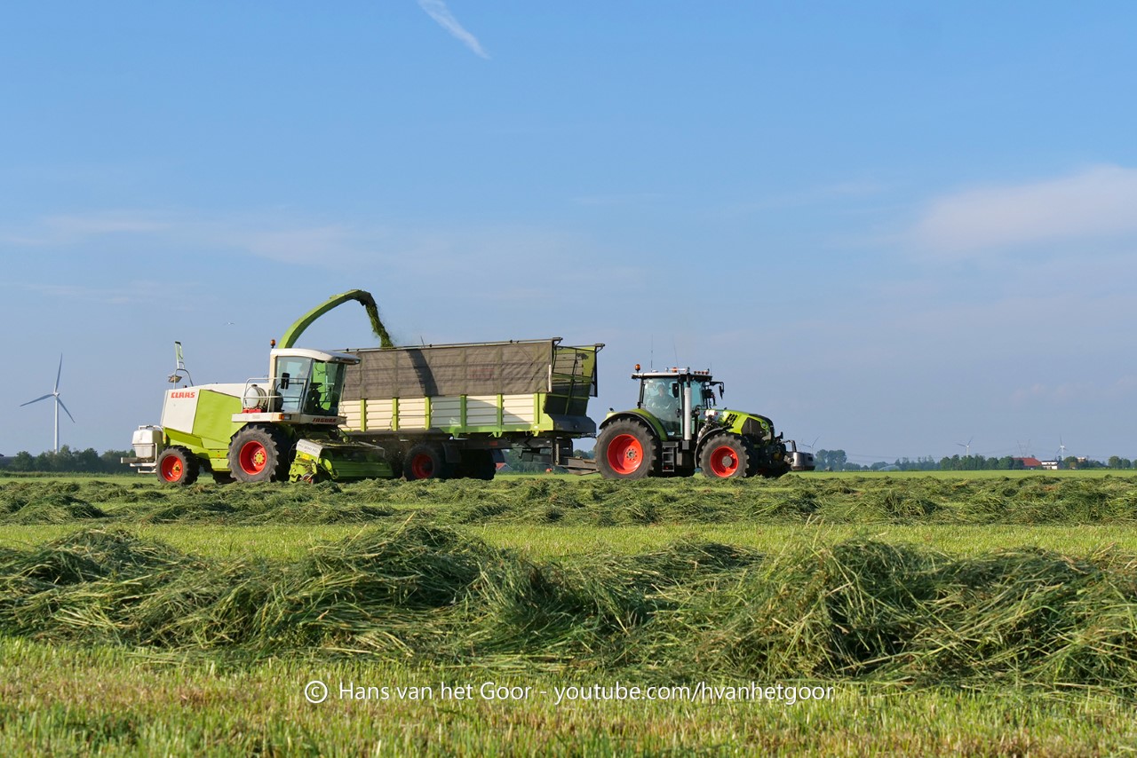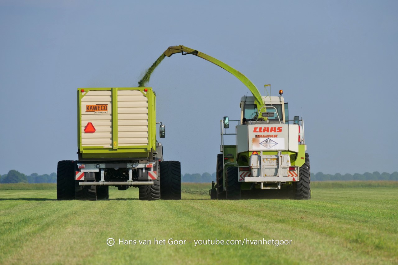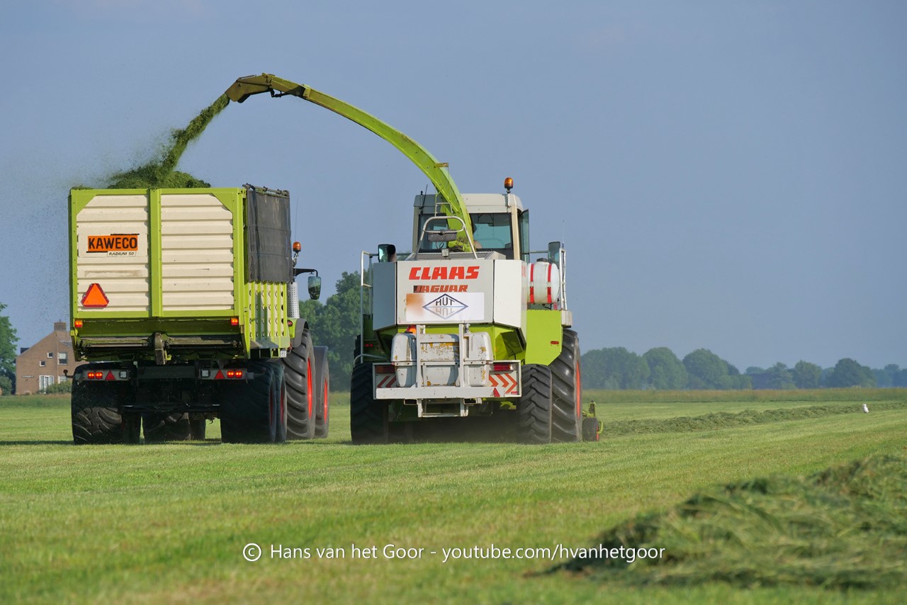 Tweede snede gras hakselen door loonbedrijf Hut bij melkveehouderij van Veelen Holsteins in Biddinghuizen. We zien een Claas Jaguar 860-veldhakselaar en een Fendt 822 met nieuwe Kaweco Radium 250 met uitschuifas van het loonbedrijf. De twee Claas Arion 650-trekkers met Kaweco Radium 50-silagewagens zijn van het melkveebedrijf.