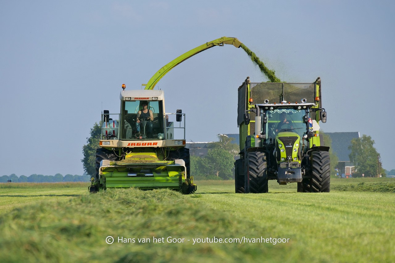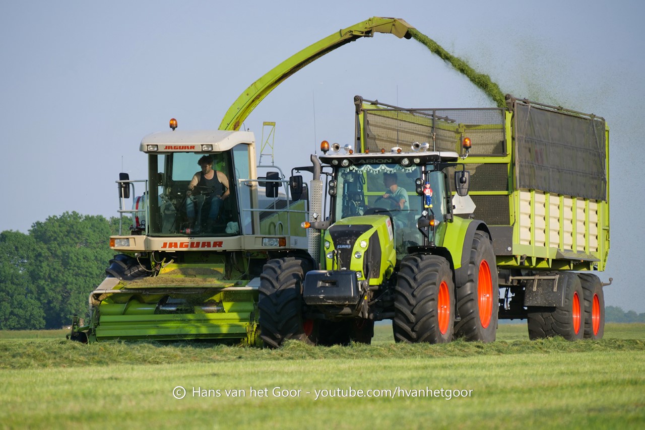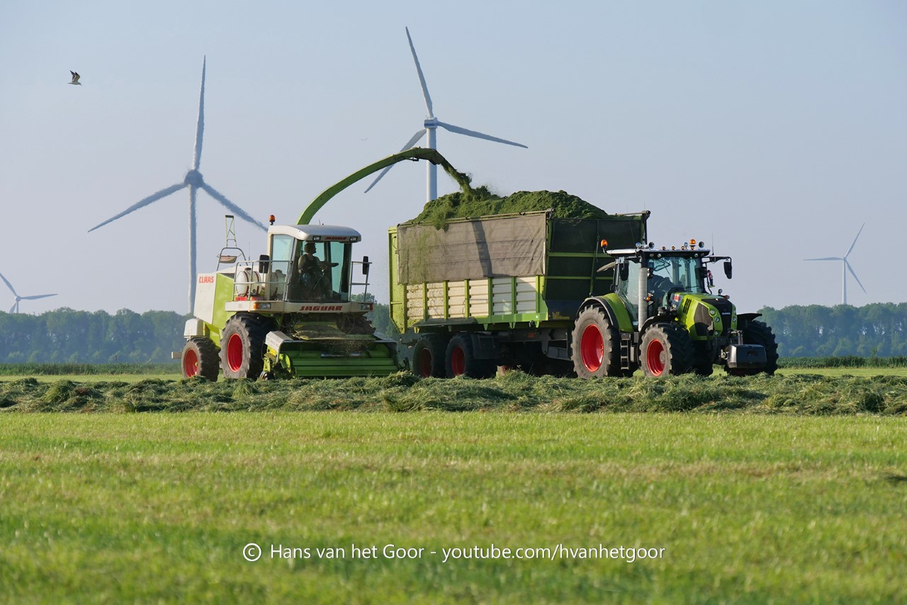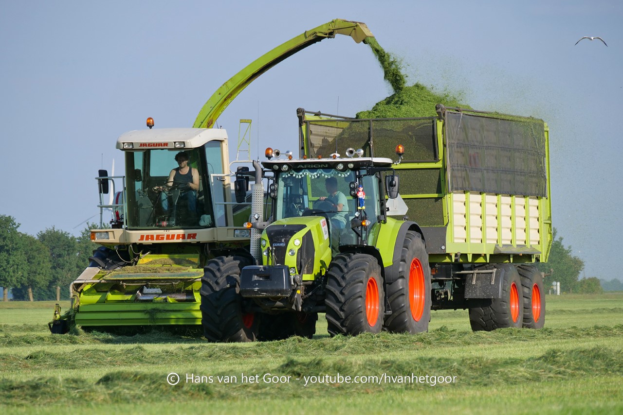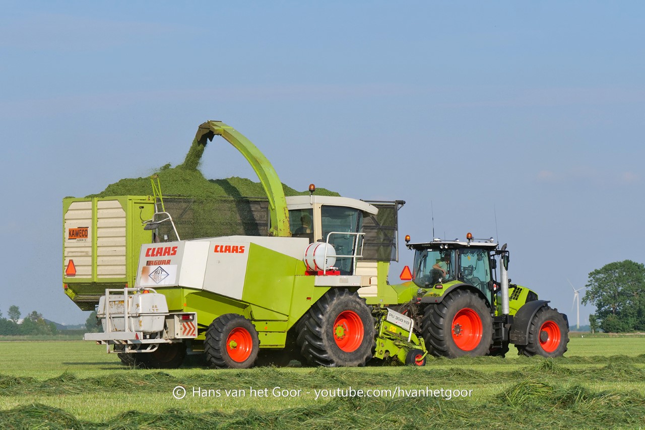Tweede snede gras hakselen door loonbedrijf Hut bij melkveehouderij van Veelen Holsteins in Biddinghuizen. We zien een Claas Jaguar 860-veldhakselaar en een Fendt 822 met nieuwe Kaweco Radium 250 met uitschuifas van het loonbedrijf. De twee Claas Arion 650-trekkers met Kaweco Radium 50-silagewagens zijn van het melkveebedrijf.