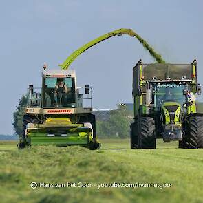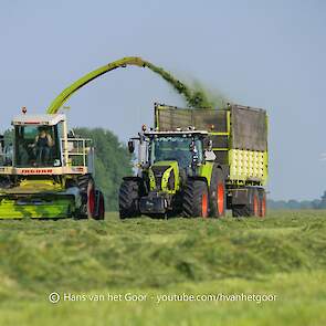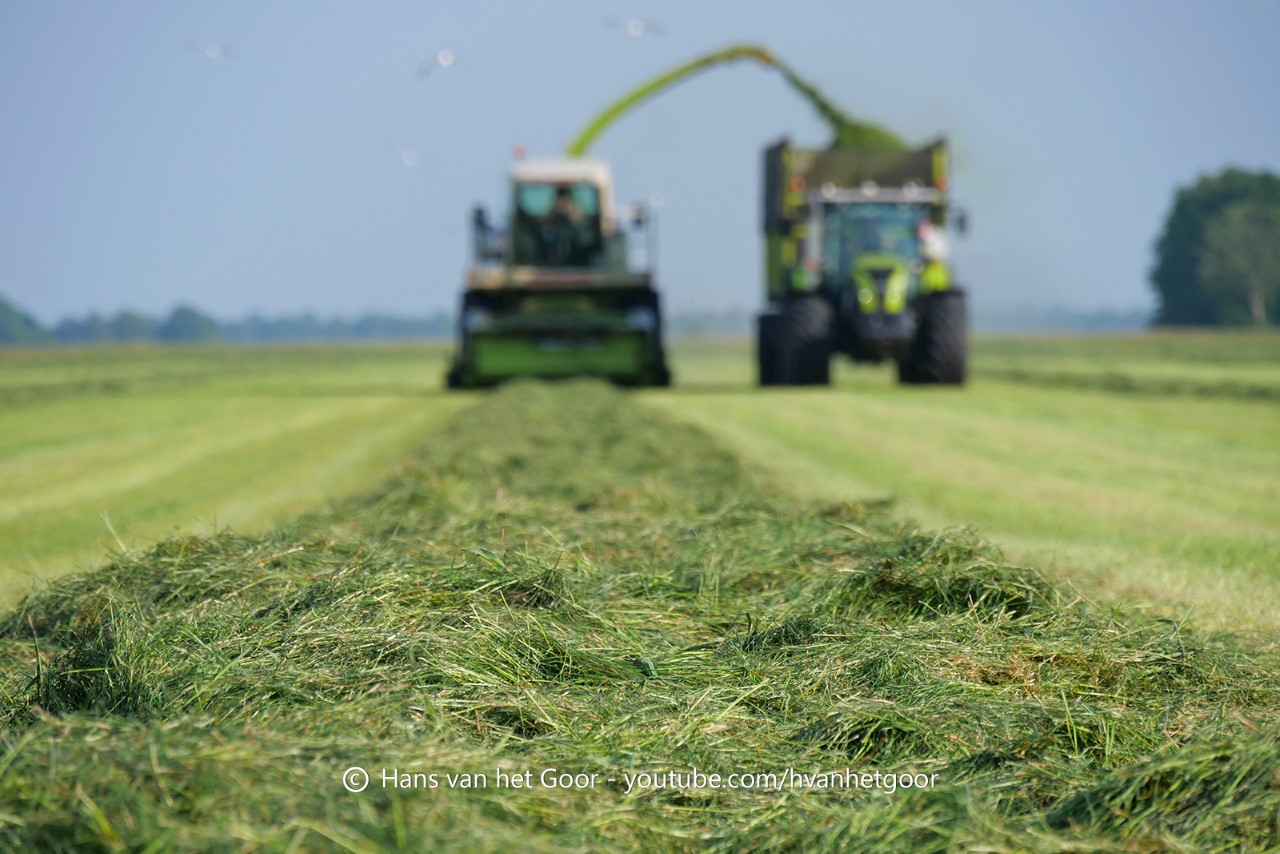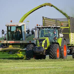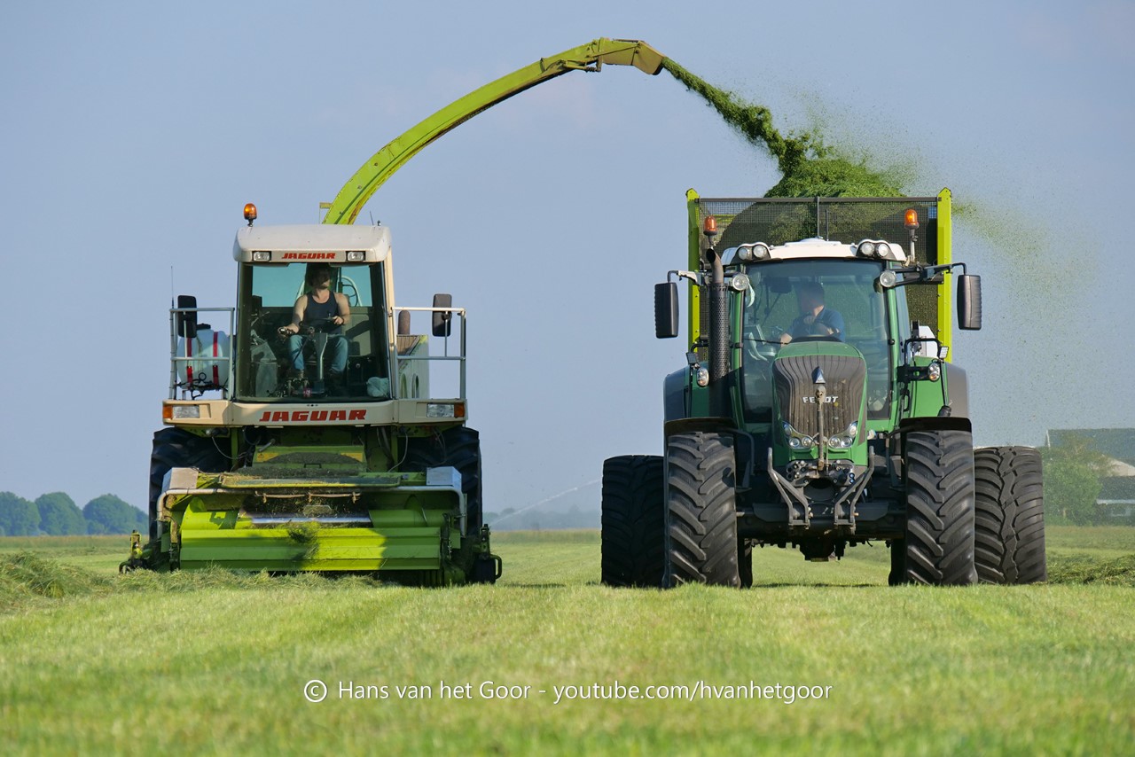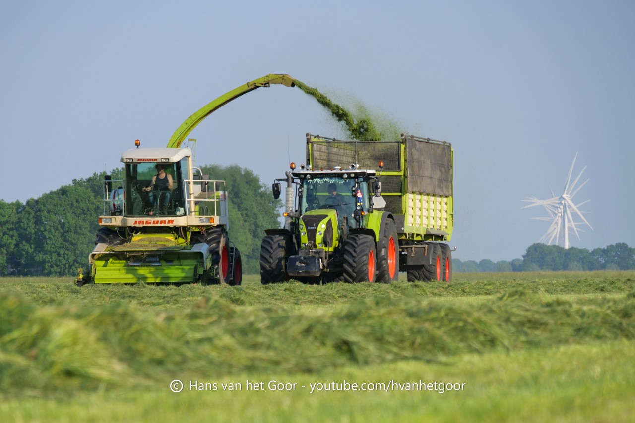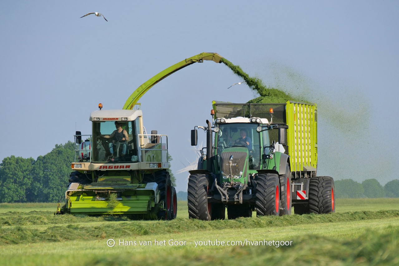 Tweede snede gras hakselen door loonbedrijf Hut bij melkveehouderij van Veelen Holsteins in Biddinghuizen. We zien een Claas Jaguar 860-veldhakselaar en een Fendt 822 met nieuwe Kaweco Radium 250 met uitschuifas van het loonbedrijf. De twee Claas Arion 650-trekkers met Kaweco Radium 50-silagewagens zijn van het melkveebedrijf.