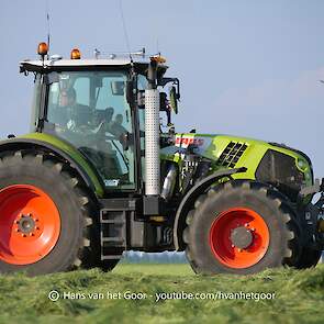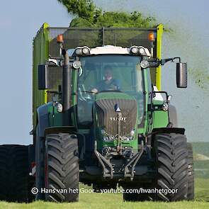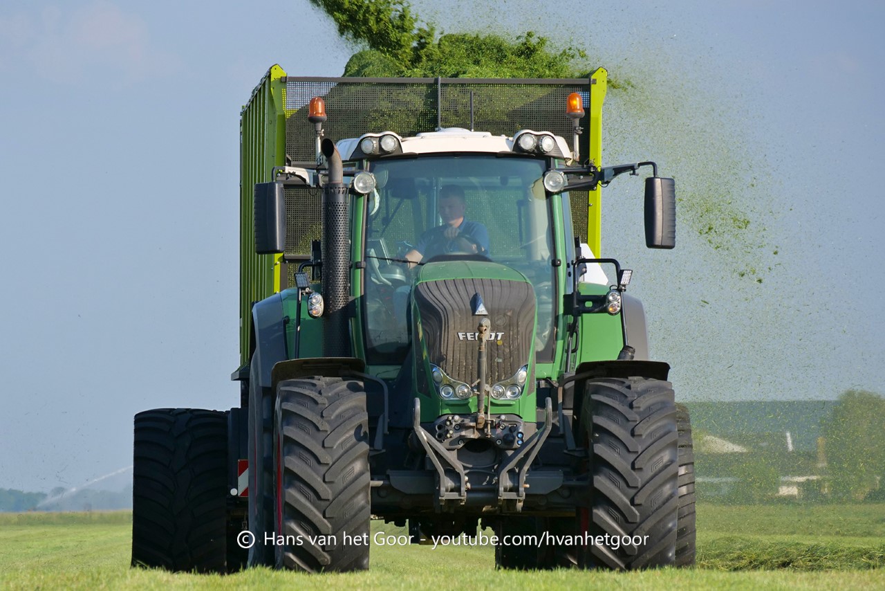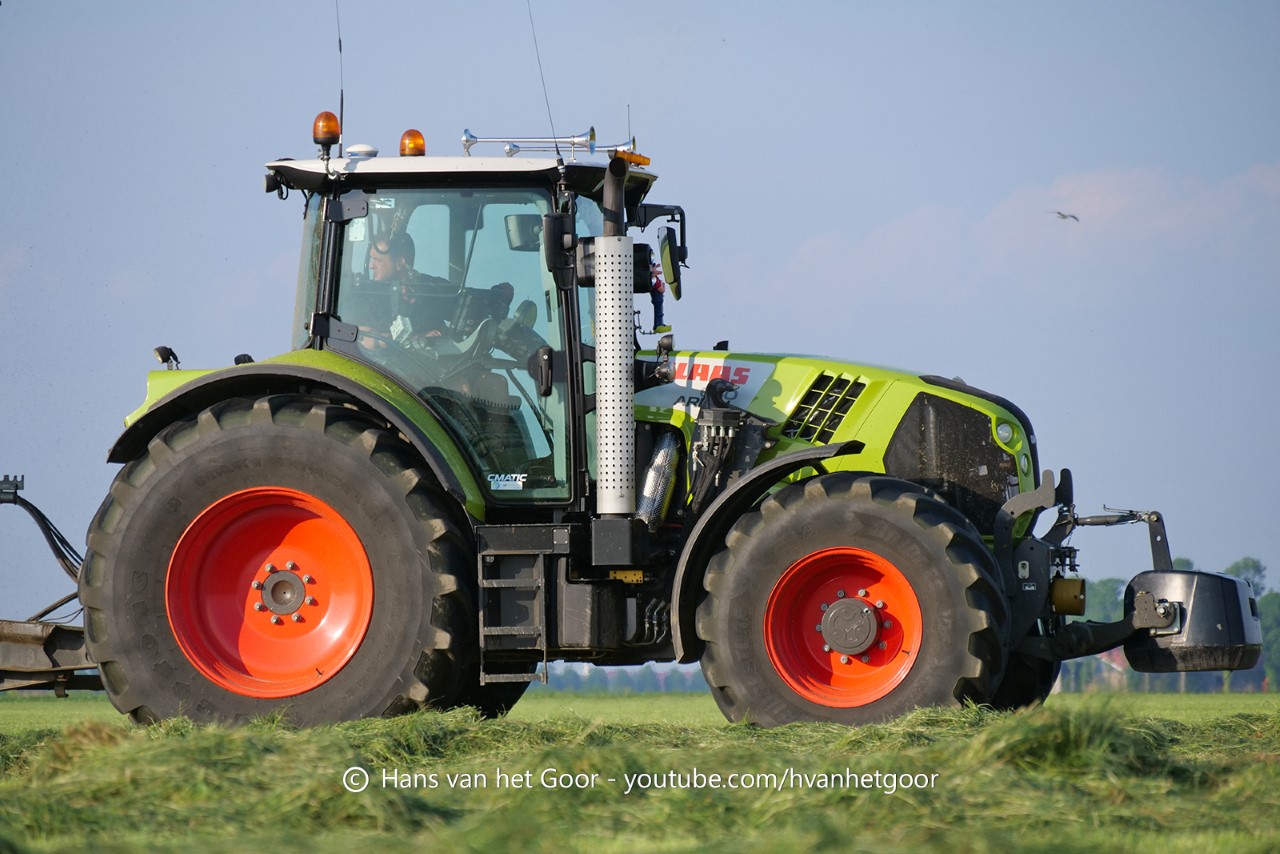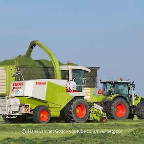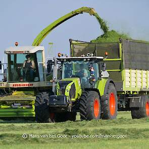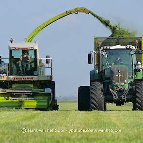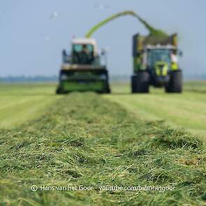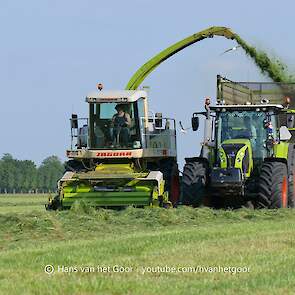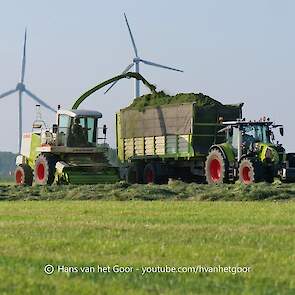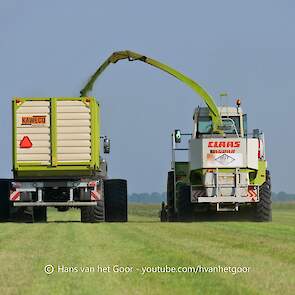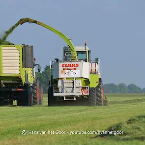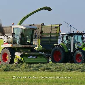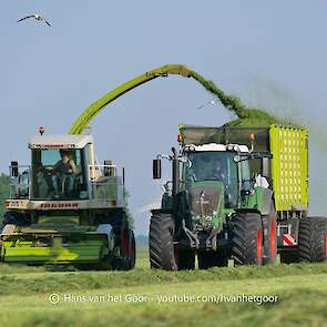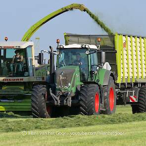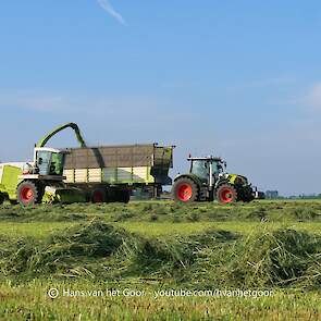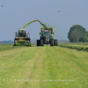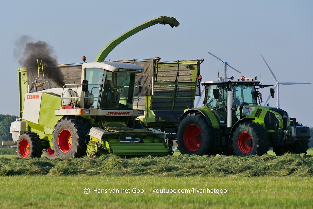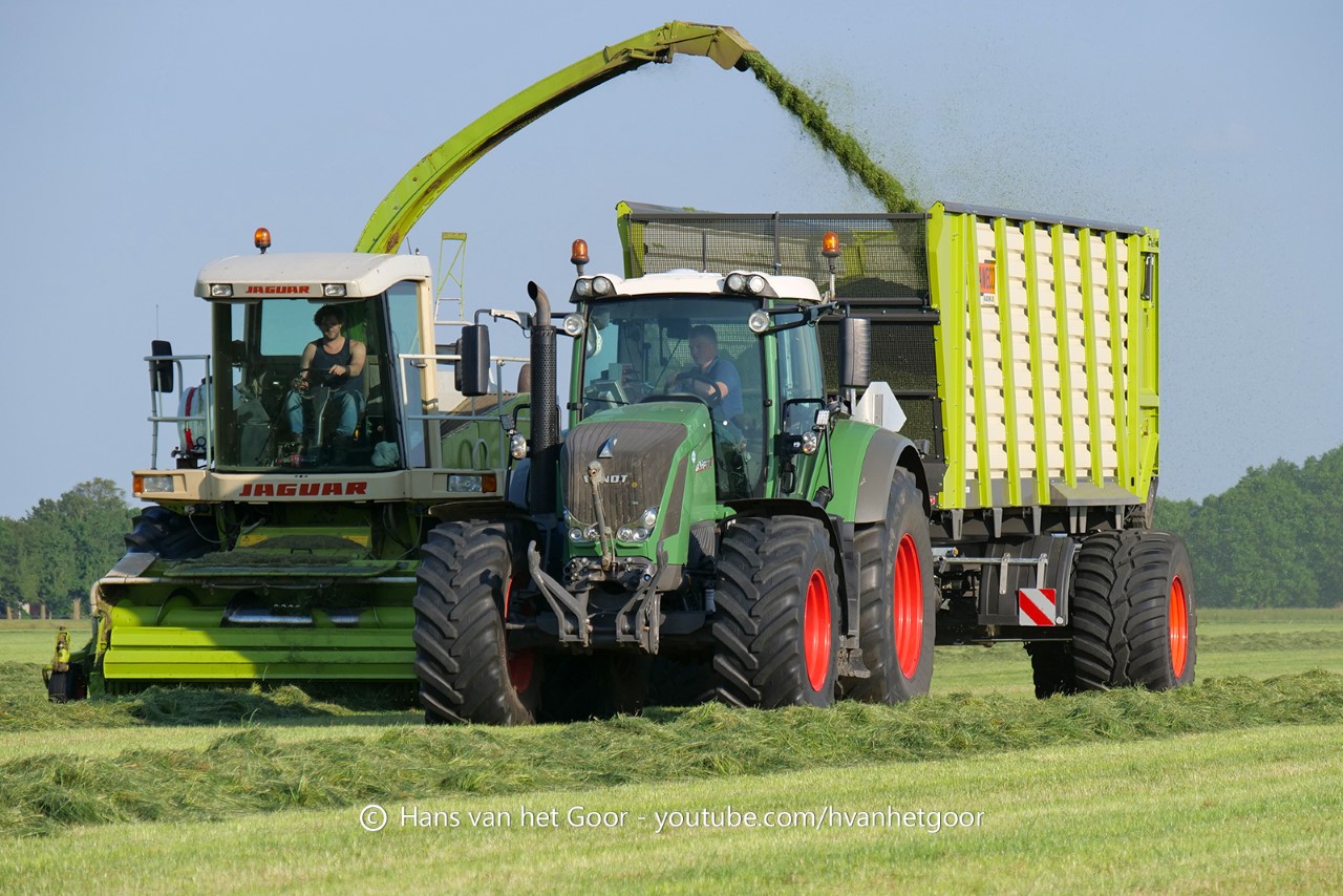 Tweede snede gras hakselen door loonbedrijf Hut bij melkveehouderij van Veelen Holsteins in Biddinghuizen. We zien een Claas Jaguar 860-veldhakselaar en een Fendt 822 met nieuwe Kaweco Radium 250 met uitschuifas van het loonbedrijf. De twee Claas Arion 650-trekkers met Kaweco Radium 50-silagewagens zijn van het melkveebedrijf.