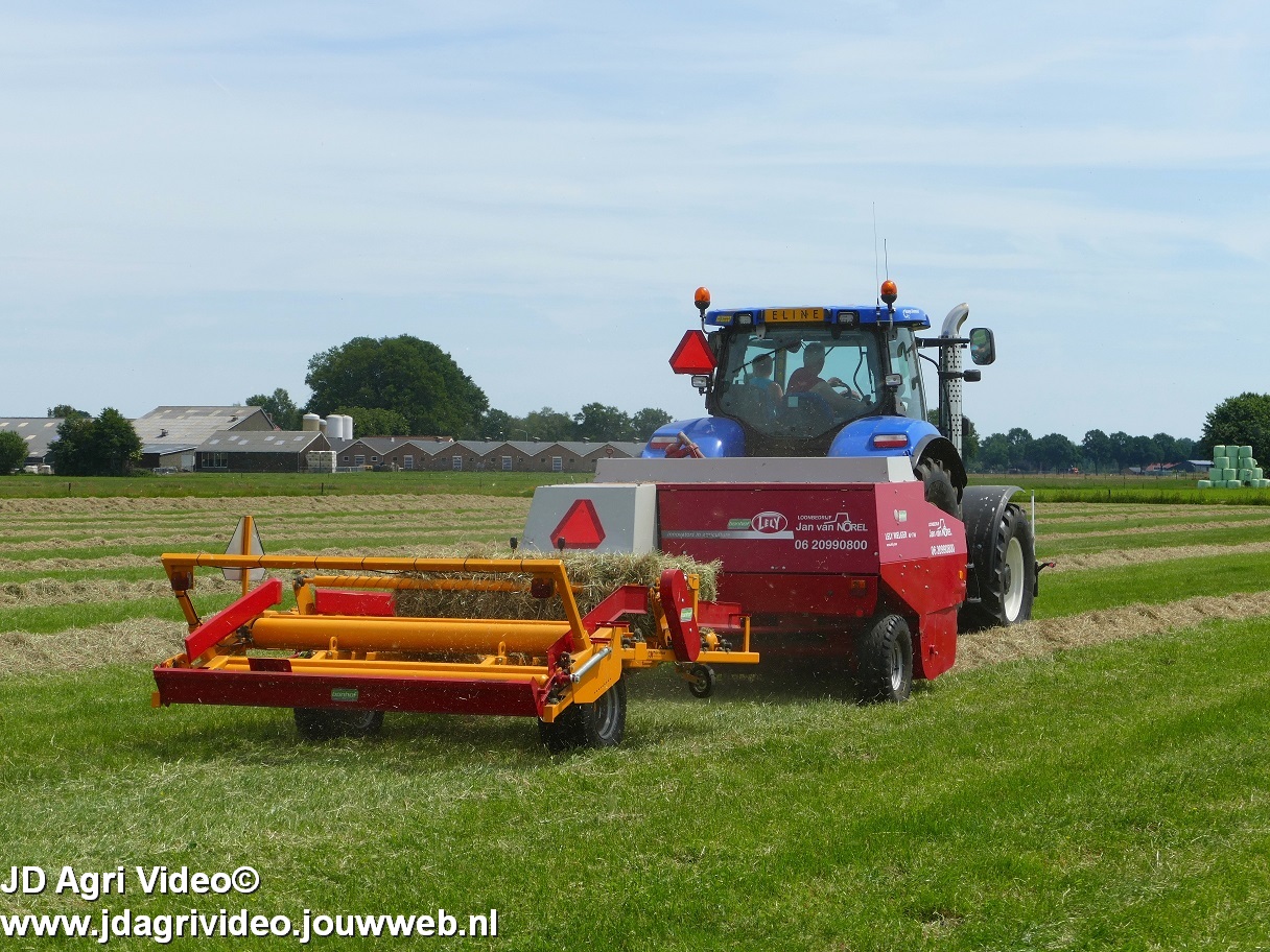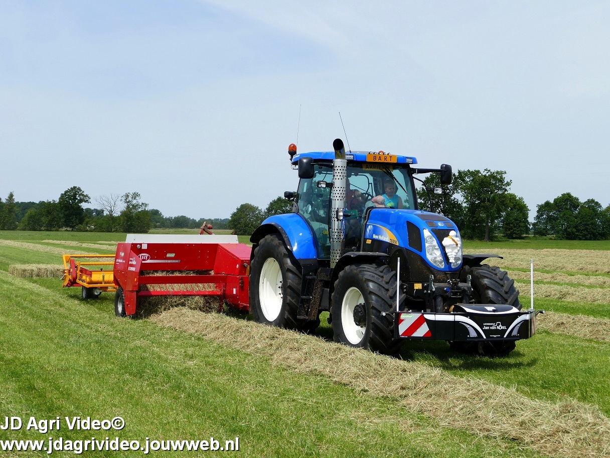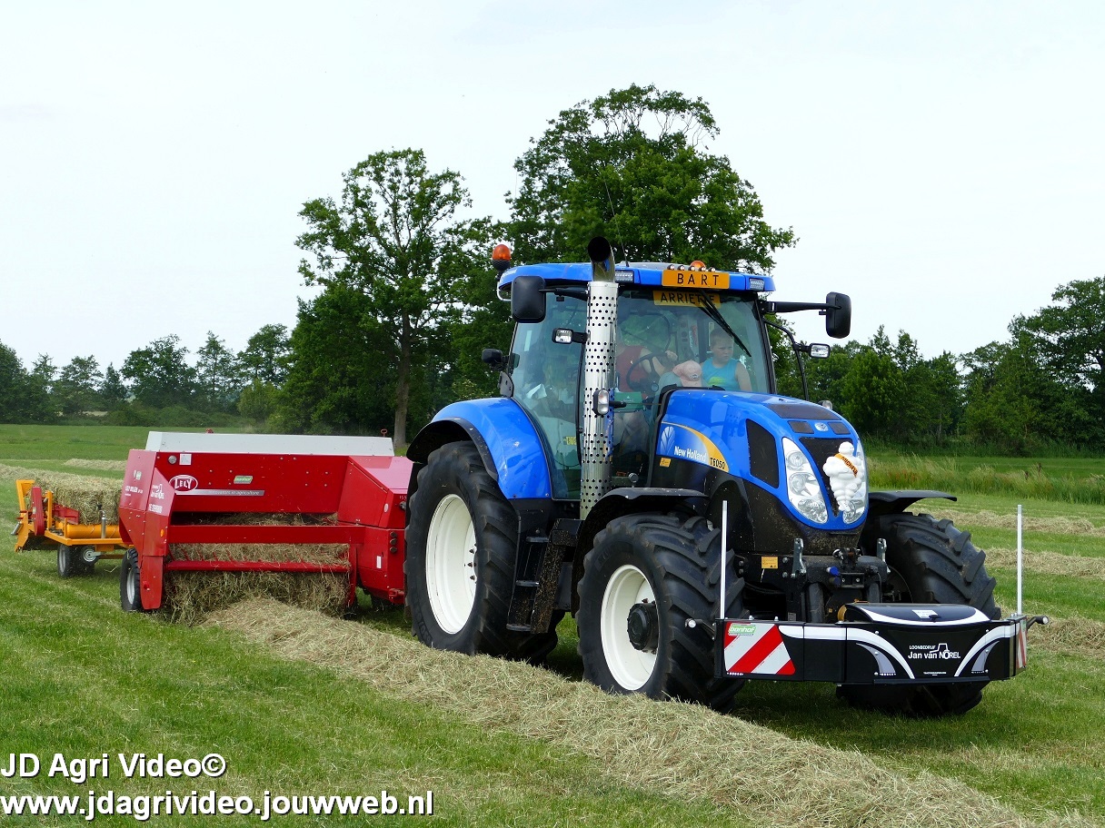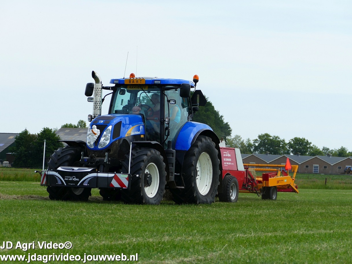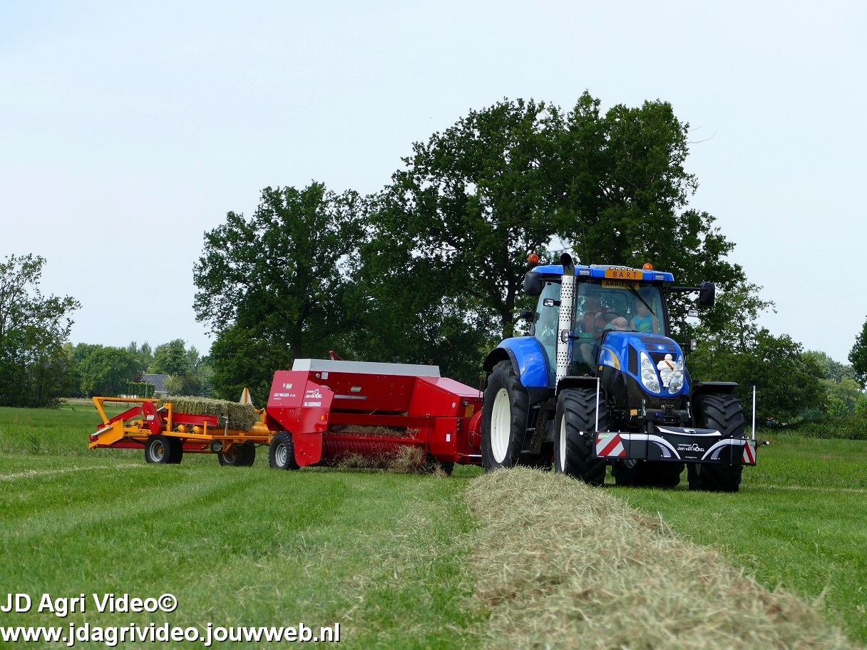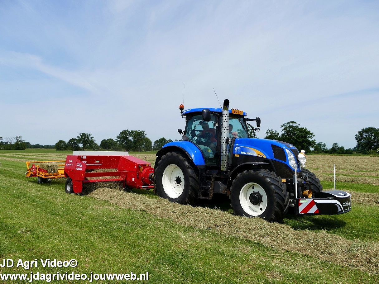 Loonbedrijf Jan van Norel uit Doornspijk (GD) aan het hooibalen persen met een New Holland T6050, een Lely Welger AP730-pers en een Meijer-verzamelwagen.