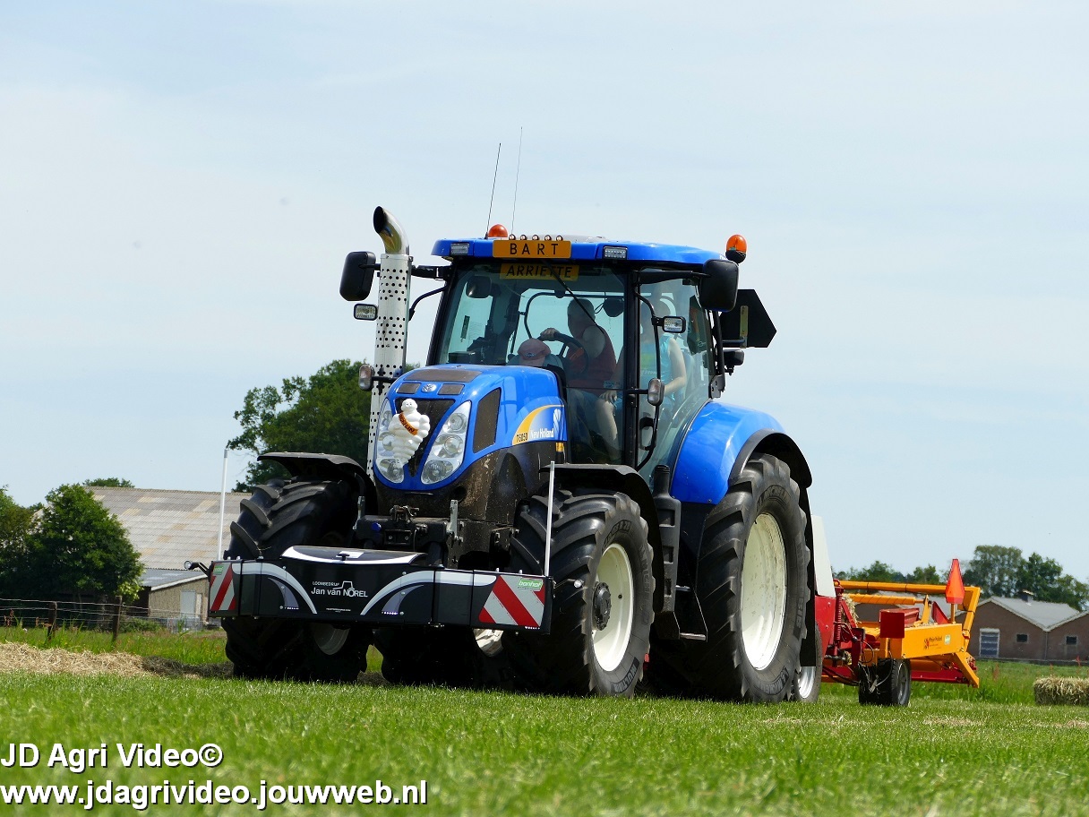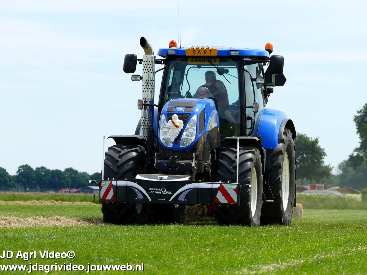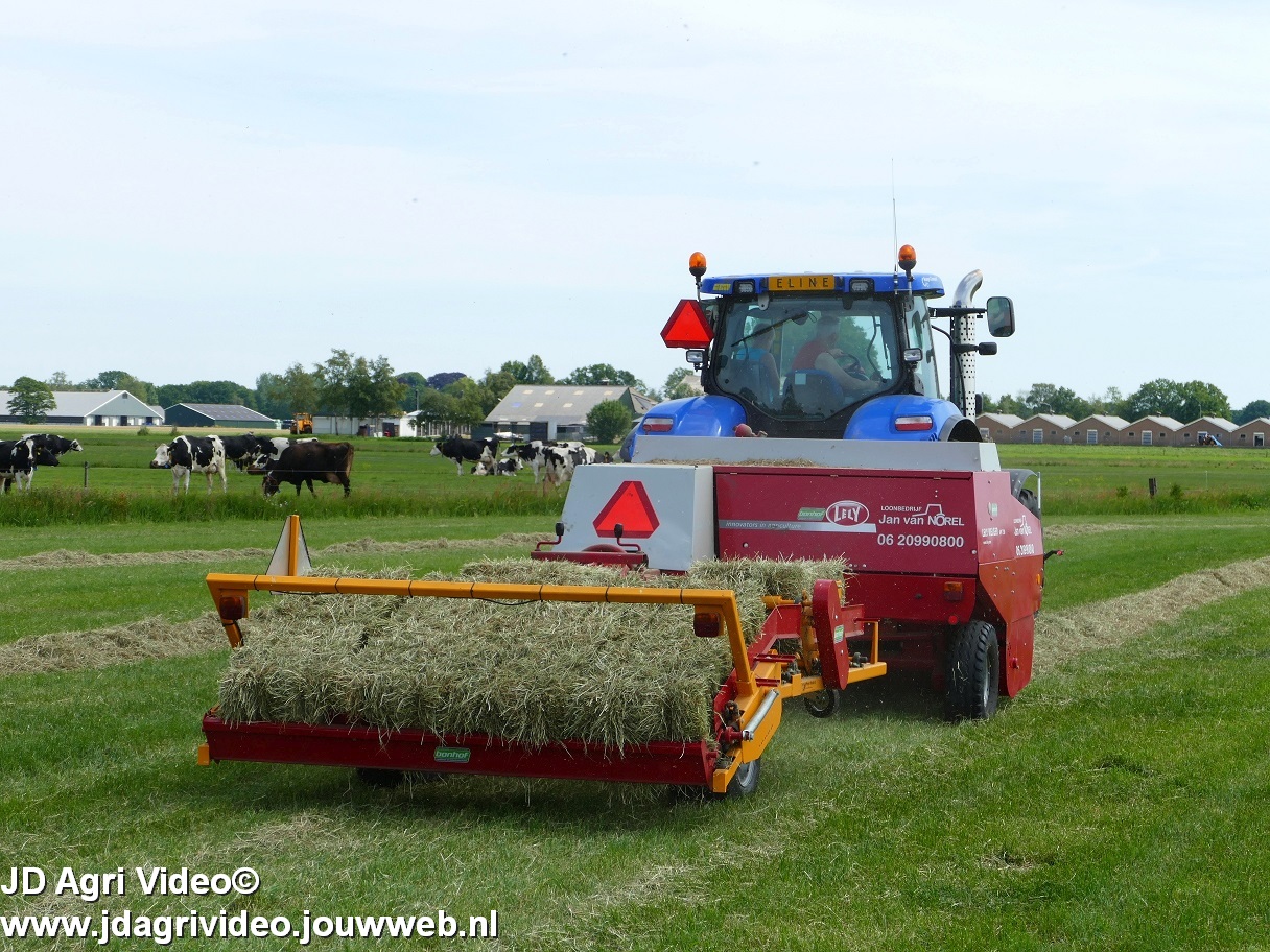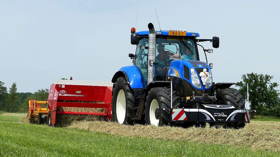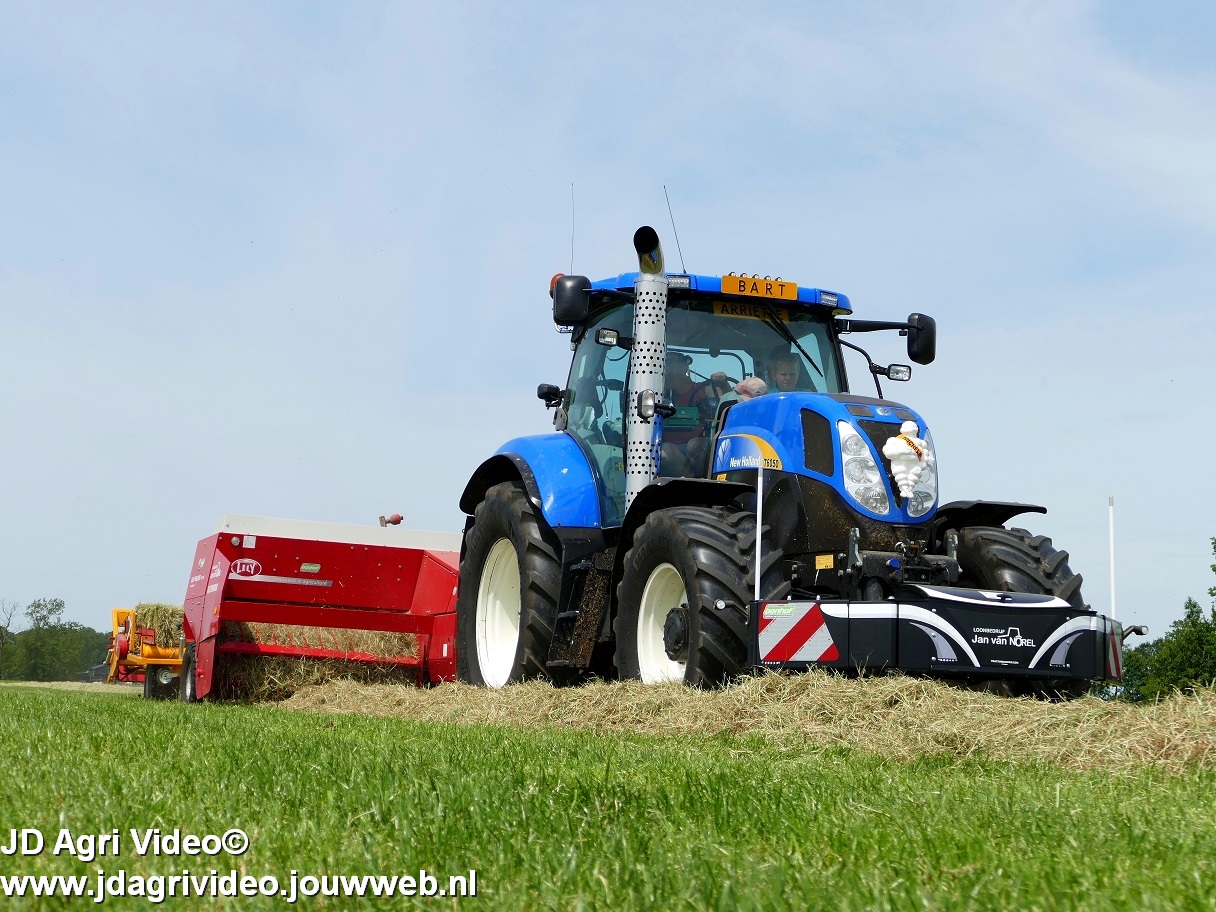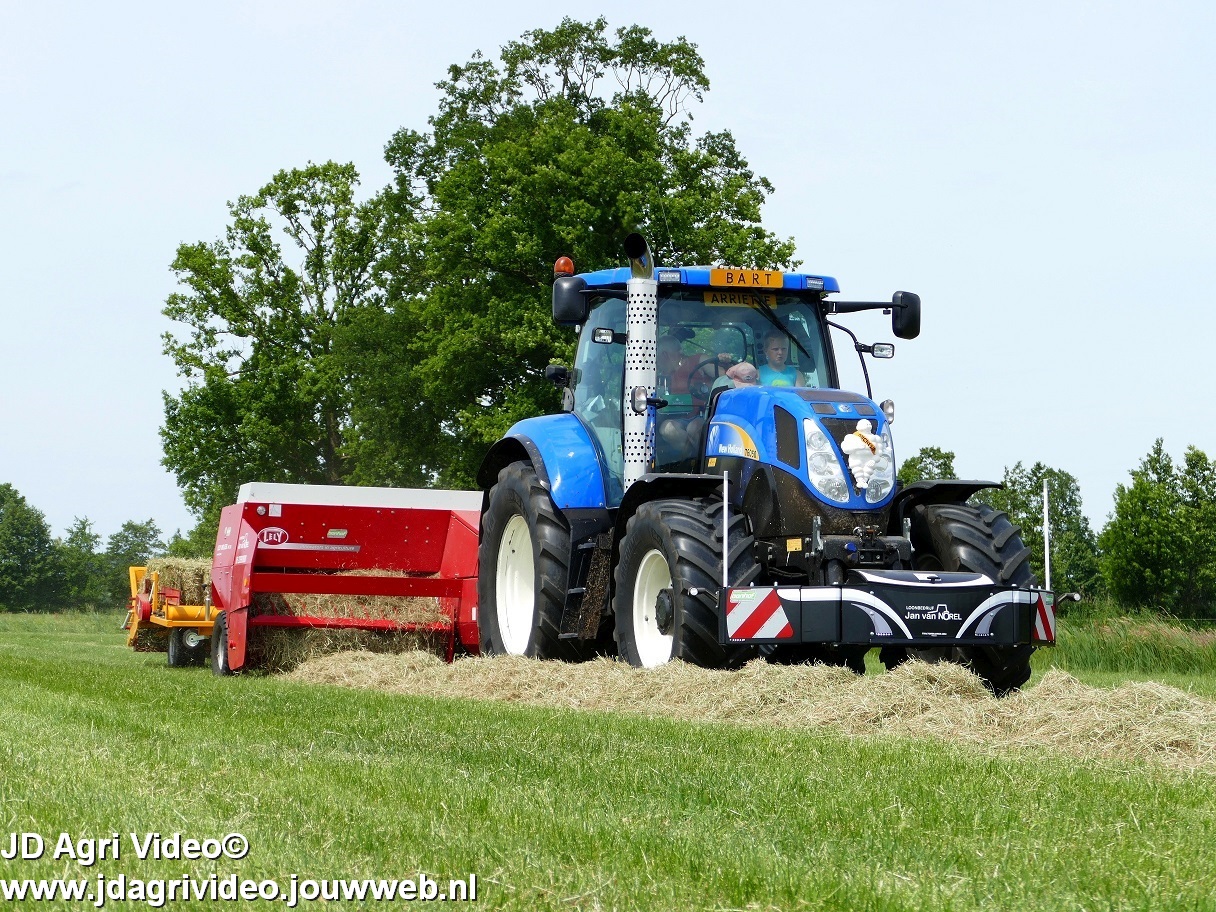 Loonbedrijf Jan van Norel uit Doornspijk (GD) aan het hooibalen persen met een New Holland T6050, een Lely Welger AP730-pers en een Meijer-verzamelwagen.