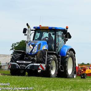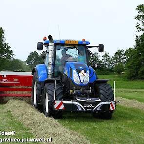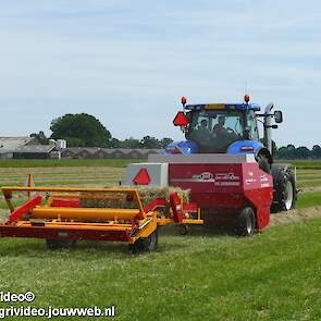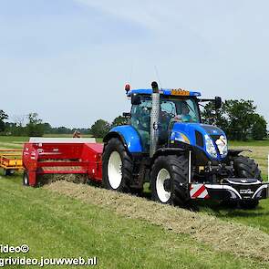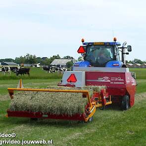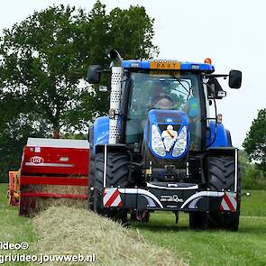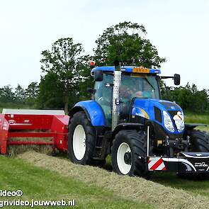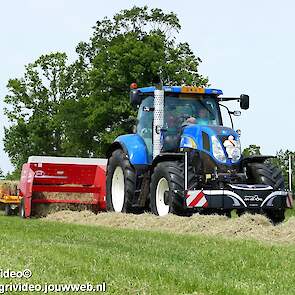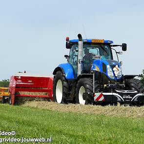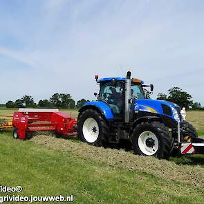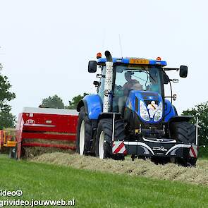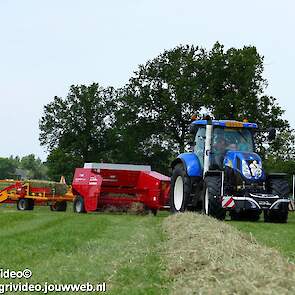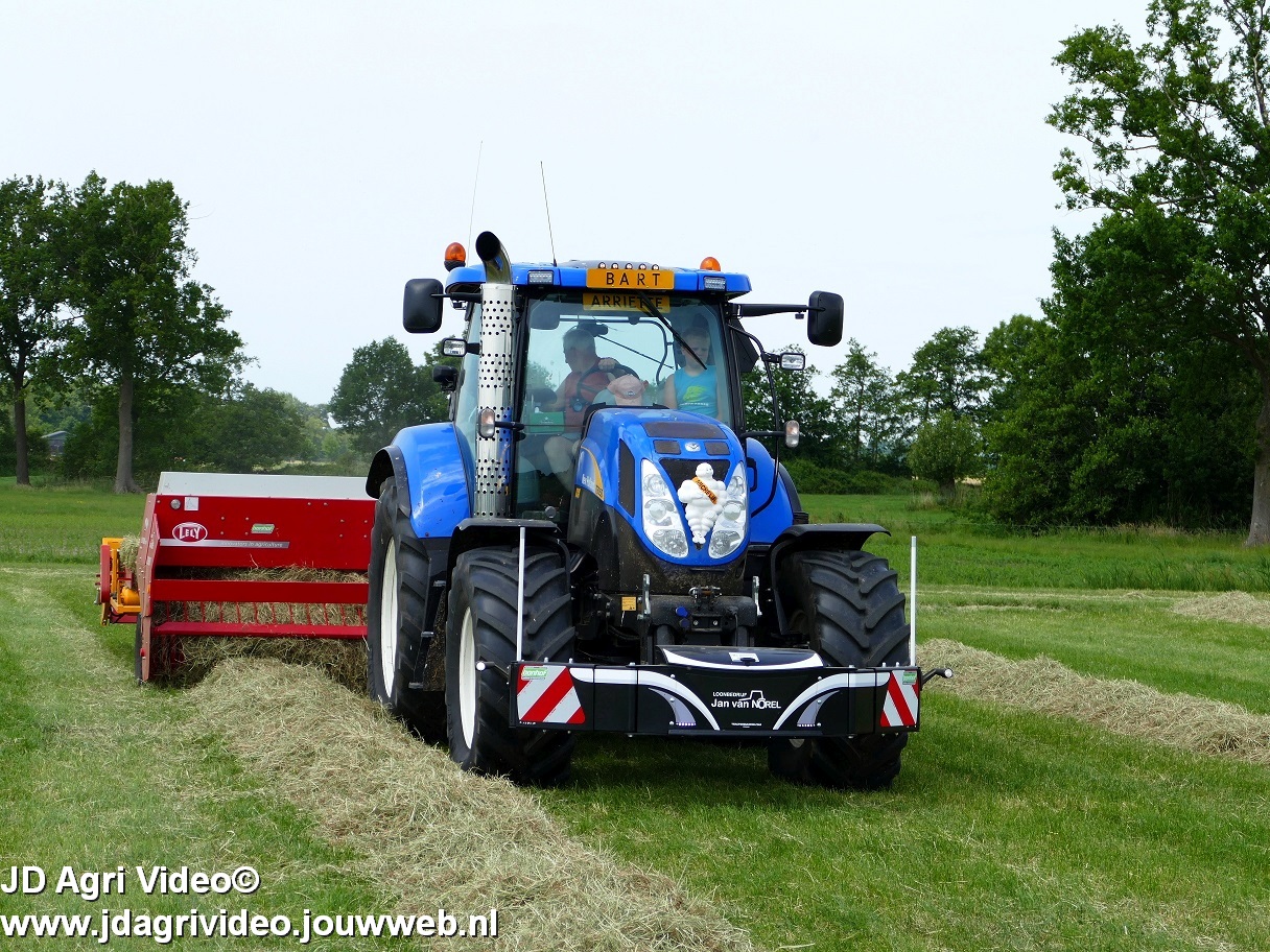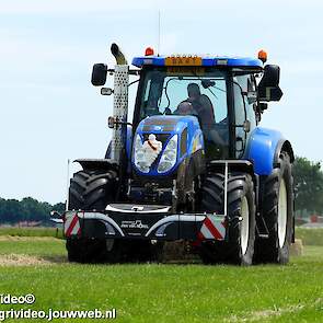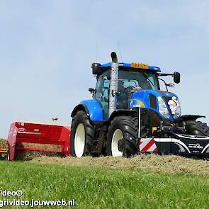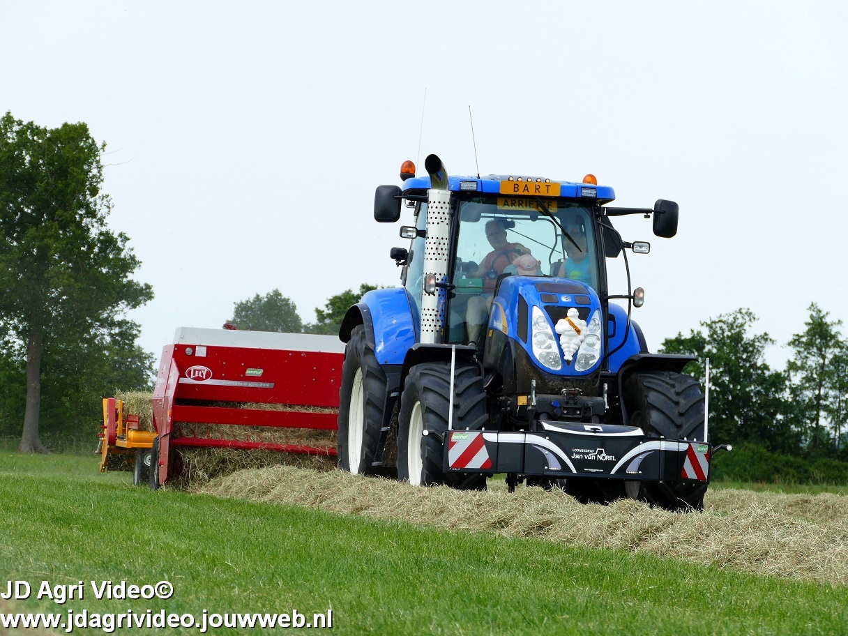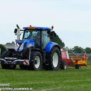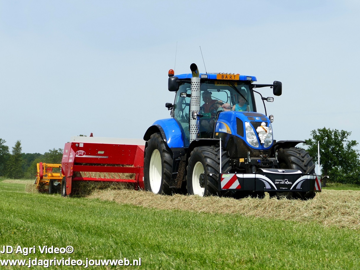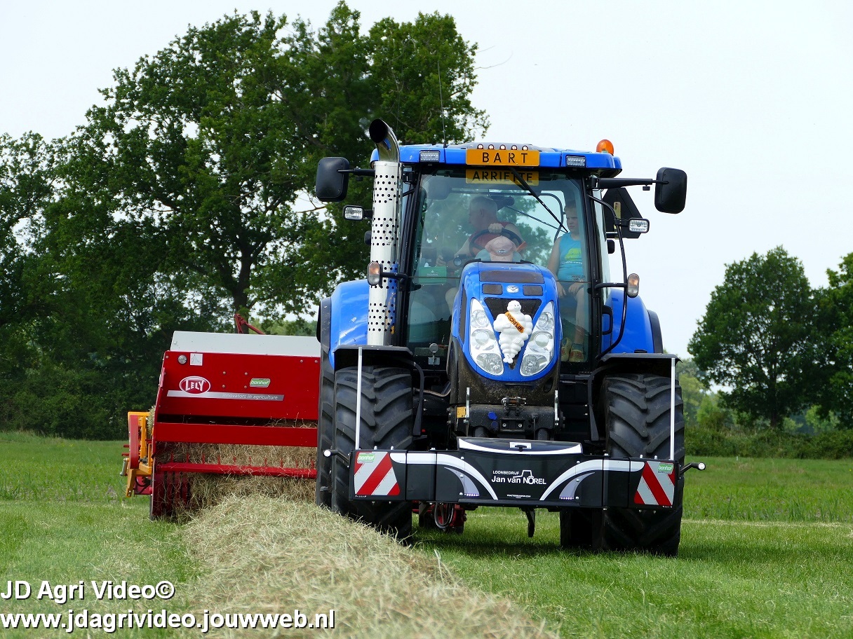 Loonbedrijf Jan van Norel uit Doornspijk (GD) aan het hooibalen persen met een New Holland T6050, een Lely Welger AP730-pers en een Meijer-verzamelwagen.