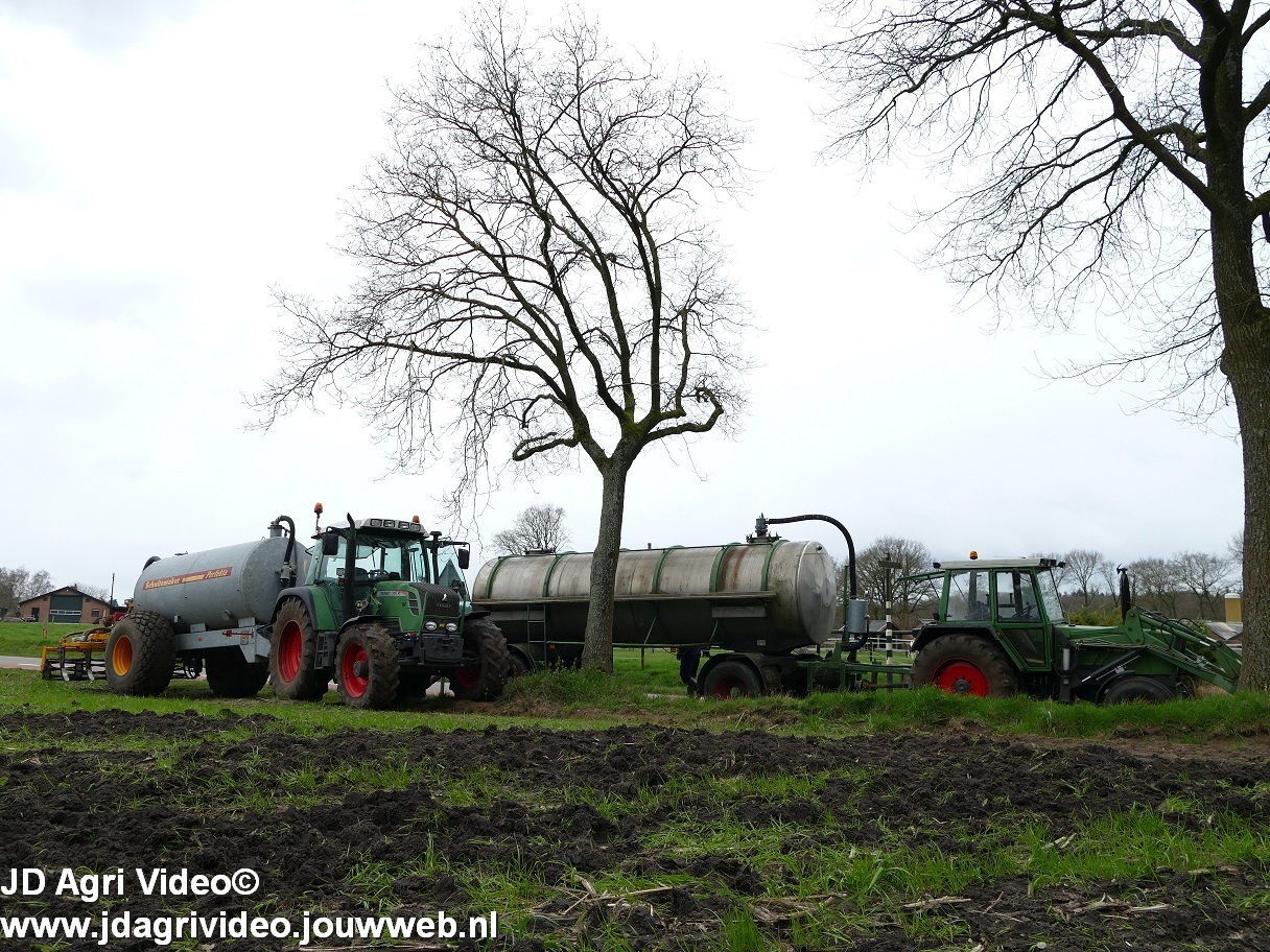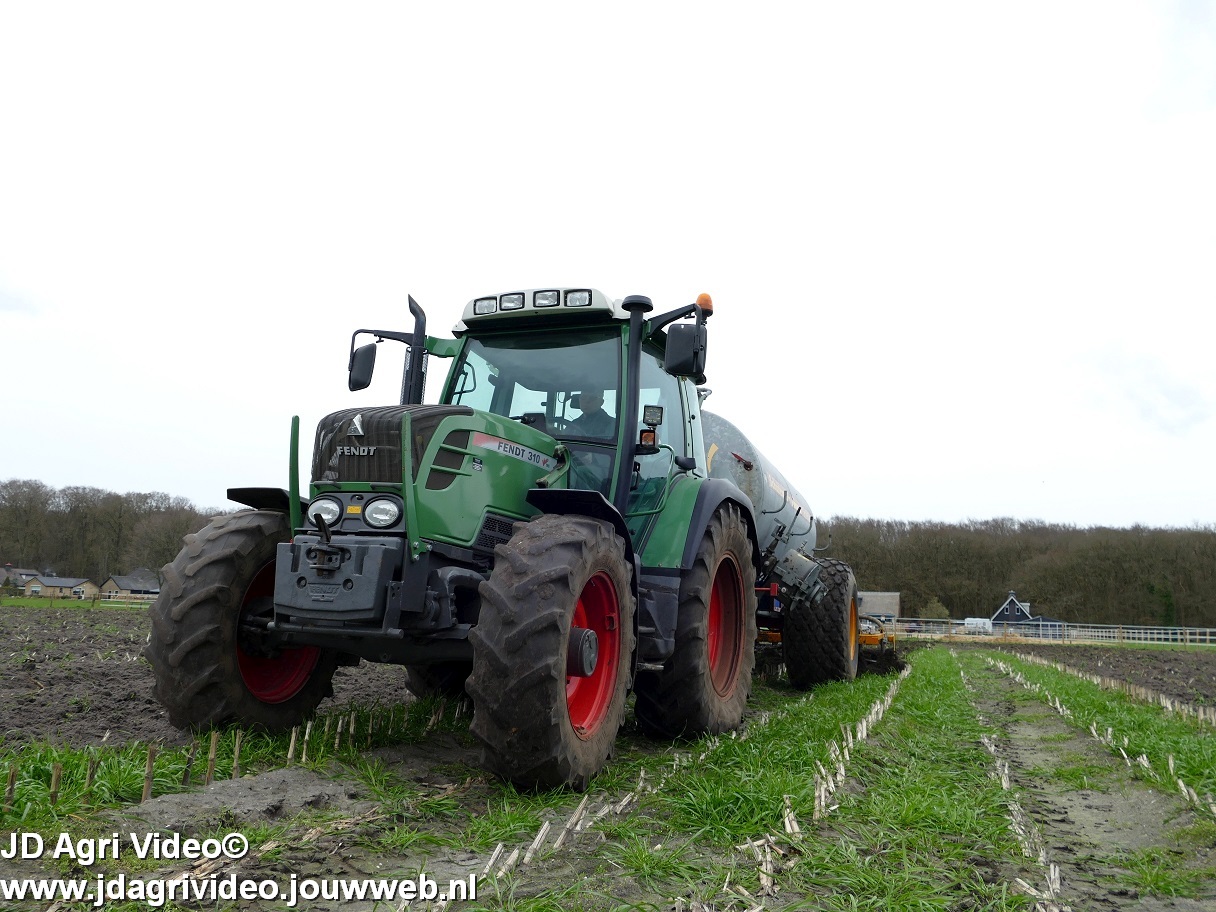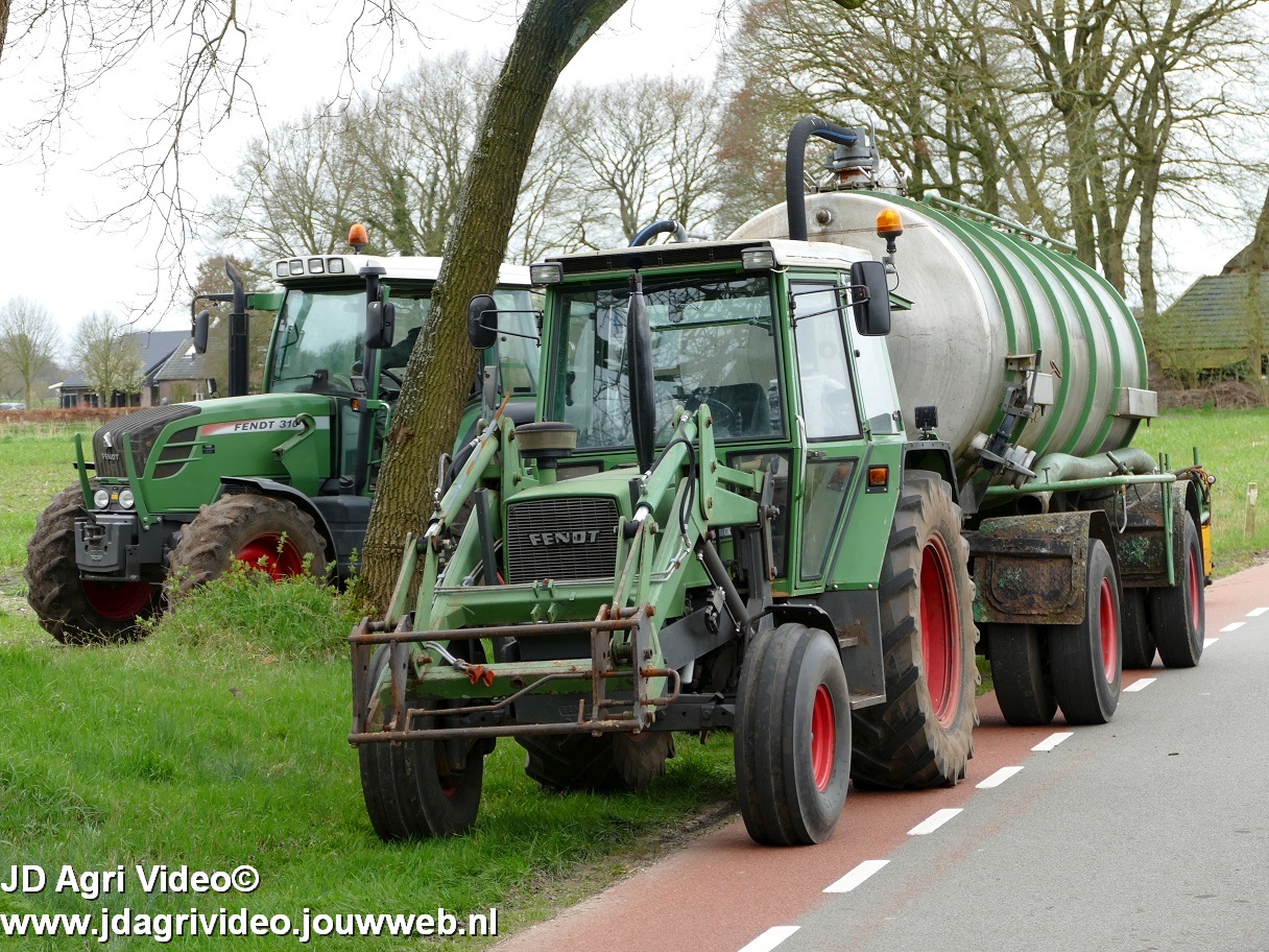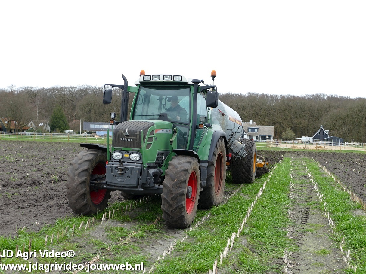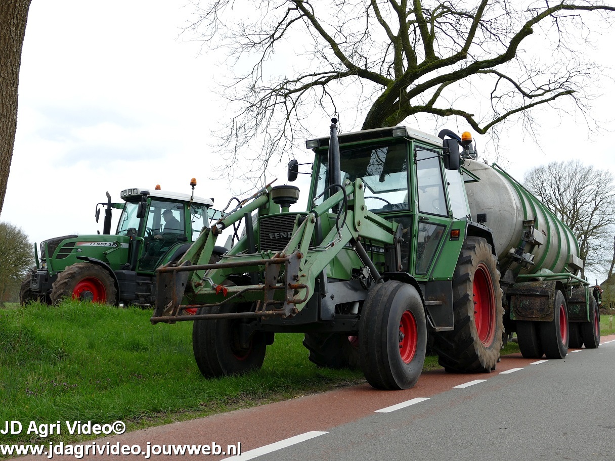 Kalverhouderij van den Hardenberg uit Elspeet aan het bouwland bemesten met een Fendt 310 Vario TMS met Schuitemaker Perfecta-mesttank en een Fendt Farmer 306LS Turbomatik met mesttransporttank.