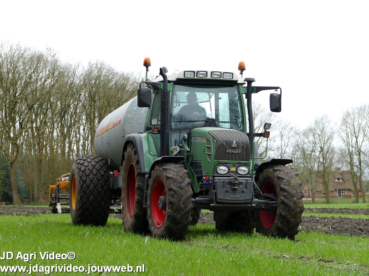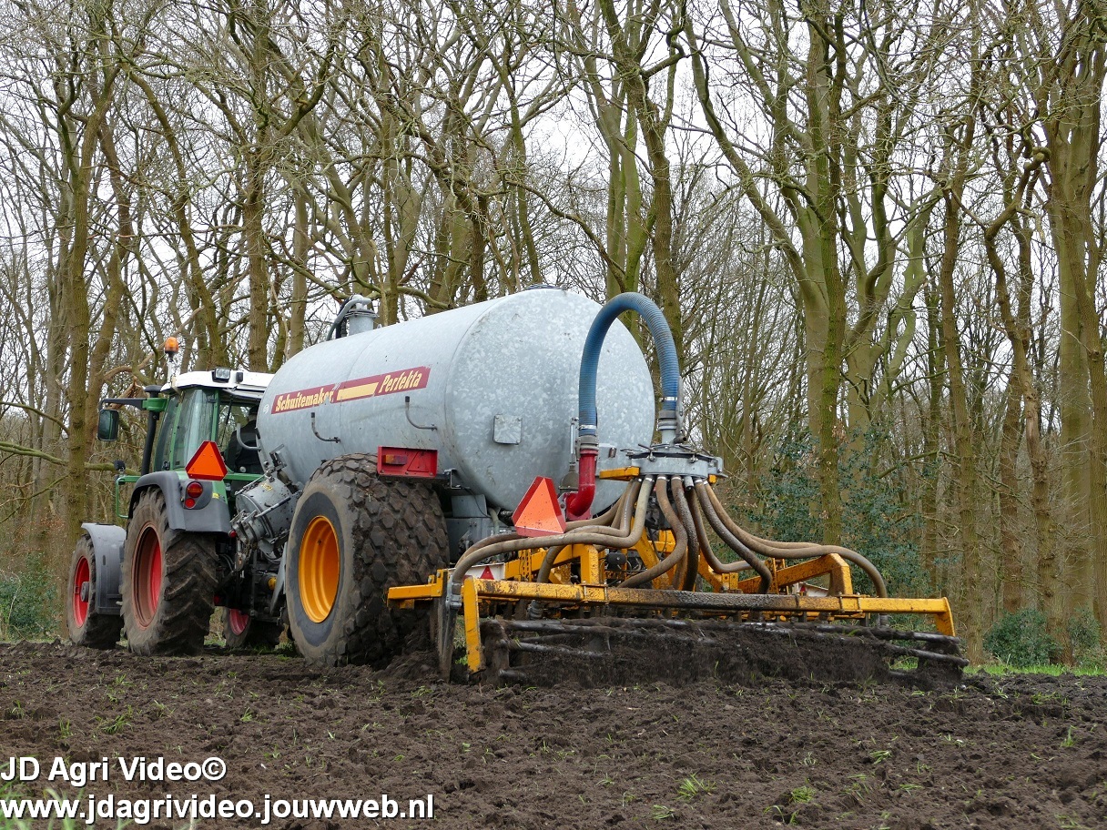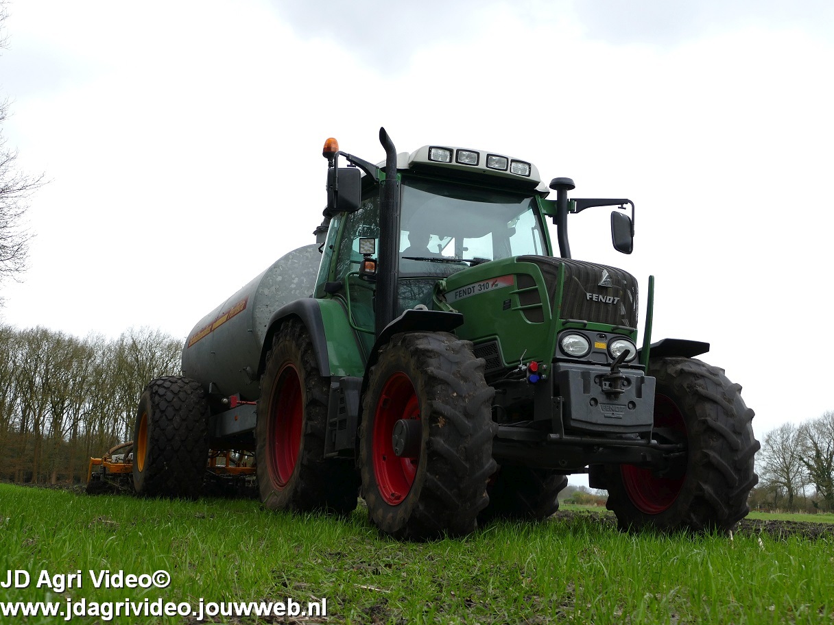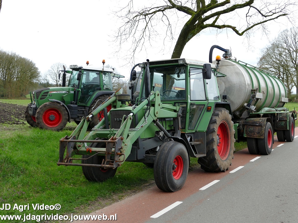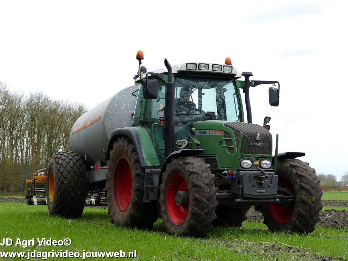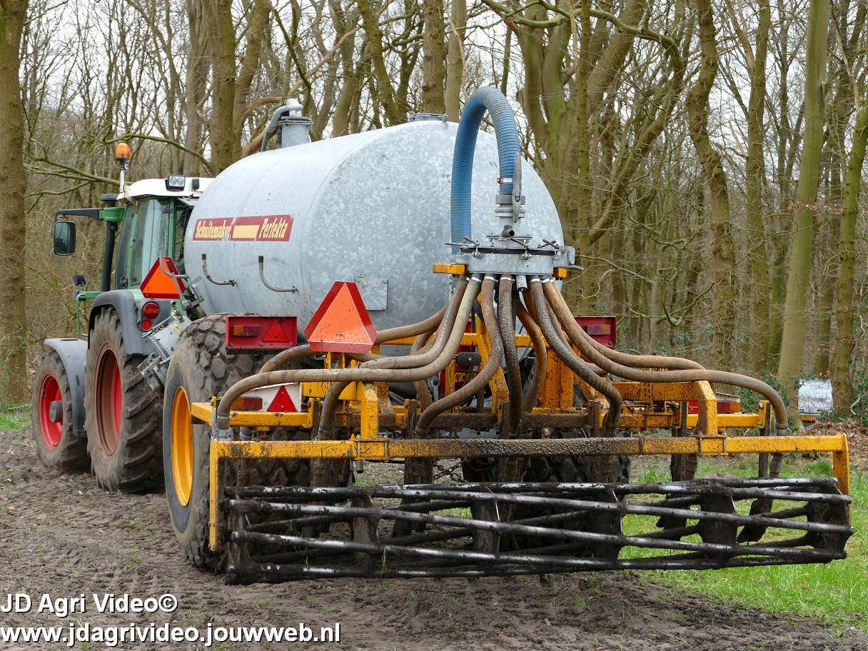 Kalverhouderij van den Hardenberg uit Elspeet aan het bouwland bemesten met een Fendt 310 Vario TMS met Schuitemaker Perfecta-mesttank en een Fendt Farmer 306LS Turbomatik met mesttransporttank.