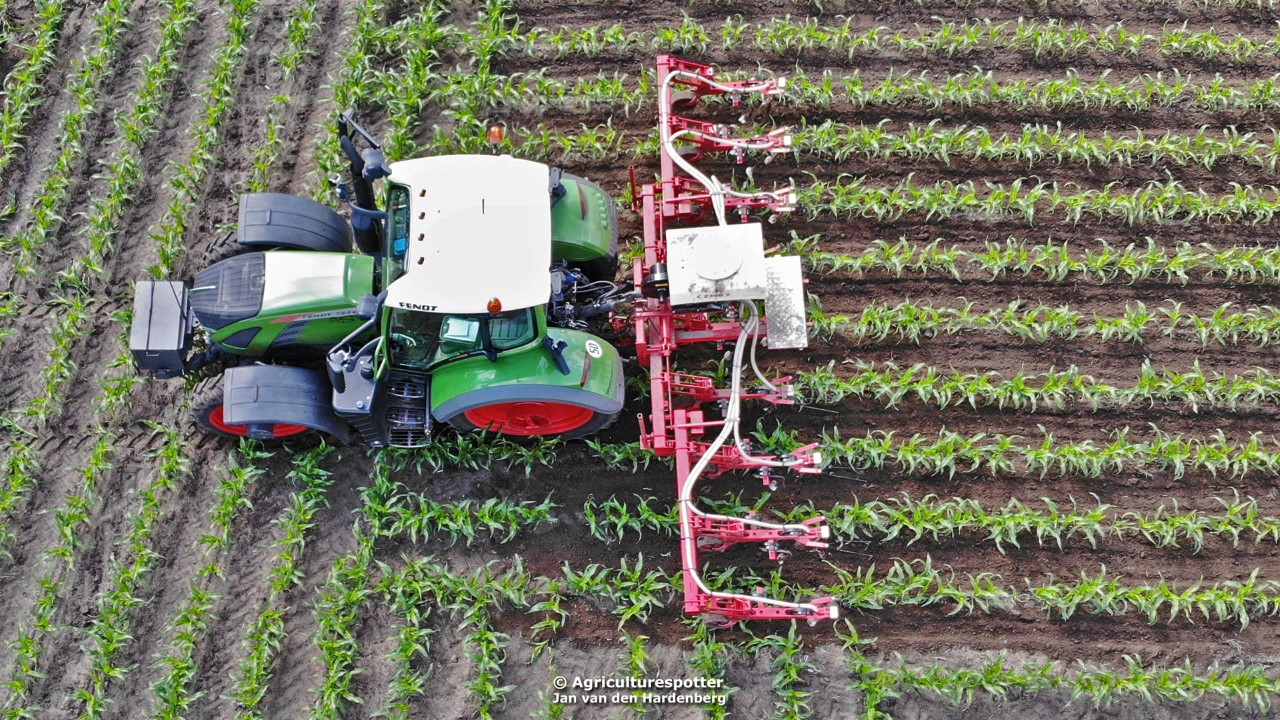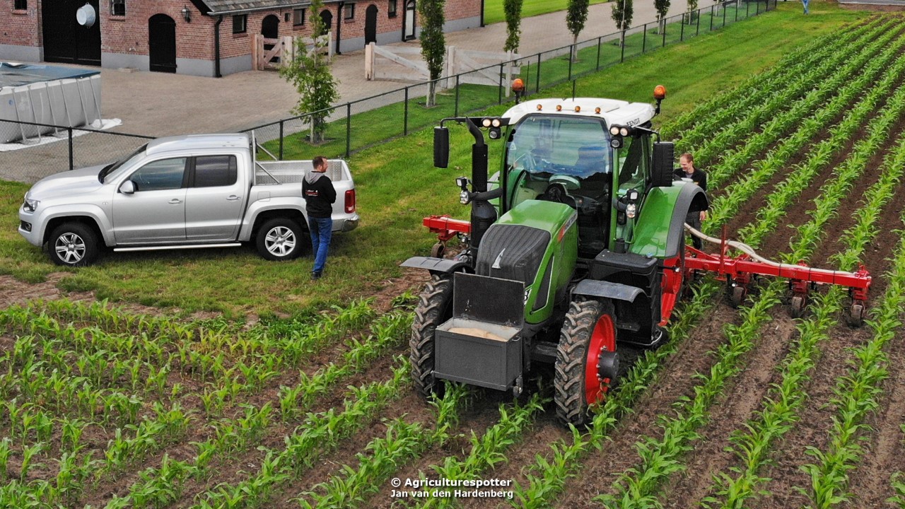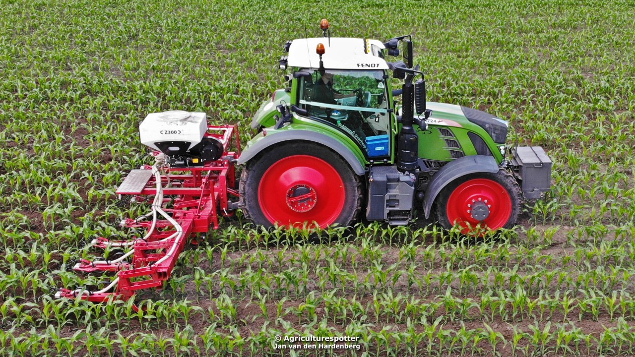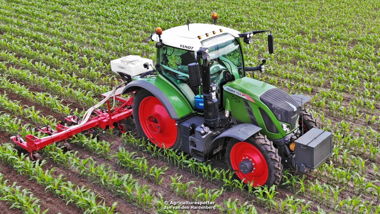 Loonbedrijf Schimmel Overberg BV is hier met een Fendt 724 Vario aan het mais schoffelen en vanggewas onderzaaien.