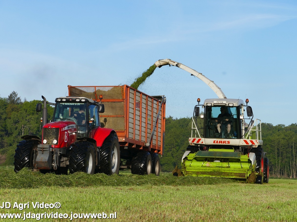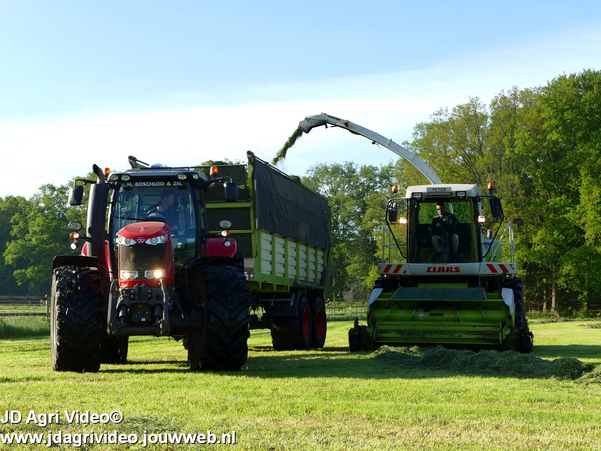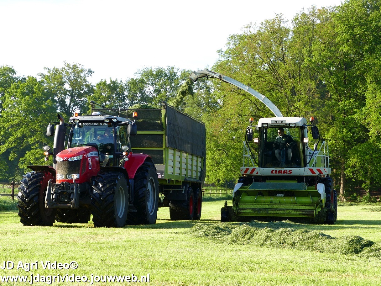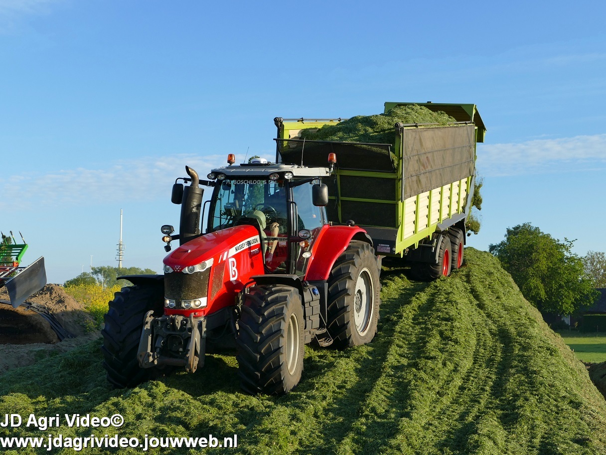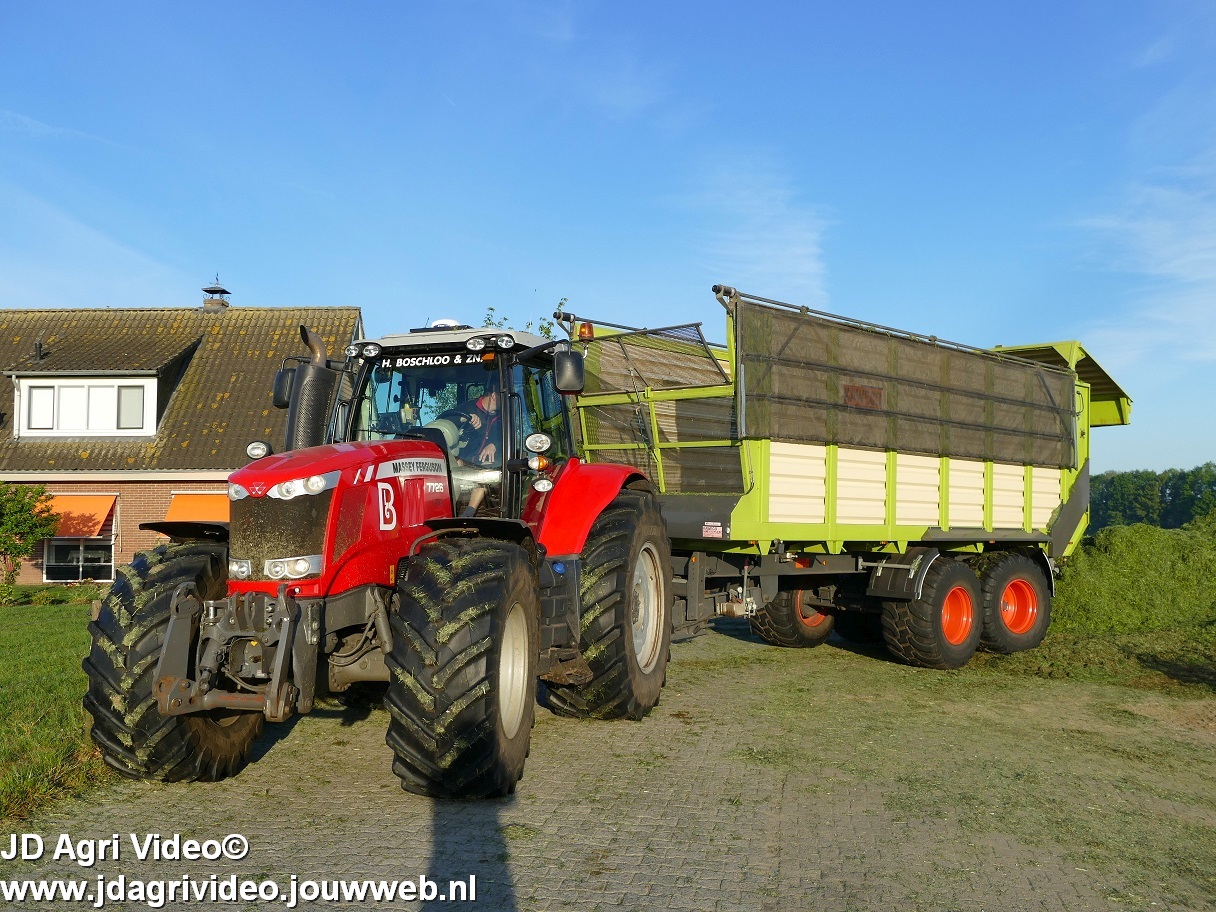 Loonbedrijf H.Boschloo & Zn. uit Gorssel (GD) aan het gras hakselen met een Claas Jaguar 870, een Massey Ferguson 7726 met Kaweco Radium 50, een Massey Ferguson 7497 met Kaweco Radium 40 en een Fendt 718 Vario TMS (Tuitert Empe) met Kaweco Radium 45. Op de kuil een Werklust WG18D met Holaras-kuilverdeler.