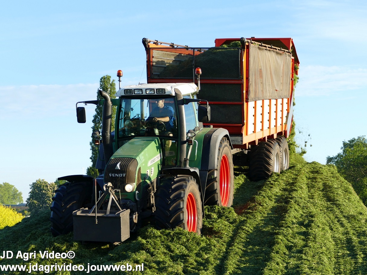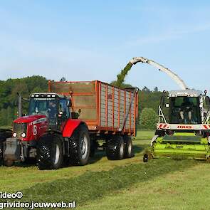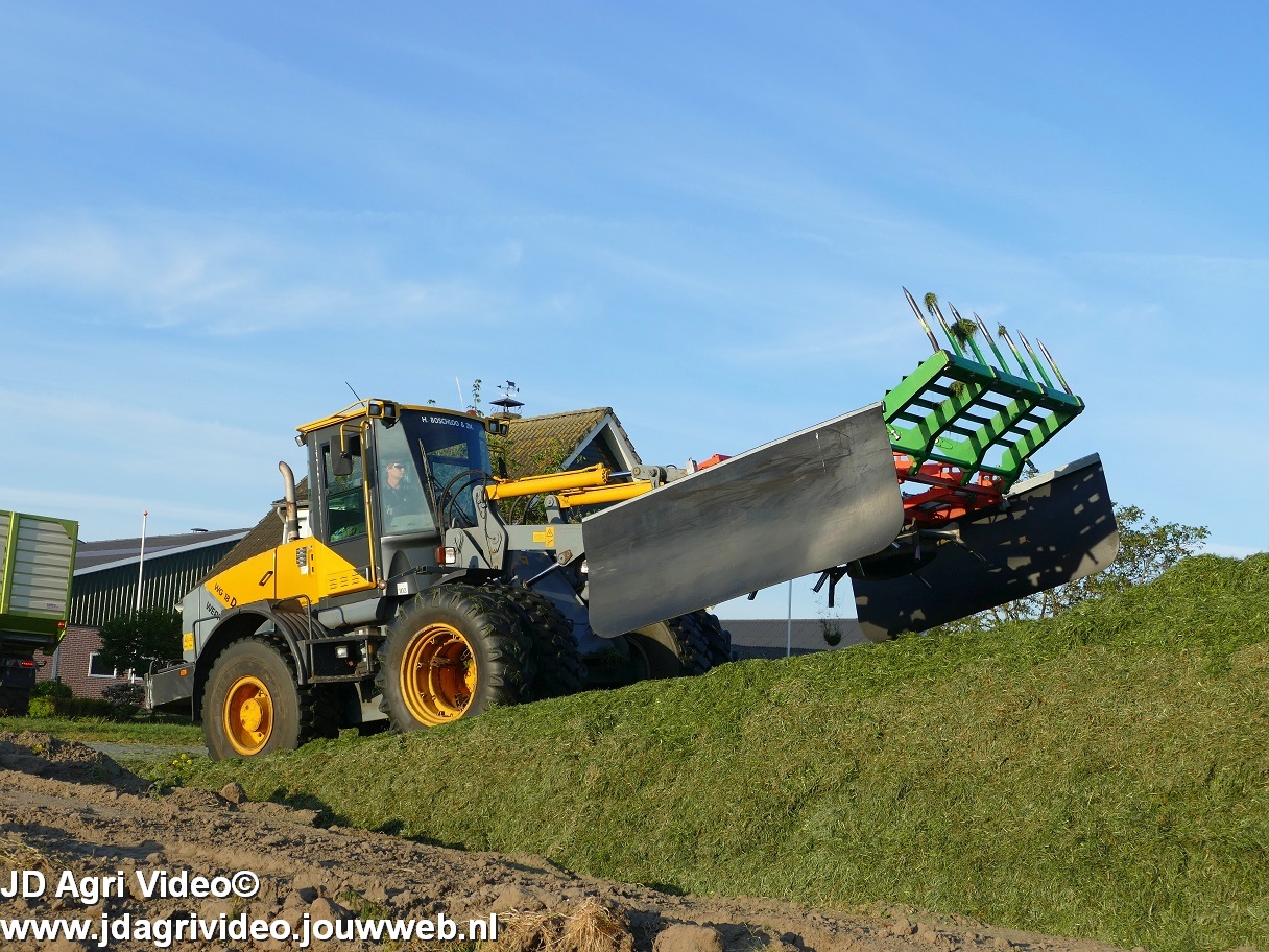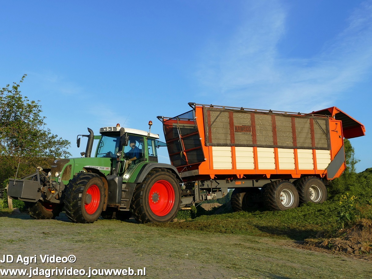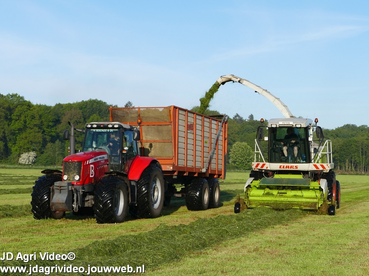 Loonbedrijf H.Boschloo & Zn. uit Gorssel (GD) aan het gras hakselen met een Claas Jaguar 870, een Massey Ferguson 7726 met Kaweco Radium 50, een Massey Ferguson 7497 met Kaweco Radium 40 en een Fendt 718 Vario TMS (Tuitert Empe) met Kaweco Radium 45. Op de kuil een Werklust WG18D met Holaras-kuilverdeler.