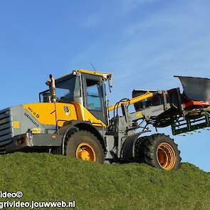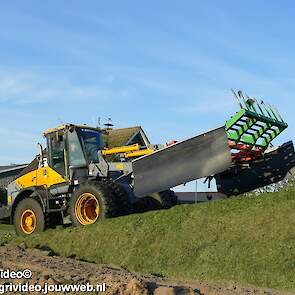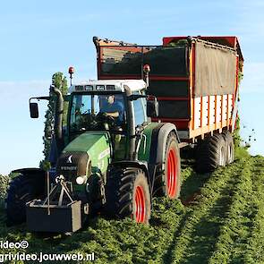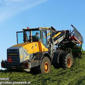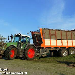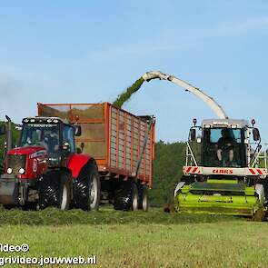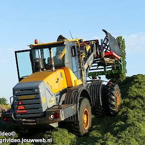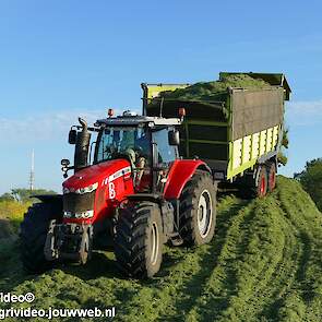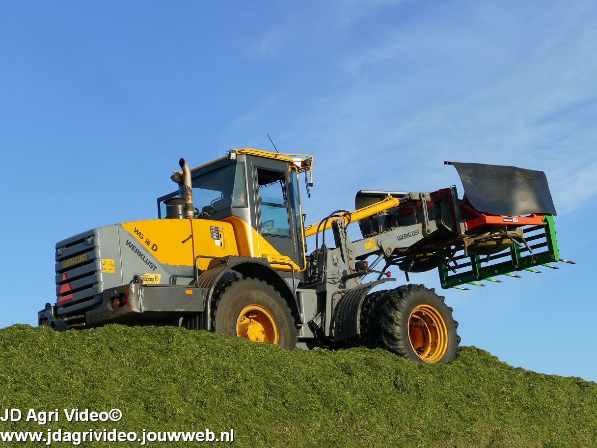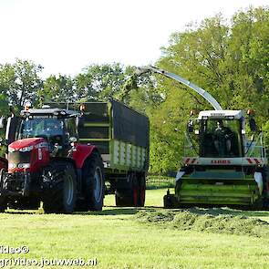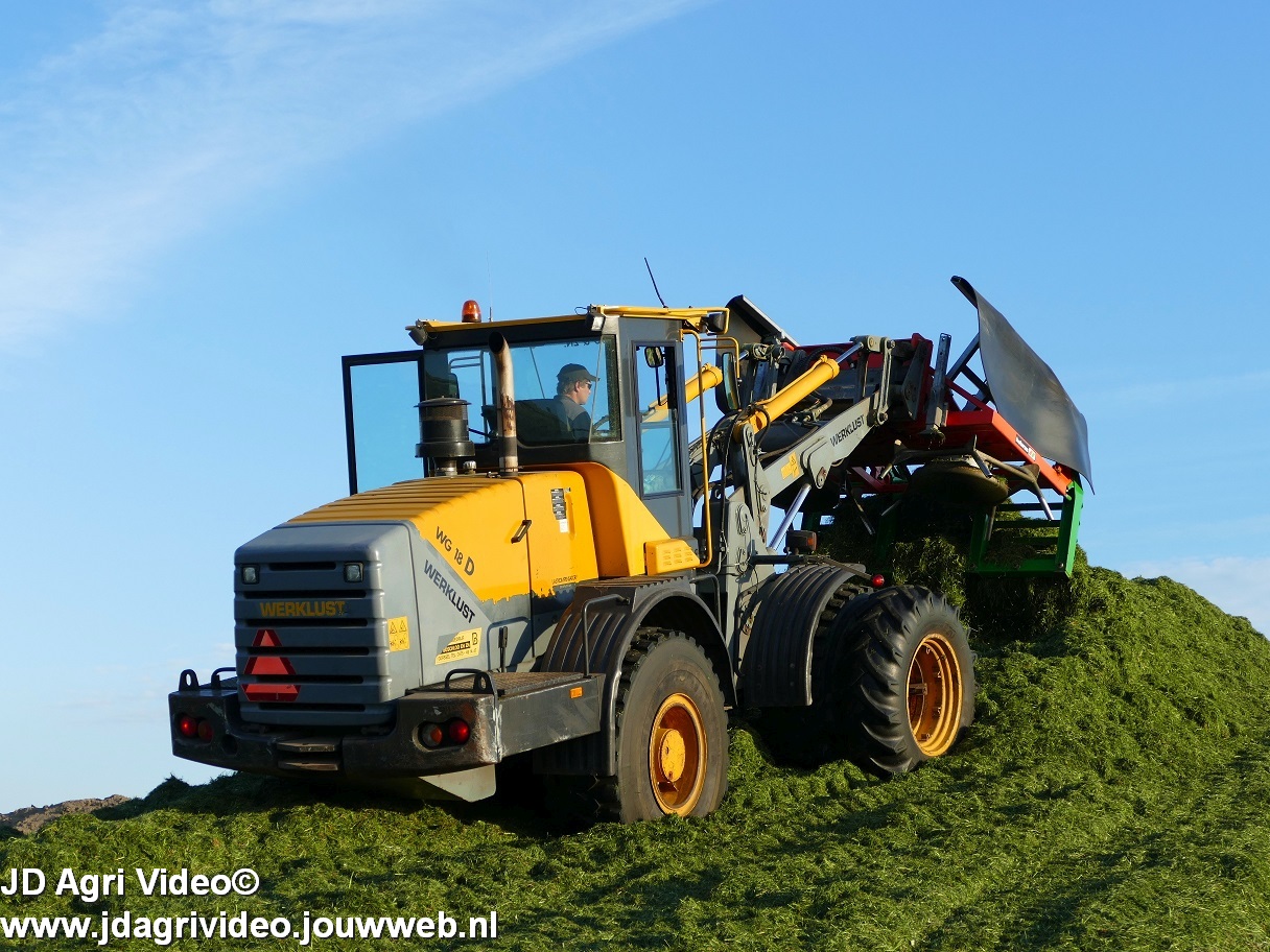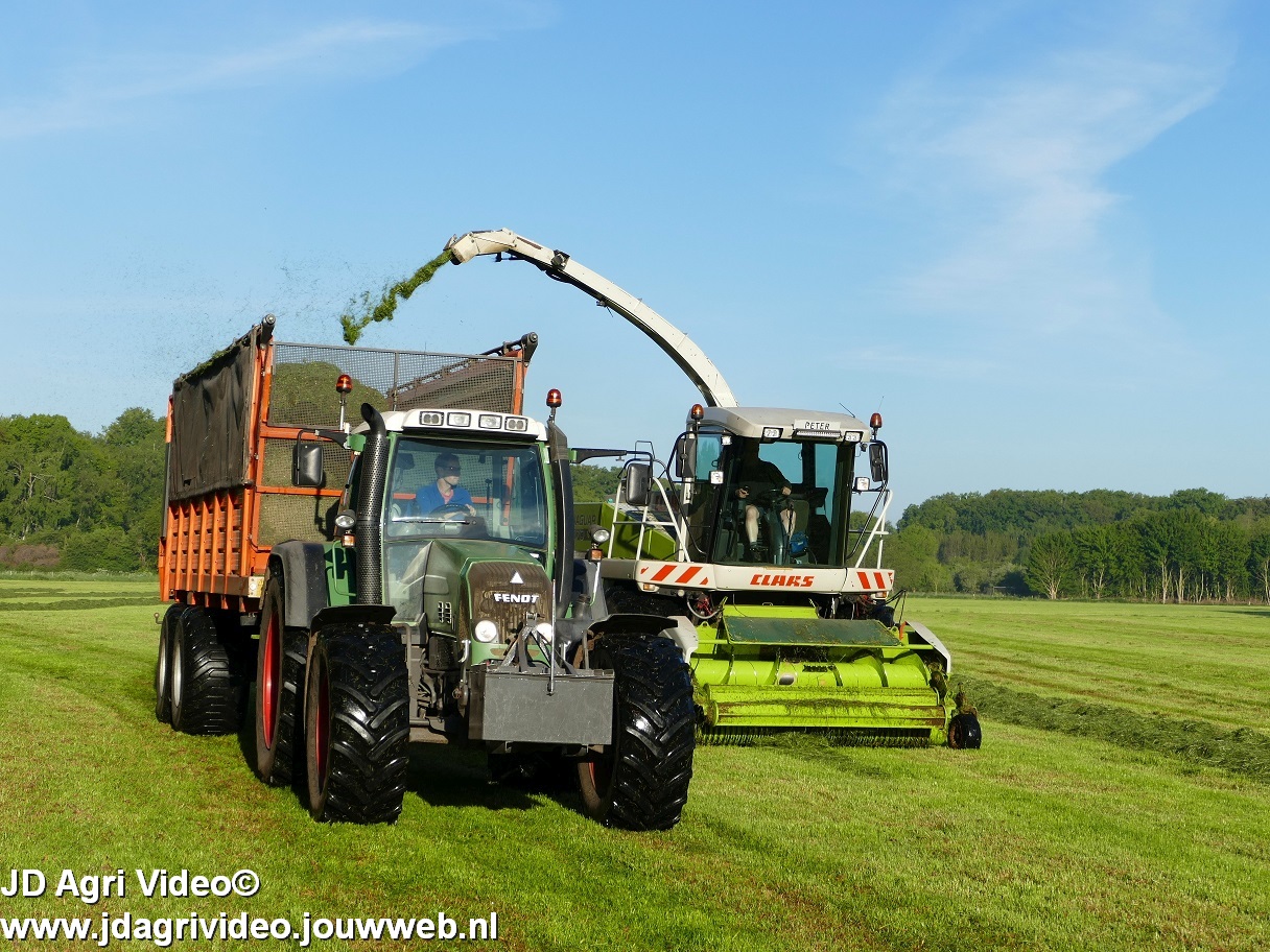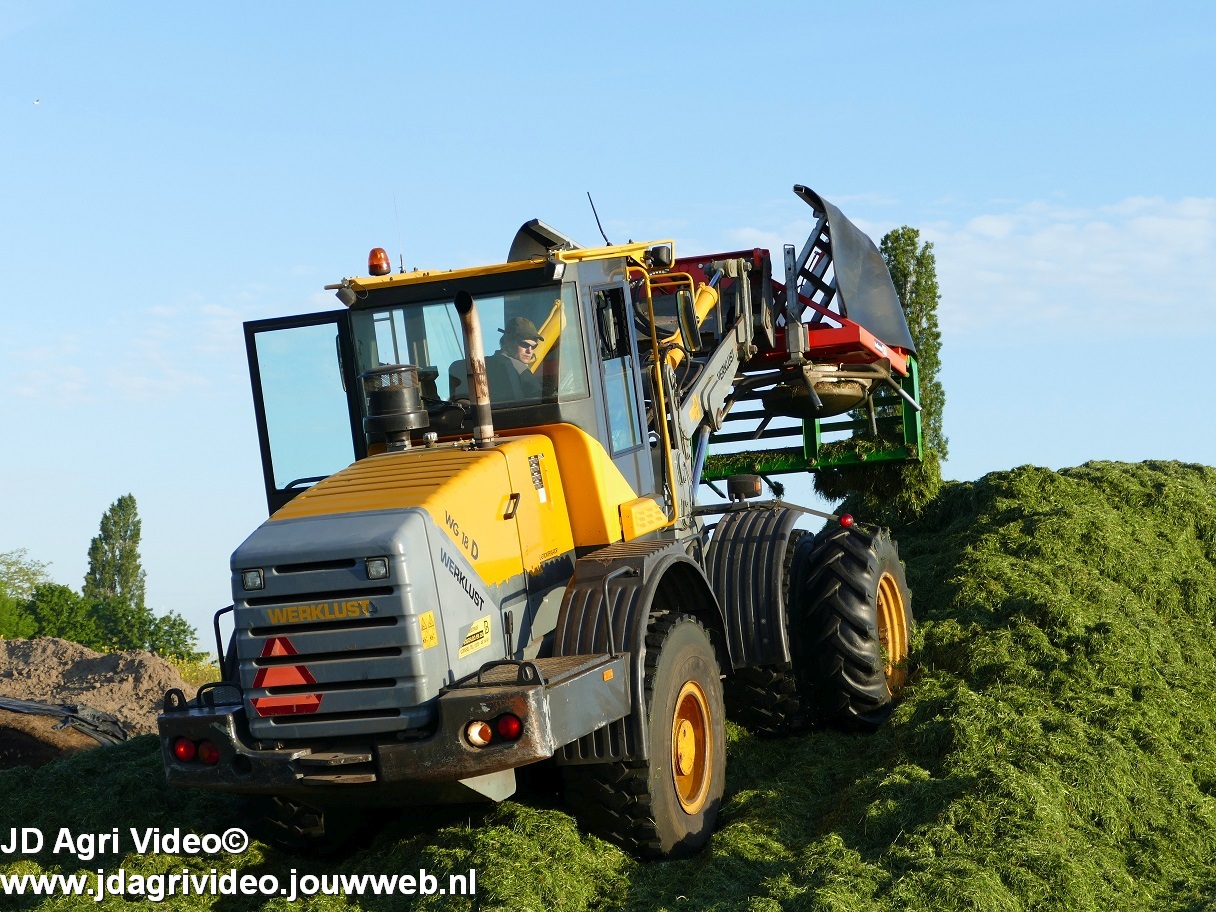 Loonbedrijf H.Boschloo & Zn. uit Gorssel (GD) aan het gras hakselen met een Claas Jaguar 870, een Massey Ferguson 7726 met Kaweco Radium 50, een Massey Ferguson 7497 met Kaweco Radium 40 en een Fendt 718 Vario TMS (Tuitert Empe) met Kaweco Radium 45. Op de kuil een Werklust WG18D met Holaras-kuilverdeler.
