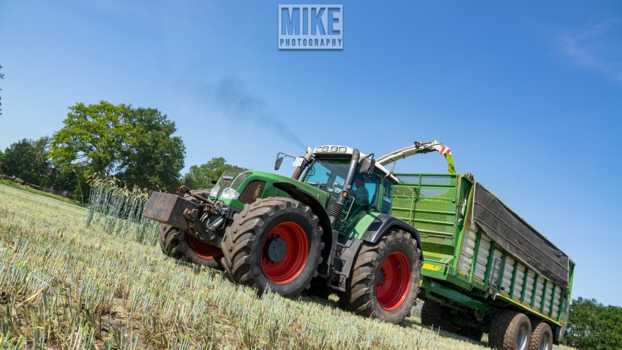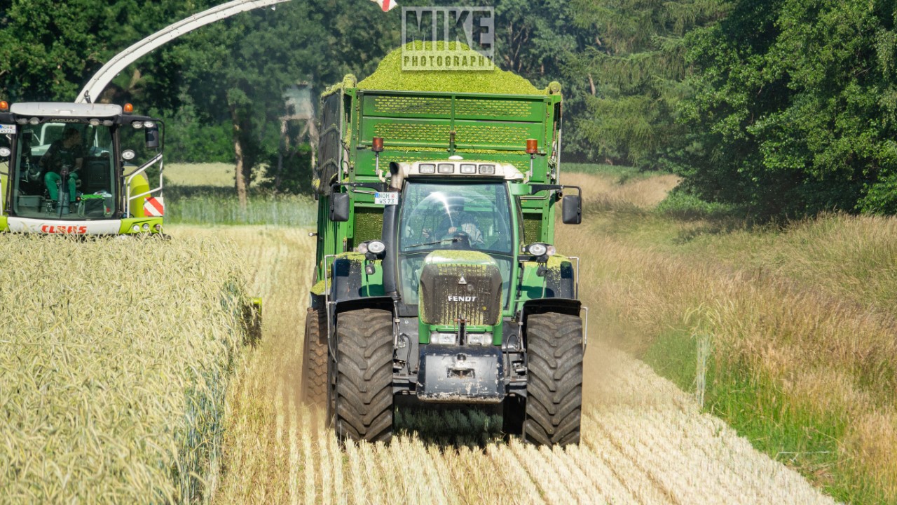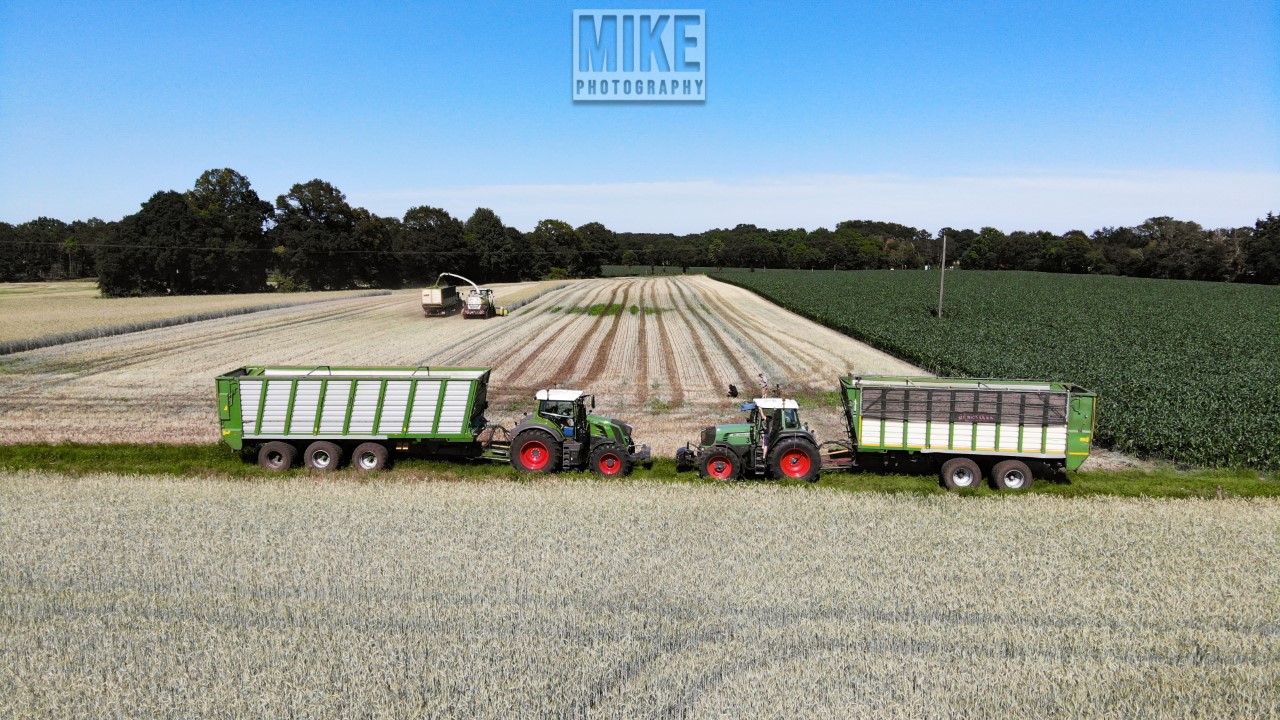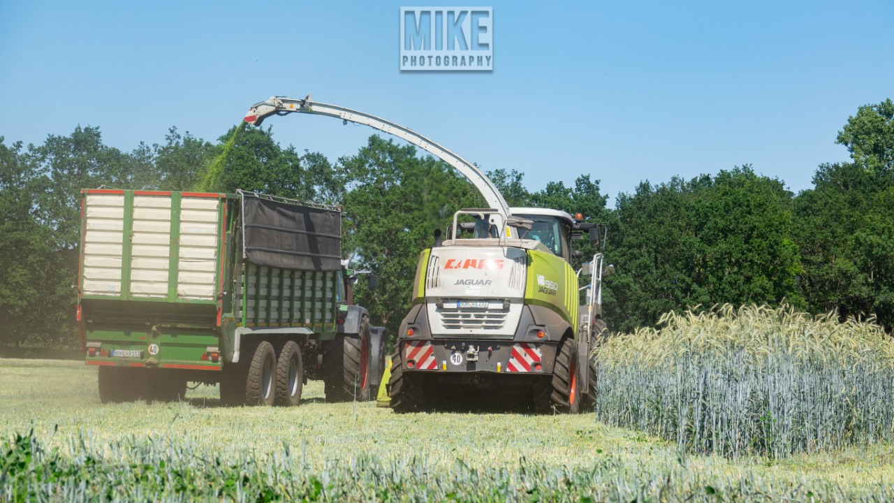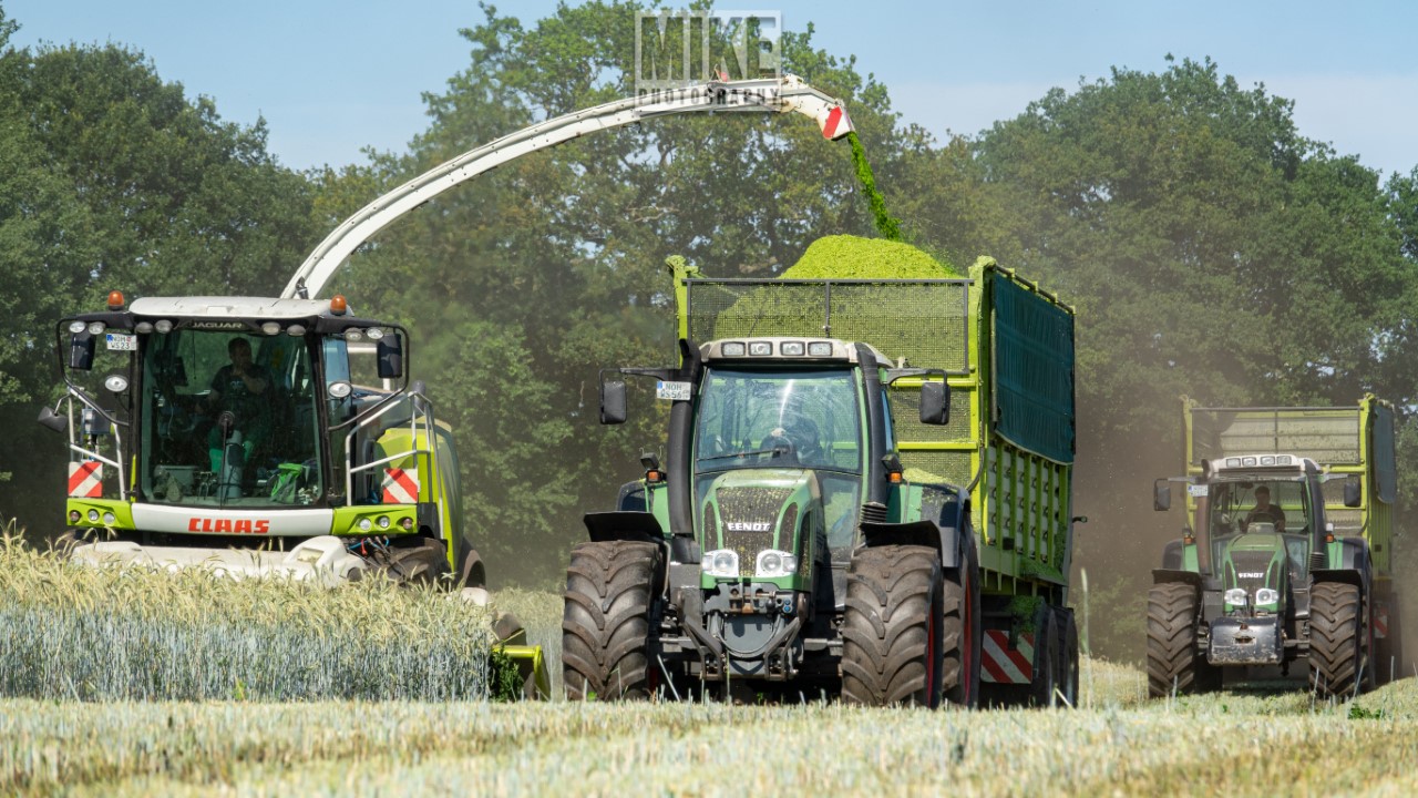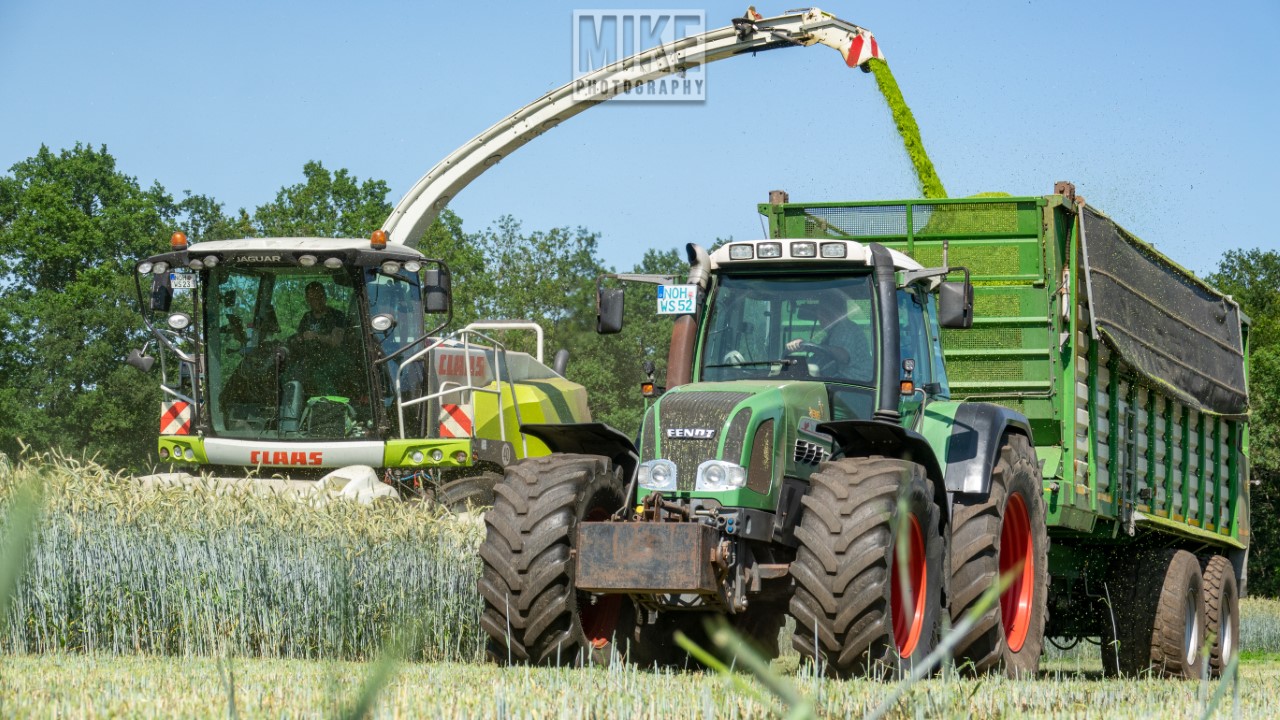 Lohnunternehmen Steenweg uit Bad Bentheim aan het hakselen. Dit gebeurde met een Claas Jaguar 950-hakselaar en vijf Fendt-tractoren.