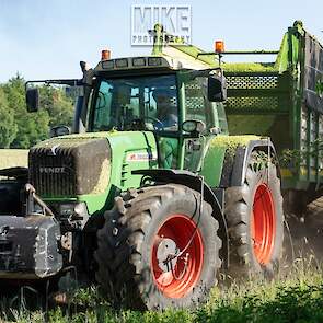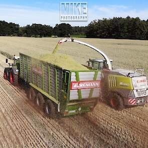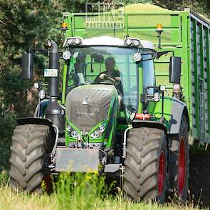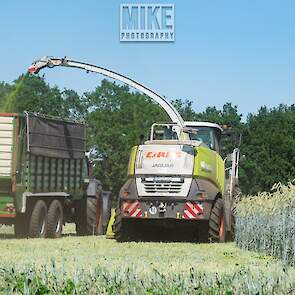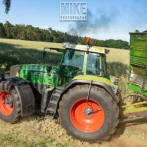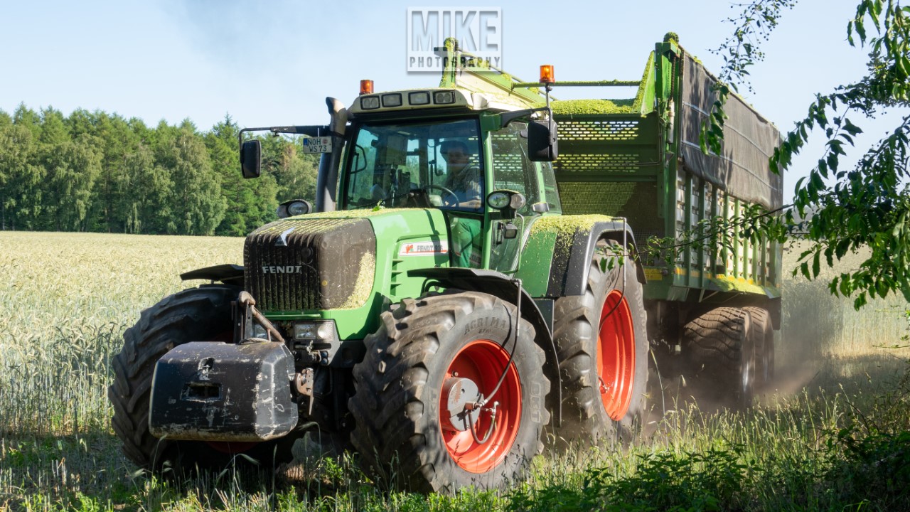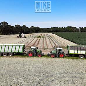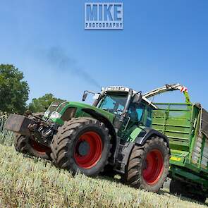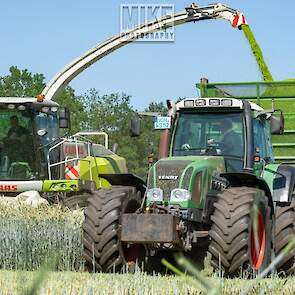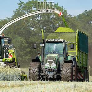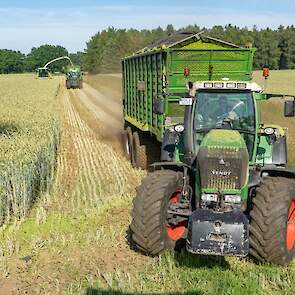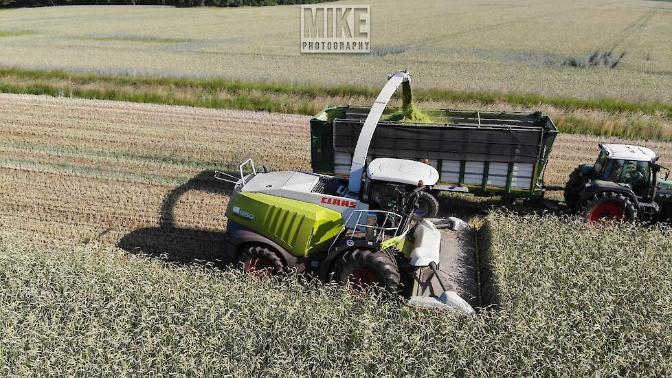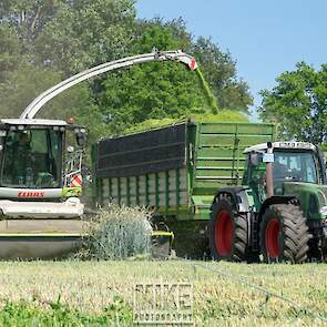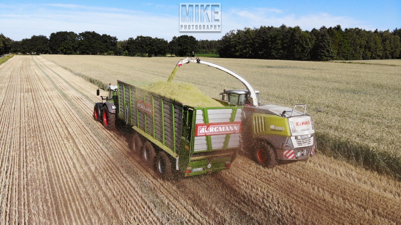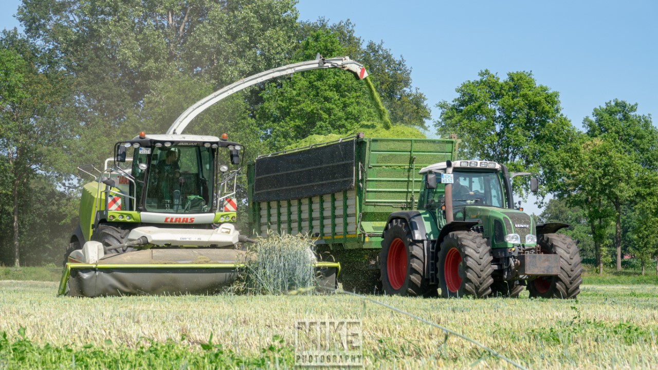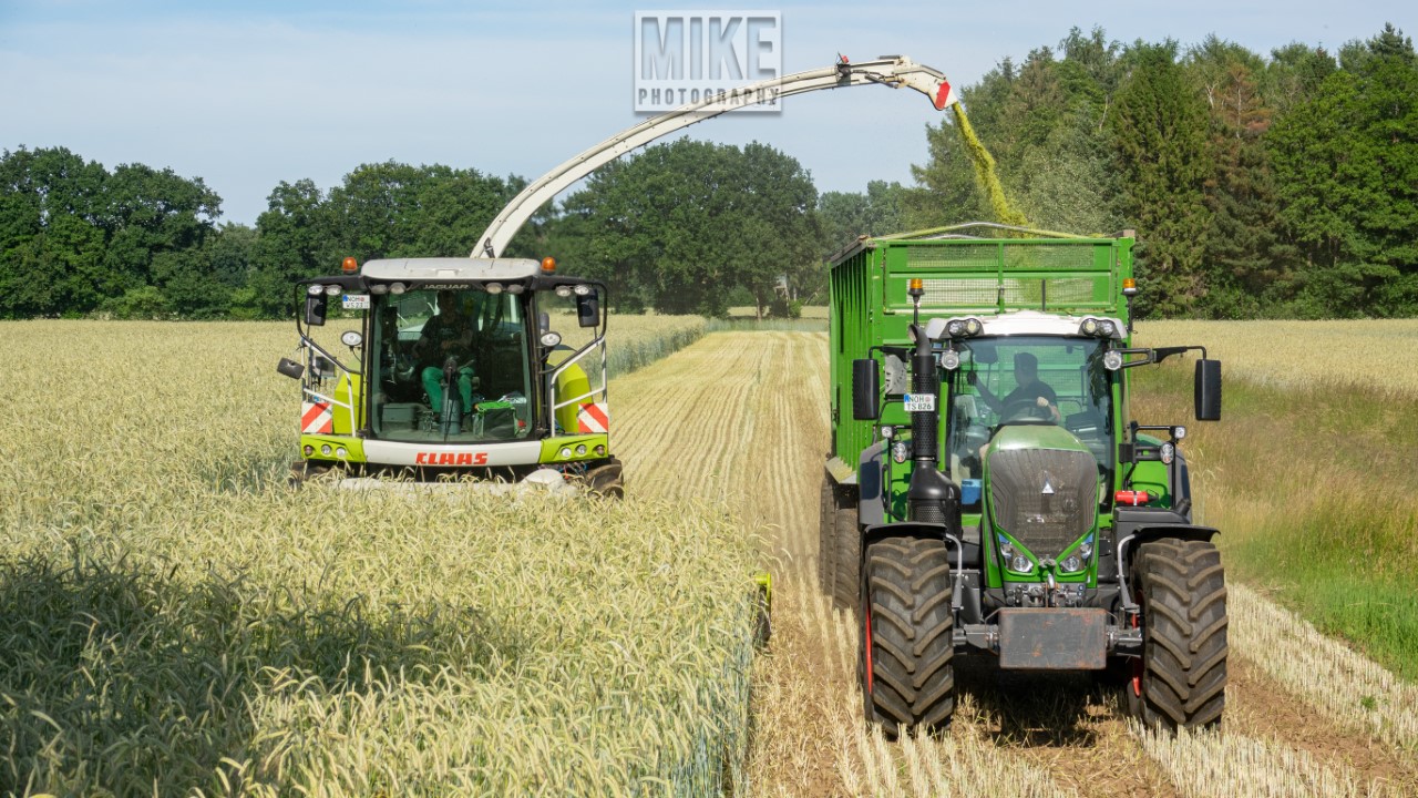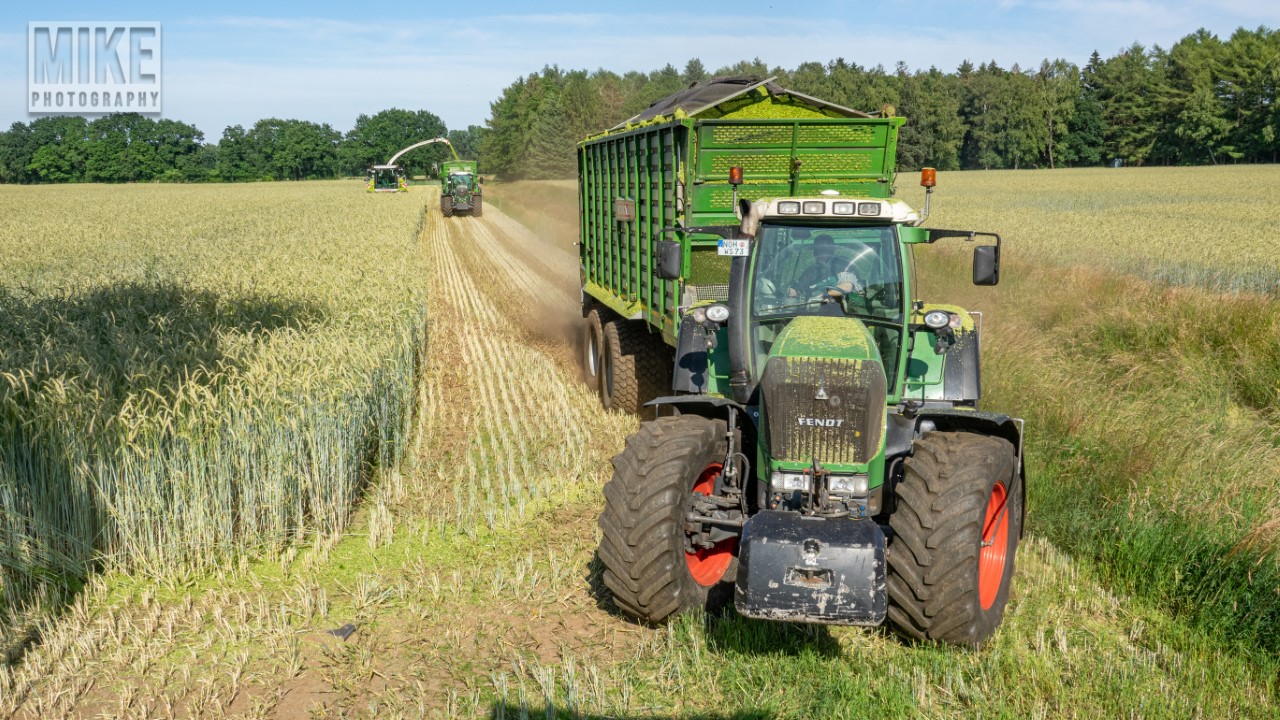 Lohnunternehmen Steenweg uit Bad Bentheim aan het hakselen. Dit gebeurde met een Claas Jaguar 950-hakselaar en vijf Fendt-tractoren.
