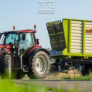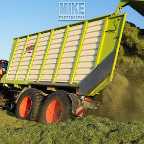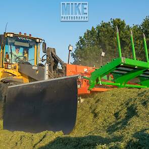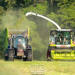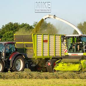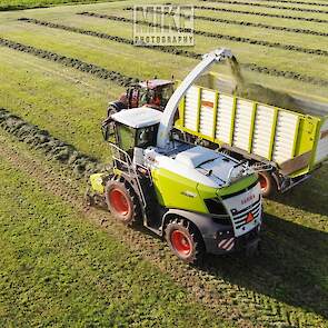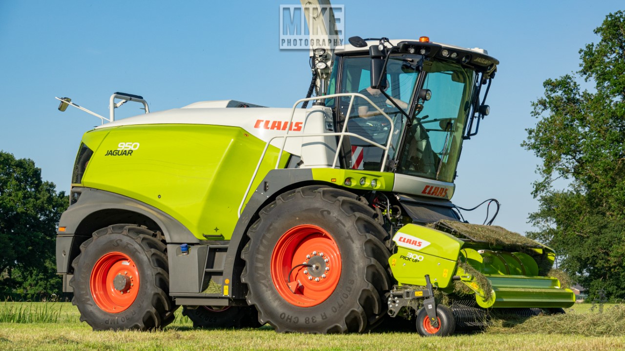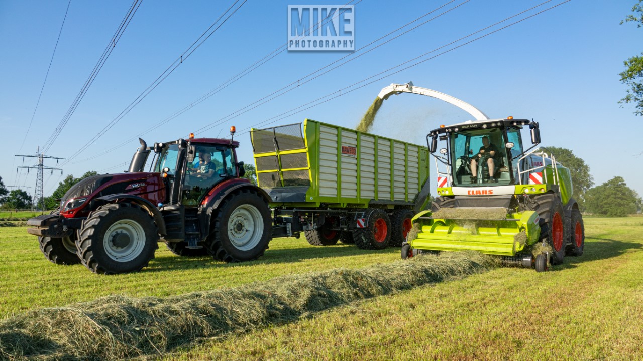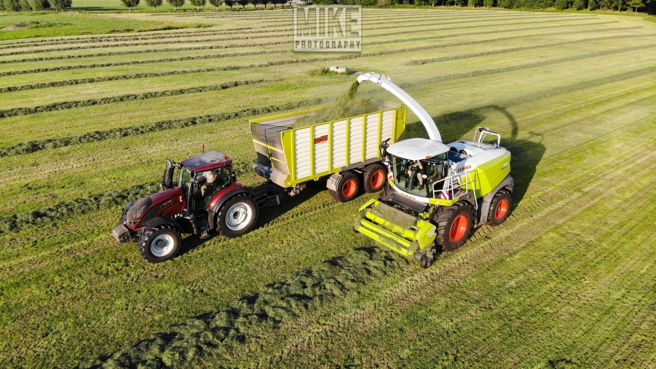 Loonbedrijf Gebr. Dreierink uit Terwolde (GD) aan het gras hakselen met Claas Jaguar 950, twee maal Valtra 234 met een Kaweco-silagewagen en een Volvo op de kuil.