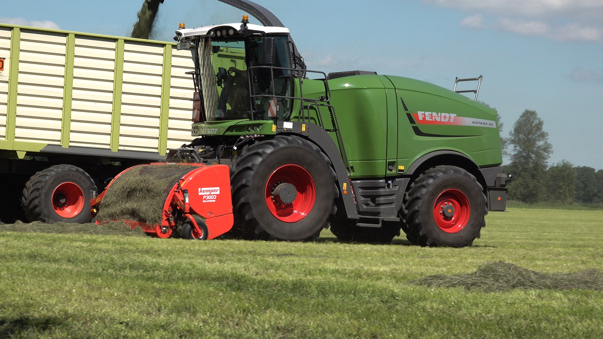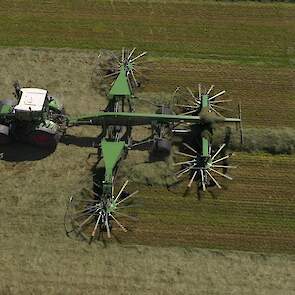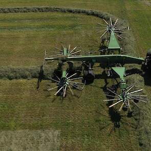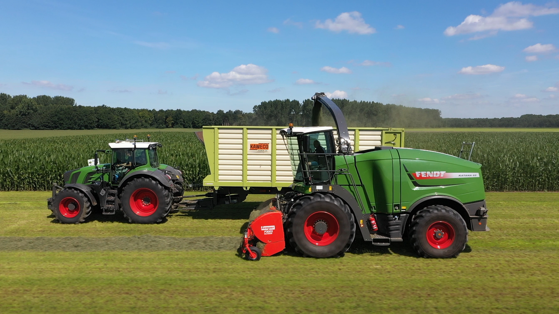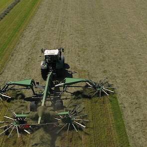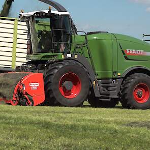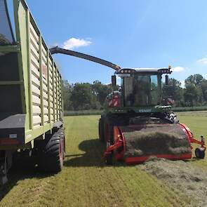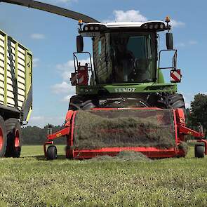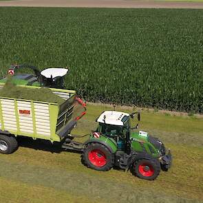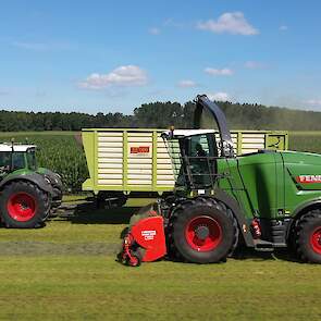 De Kaweco-silagewagens worden gevuld door de grashakselaar van Fendt, de Katana 65. Melkveehouder J.van Esveld harkt het gras bij elkaar met zijn Fendt 514 en Fendt-hark.
