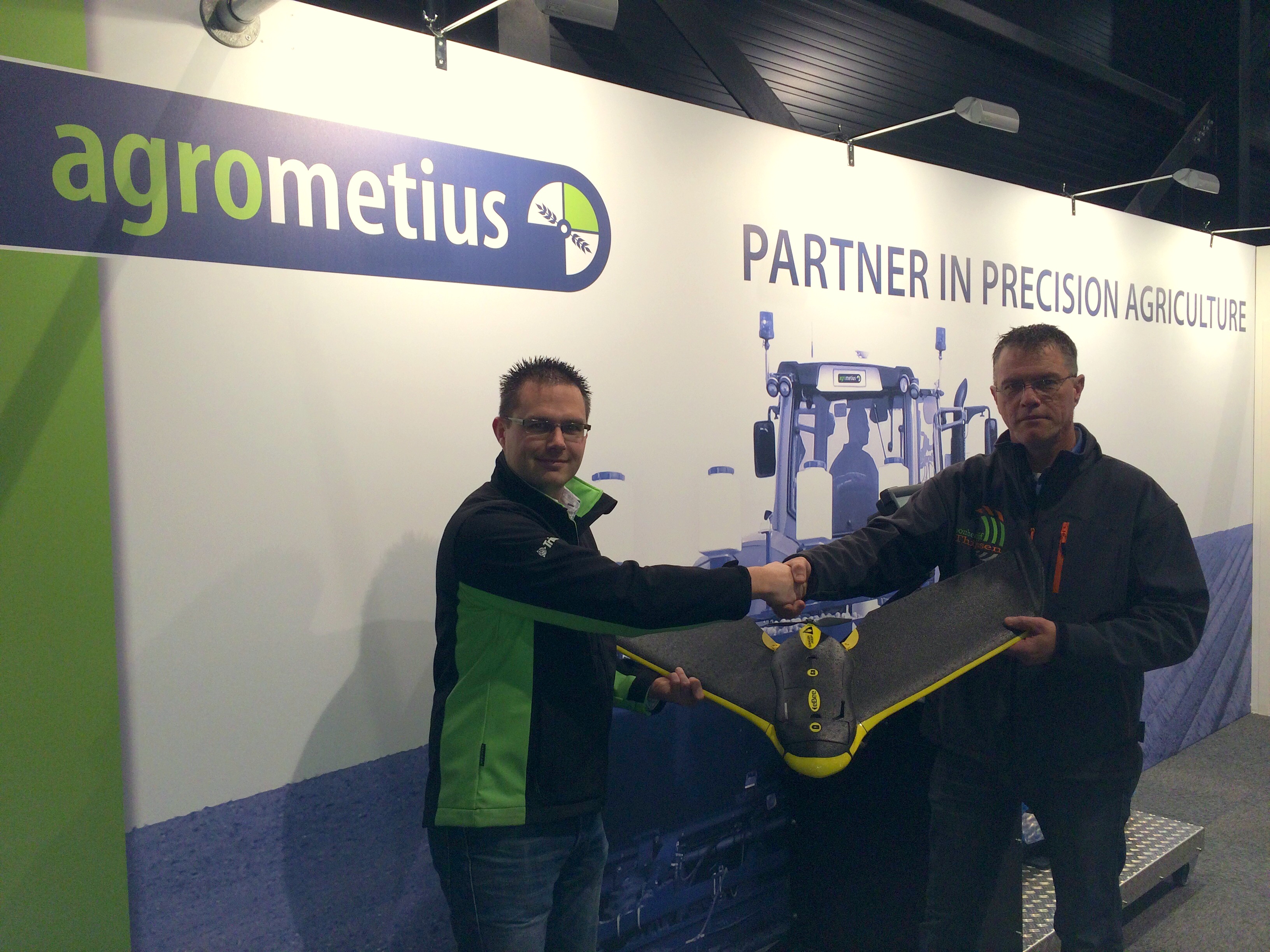 Loonbedrijf Thijssen uit Nieuwehorne kocht voor de kerst de eerste eBee Ag van Agrometius en daarmee is geschiedenis geschreven. Thijssen is het eerste loonbedrijf in Nederland dat naast trekkers ook een professionele drone in het machinepark heeft. De eBee Ag zal vanaf medio 2015 worden ingezet om multispectrale opnamen te maken van gewassen. Thijssen verbreed hiermee de dienstverlening op gebied van precisielandbouw.