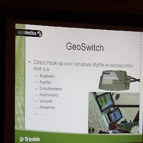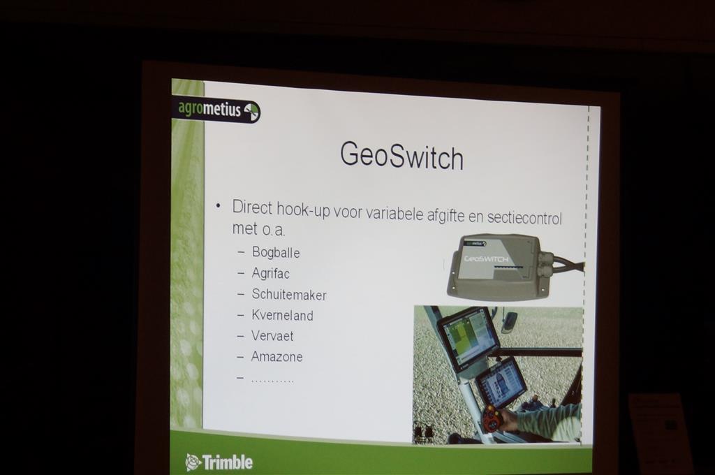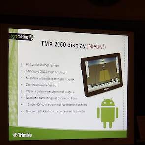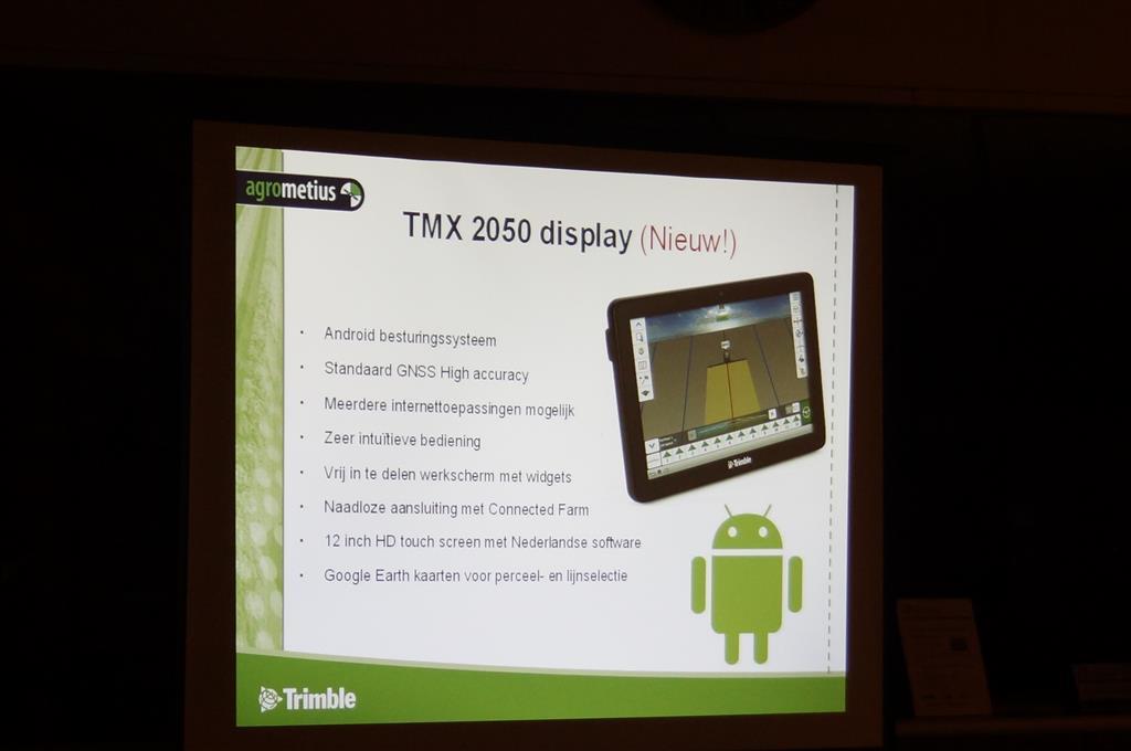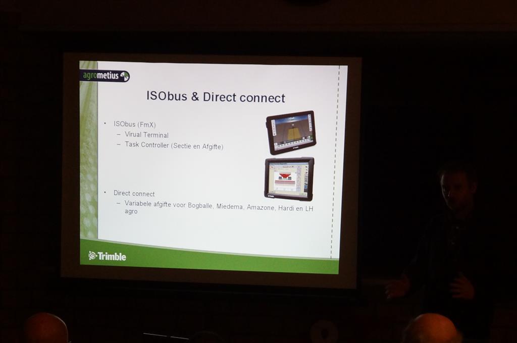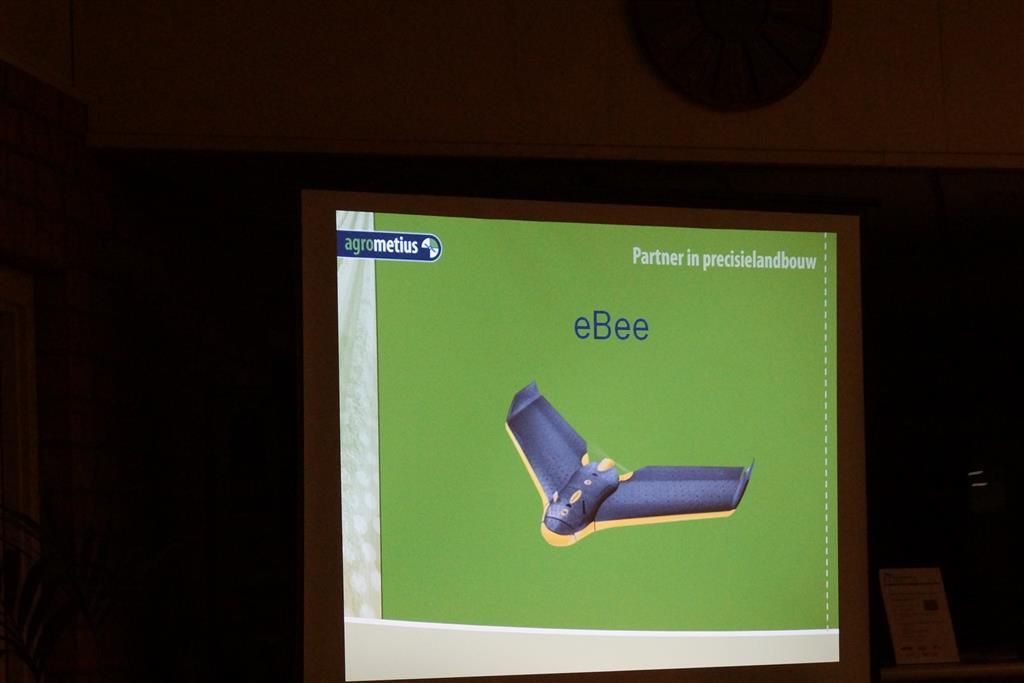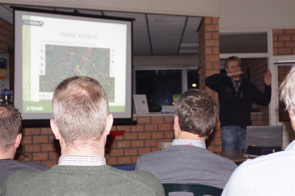 Minne Batenburg van Agrometius gaf deze avond een presentatie over de ontwikkelingen van GPS-besturing en gaf toelichting op het nieuwe TMX 2050 display, dat ontwikkeld is op basis van het populaire Android besturingssysteem en is voorzien van de nieuwste technieken. Ook vertelde hij over en over een nieuw product van Agrometius, GeoBas, een systeem voor klimaatmonitoring, risicomanagment en irrigatiemanagement. en over de Ebee