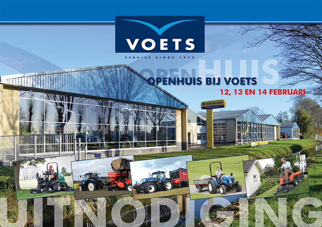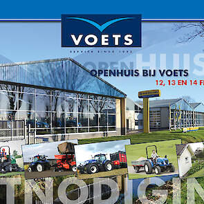 Tijdens de Voets openhuisdagen is er een informatiemarkt en een uniek programma met actuele interessante themas samengesteld. De themas zijn: kringloopwijzer (m.m.v. DLV en Güttler), gifvrij onkruidbeheer (m.m.v. Weedcontrol), elektrische voertuigen en gereedschappen (m.m.v. Goupil, Frisian, Pellenc), precisielandbouw (m.m.v. Vicon iM Farming, New Holland GPS systemen en Agriload weegsystemen), poten tot en met inschuren (m.m.v. DeWulf-Miedema en Struik) en veilig op (de) weg (m.m.v. Cumela en de Nationale politie). Tevens kan de nieuwe loods worden bezichtigd en uiteraard staat het hele programma aan producten uitgestald. U bent van harte welkom op donderdag 12 en vrijdag 13 februari van 14.00 uur tot 21.00 uur en op zaterdag 14 februari van 14.00 uur tot 17.00 uur.