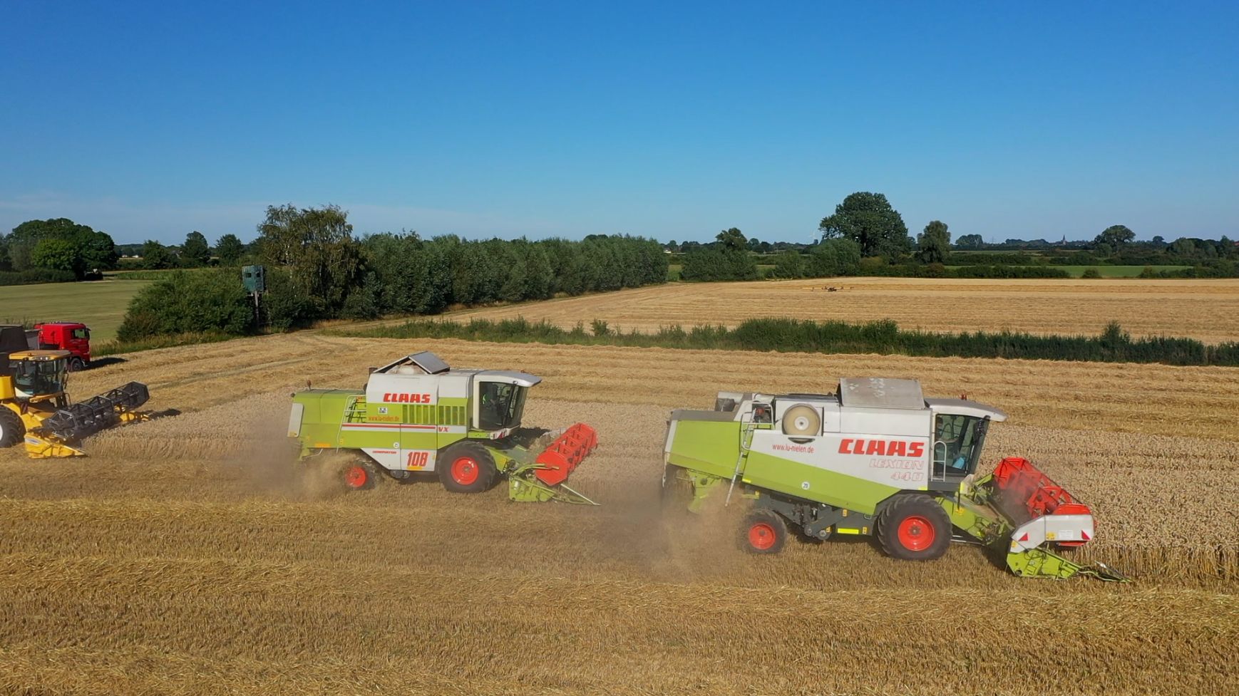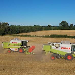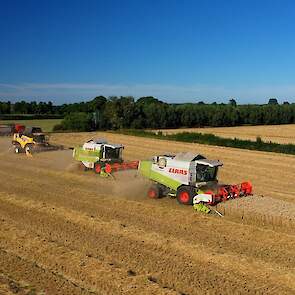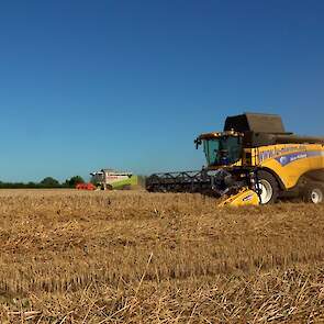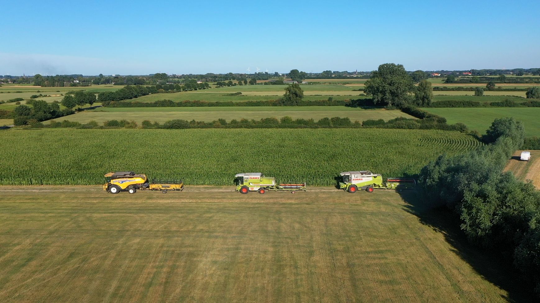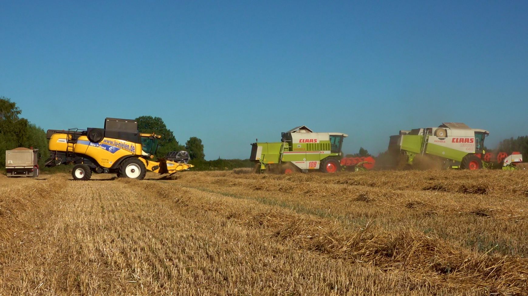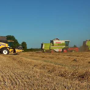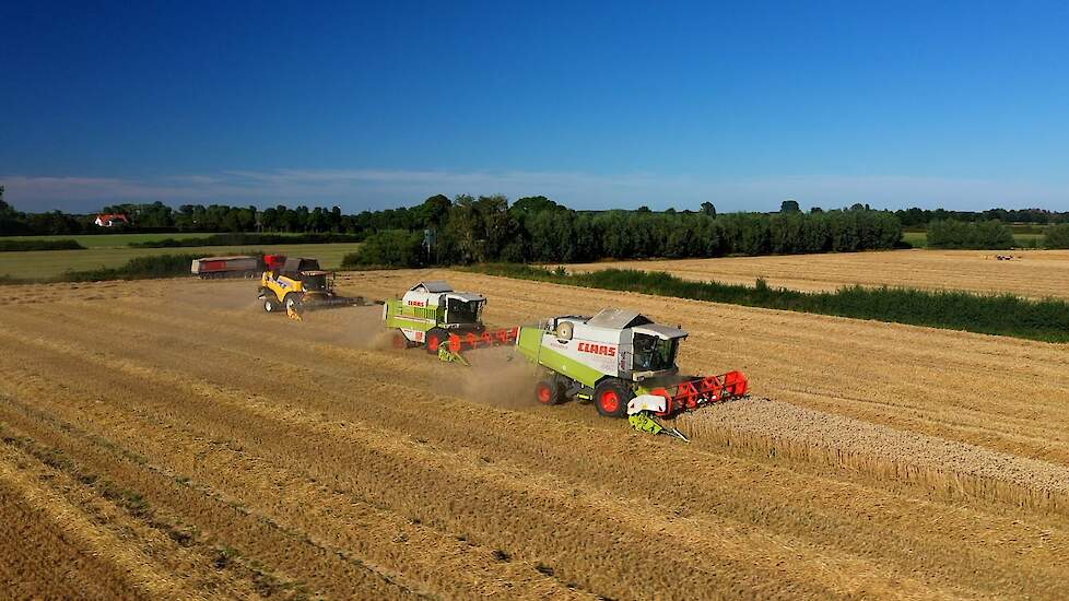 Hier zien we loonbedrijf Nielen met twee Claas-combines, een Dominator 108 en een Lexion 440, achtervolgd worden door een New Hollland CX.