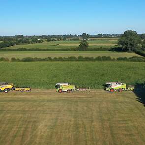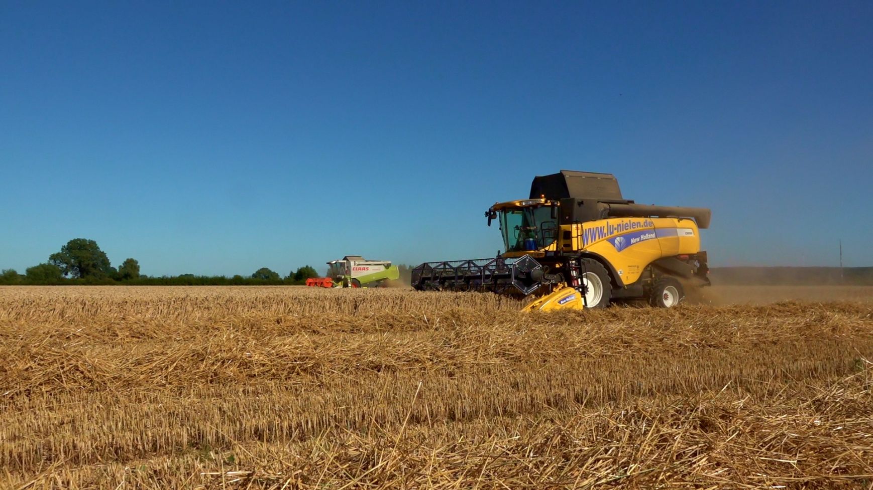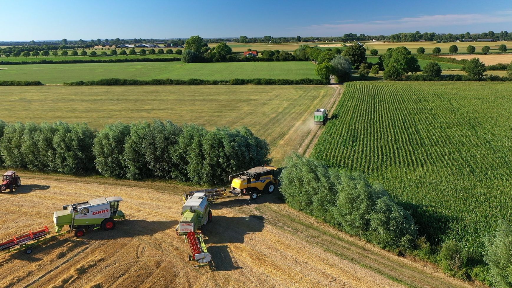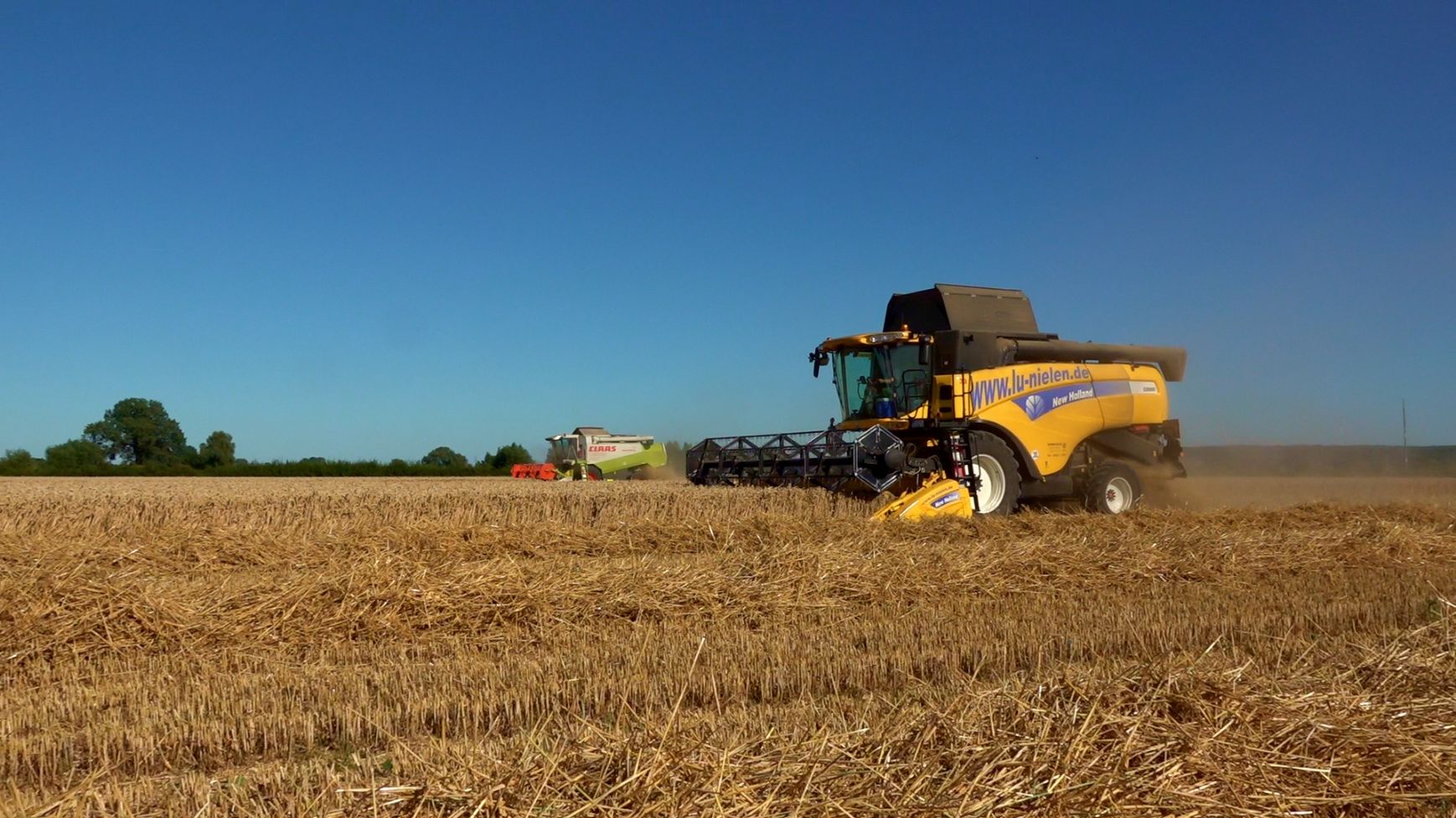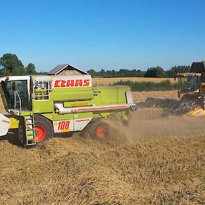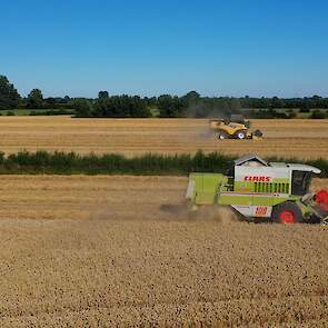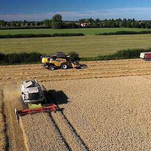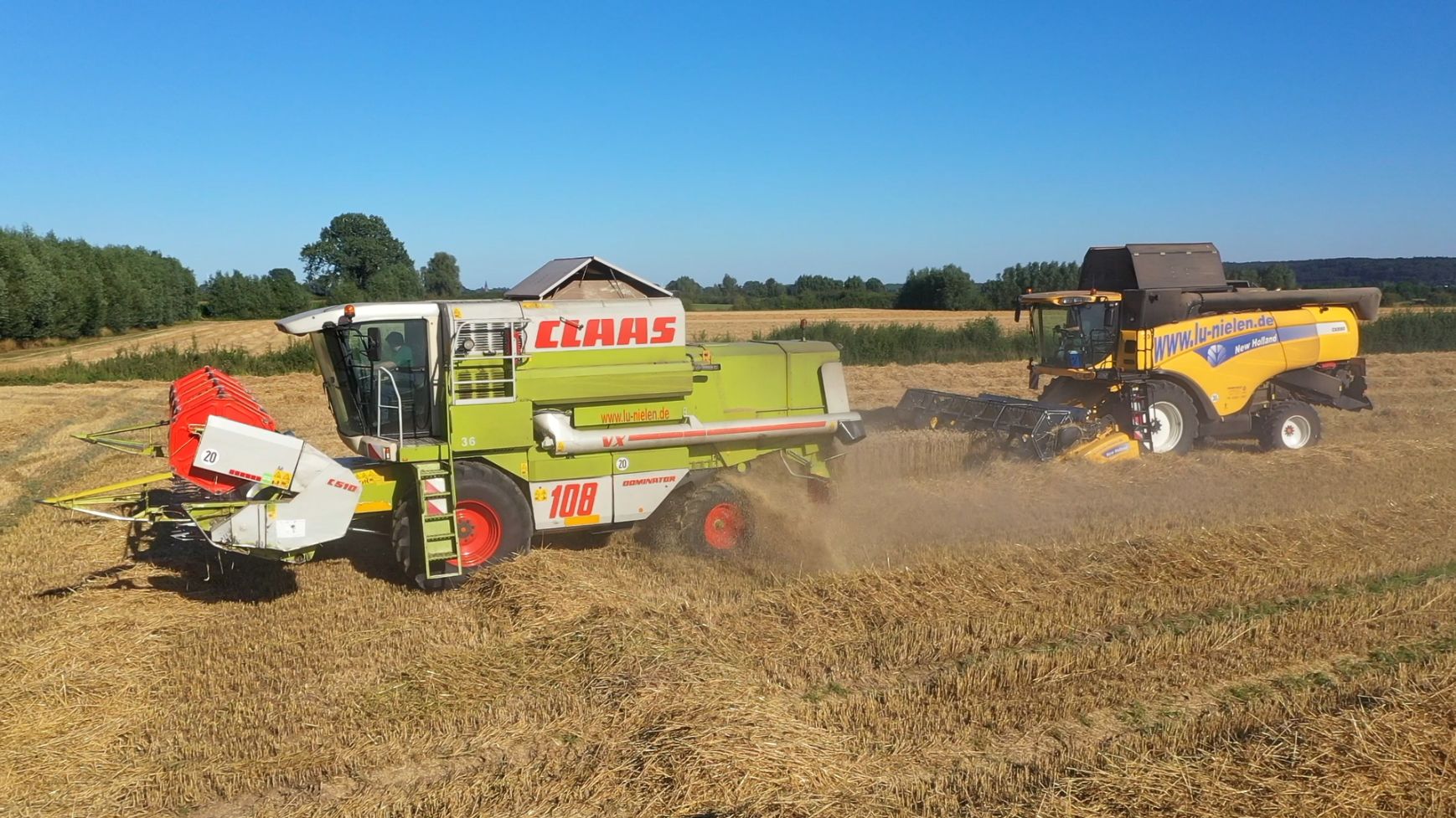 Hier zien we loonbedrijf Nielen met twee Claas-combines, een Dominator 108 en een Lexion 440, achtervolgd worden door een New Hollland CX.