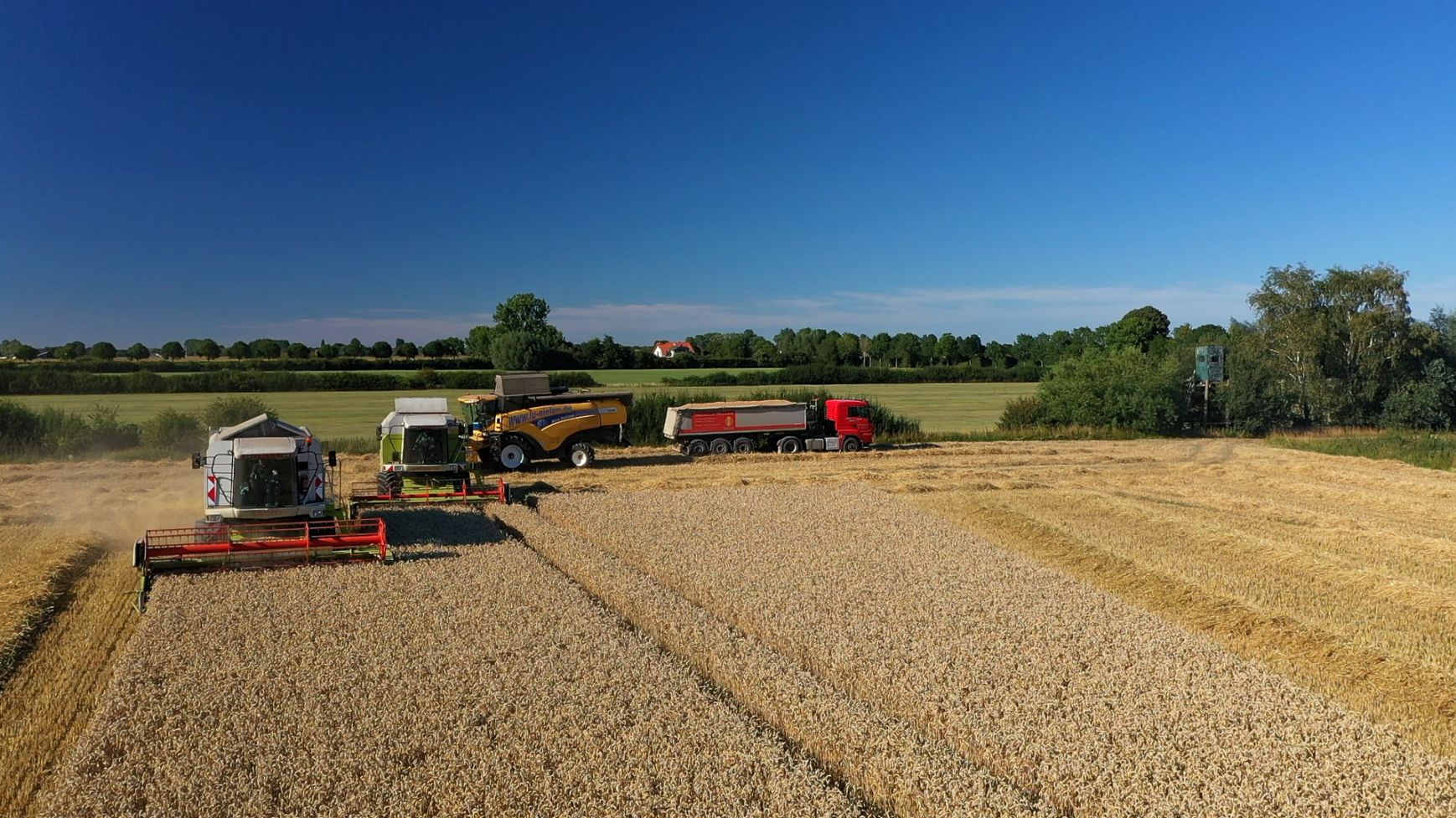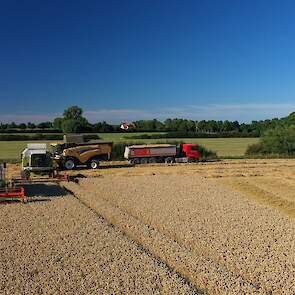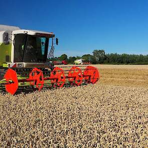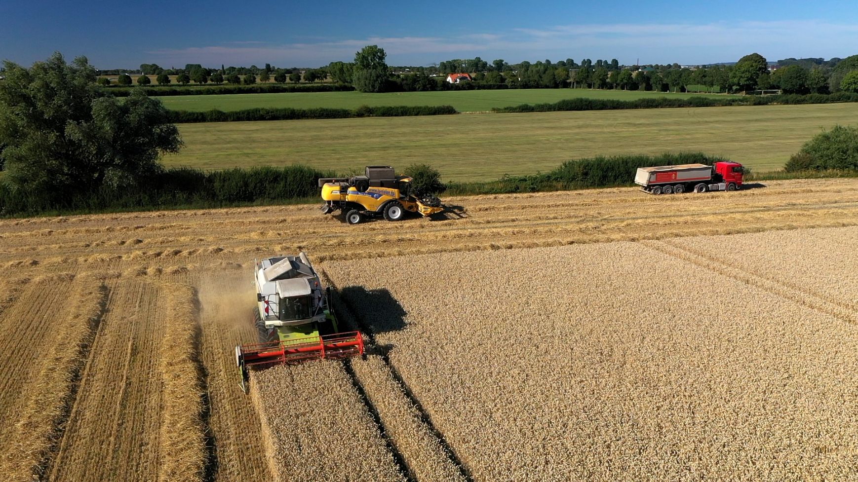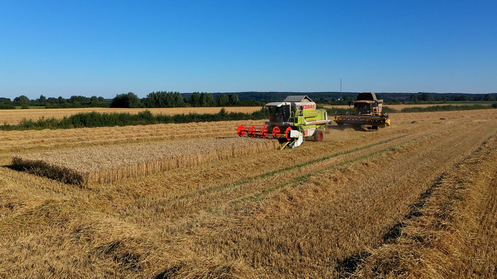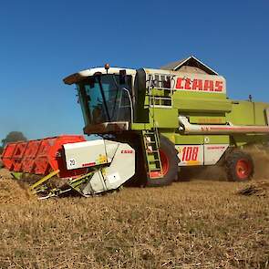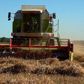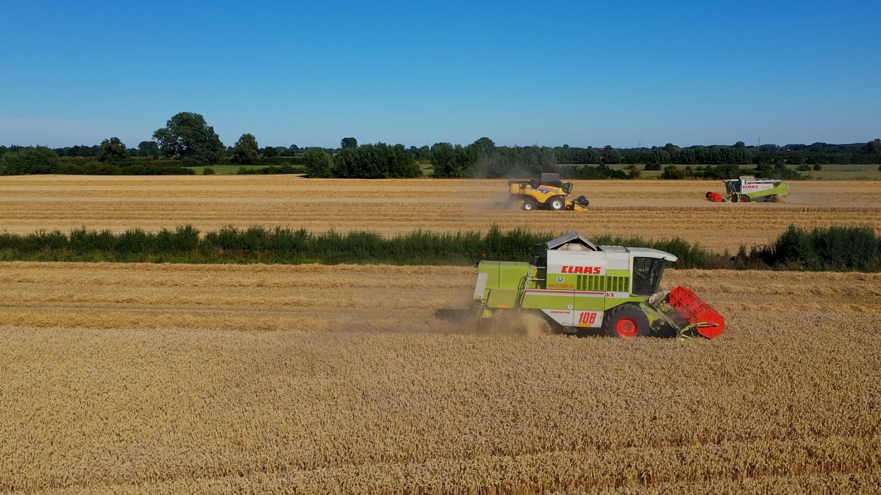 Hier zien we loonbedrijf Nielen met twee Claas-combines, een Dominator 108 en een Lexion 440, achtervolgd worden door een New Hollland CX.