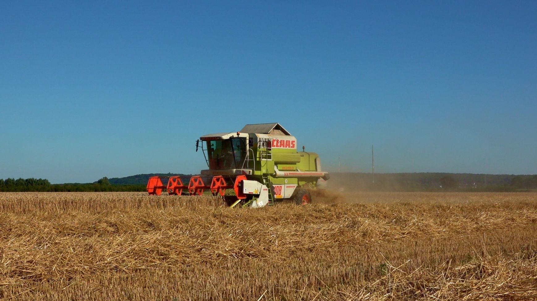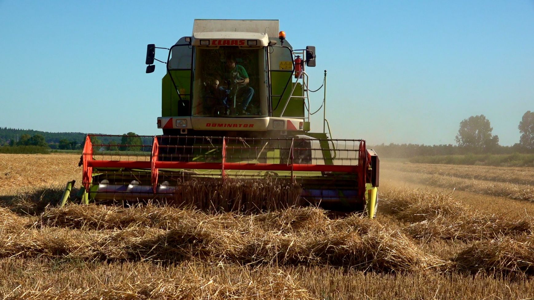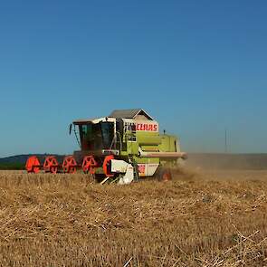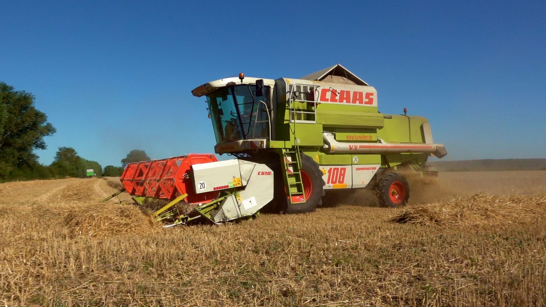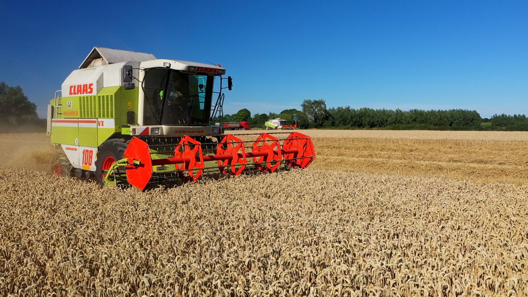 Hier zien we loonbedrijf Nielen met twee Claas-combines, een Dominator 108 en een Lexion 440, achtervolgd worden door een New Hollland CX.