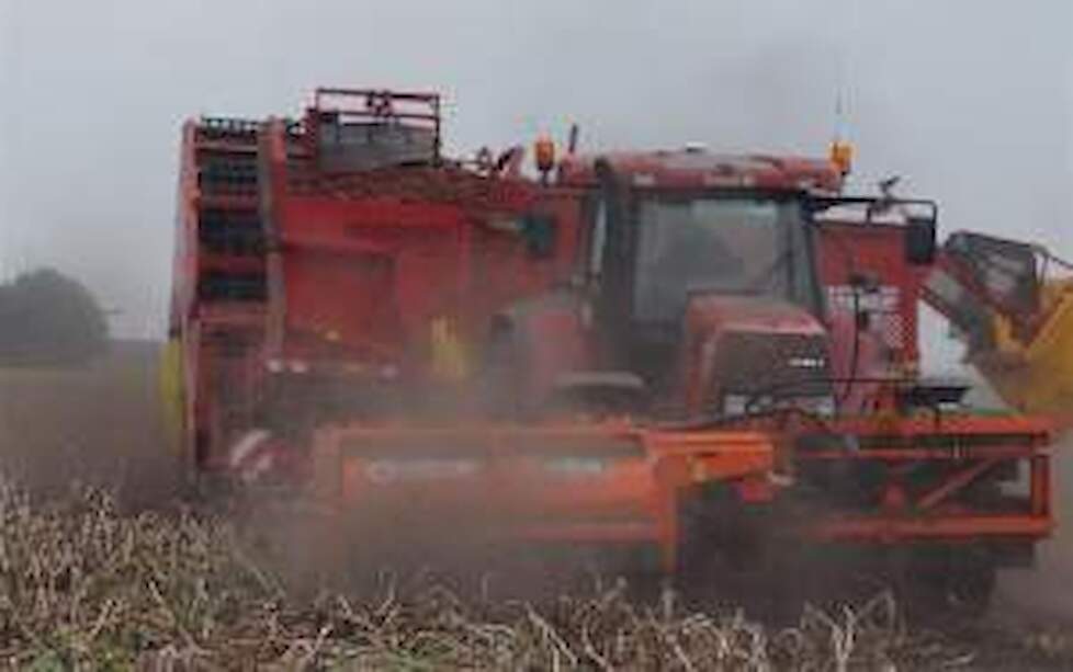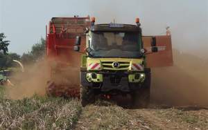 Unimog U530 met Grimme SE 150-60 aan het aardappel