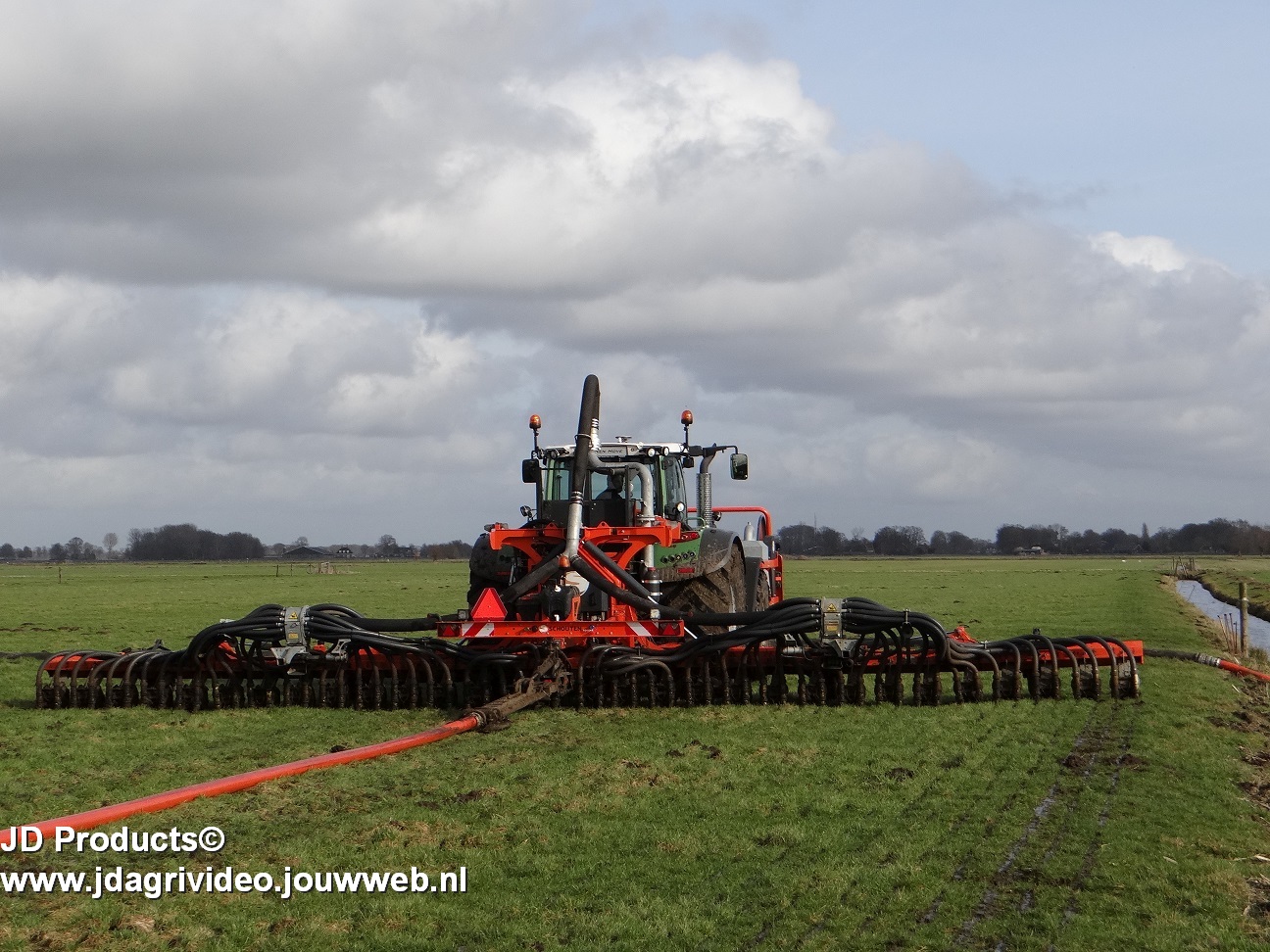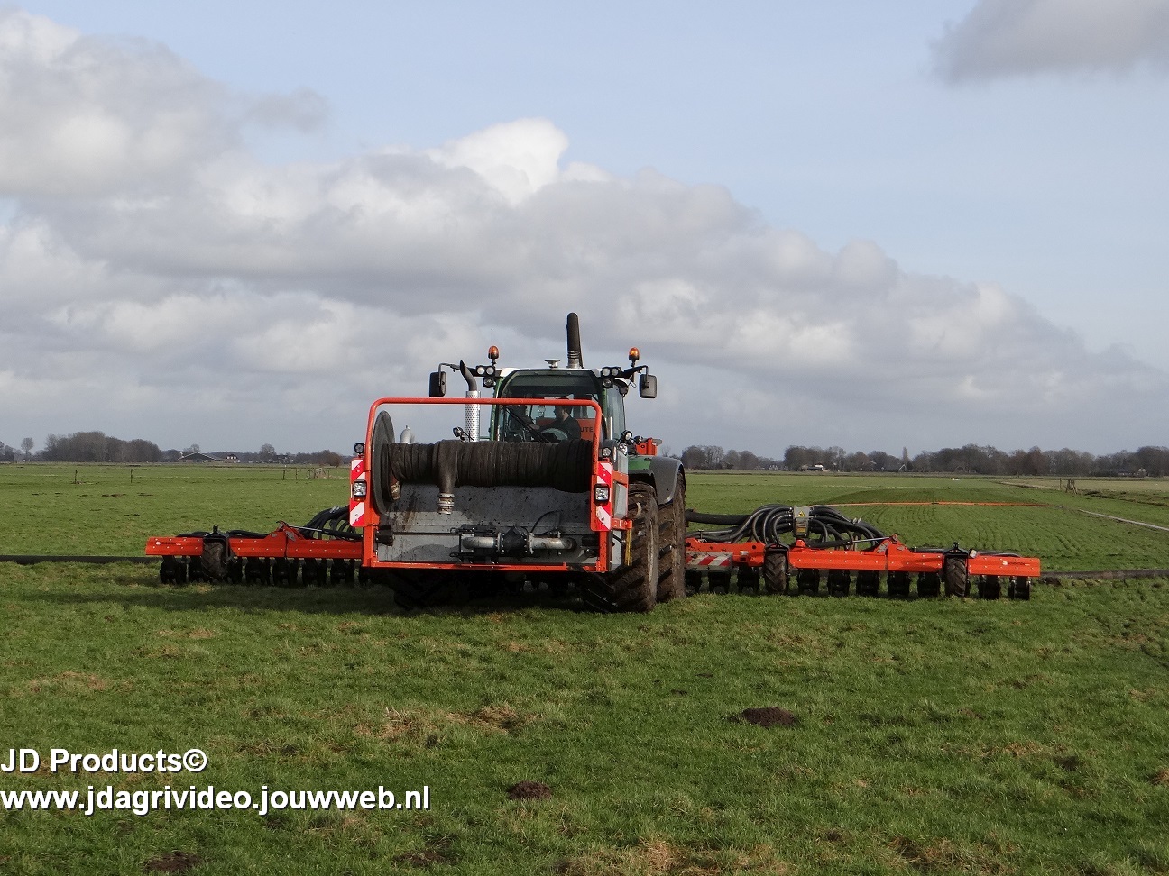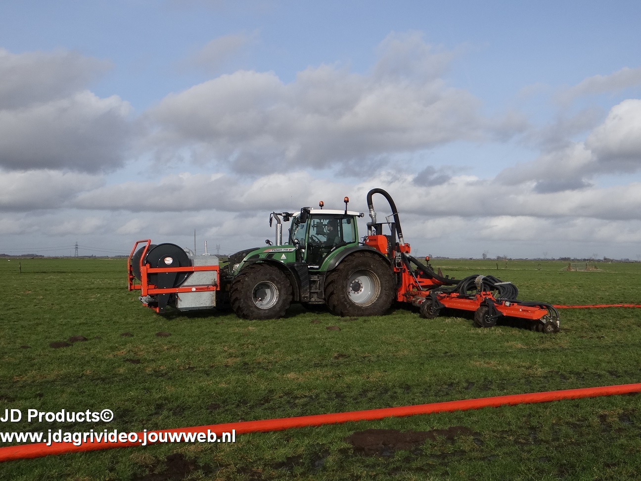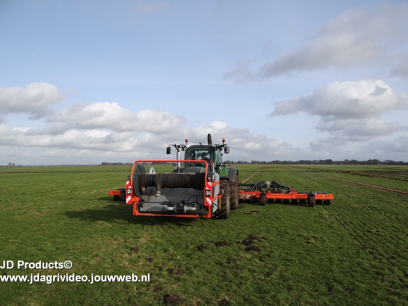 Loonbedrijf ten Hove uit Kamperveen aan het sleepslang bemesten in Oosterwolde met een Fendt 718 met een Schouten bemester.