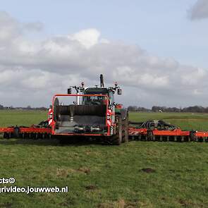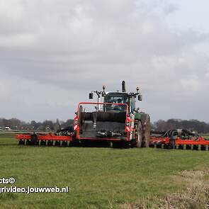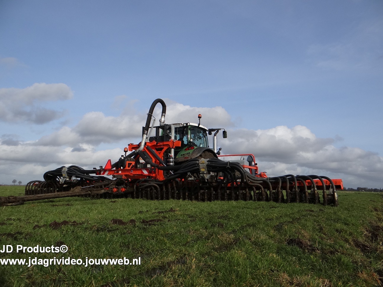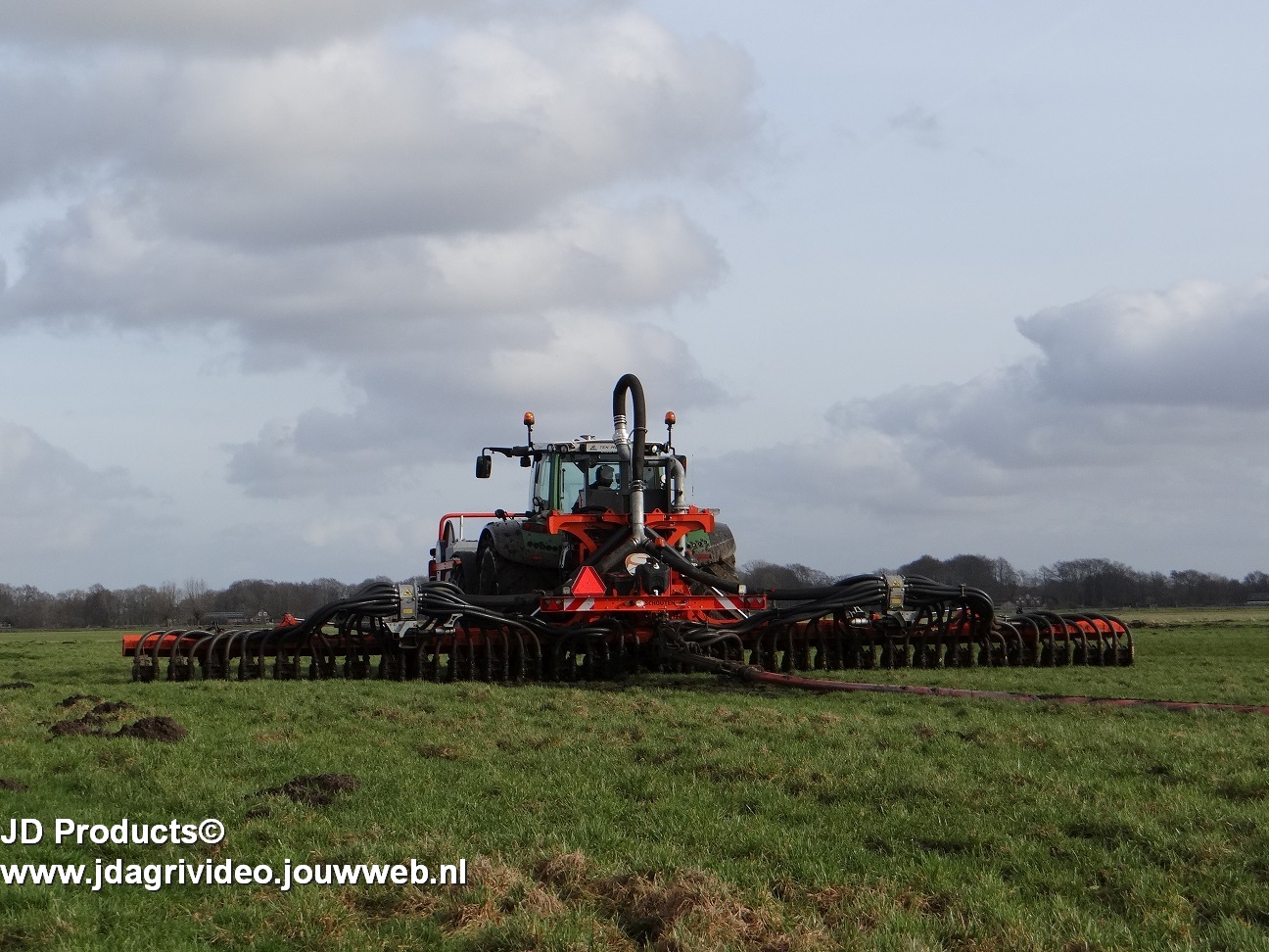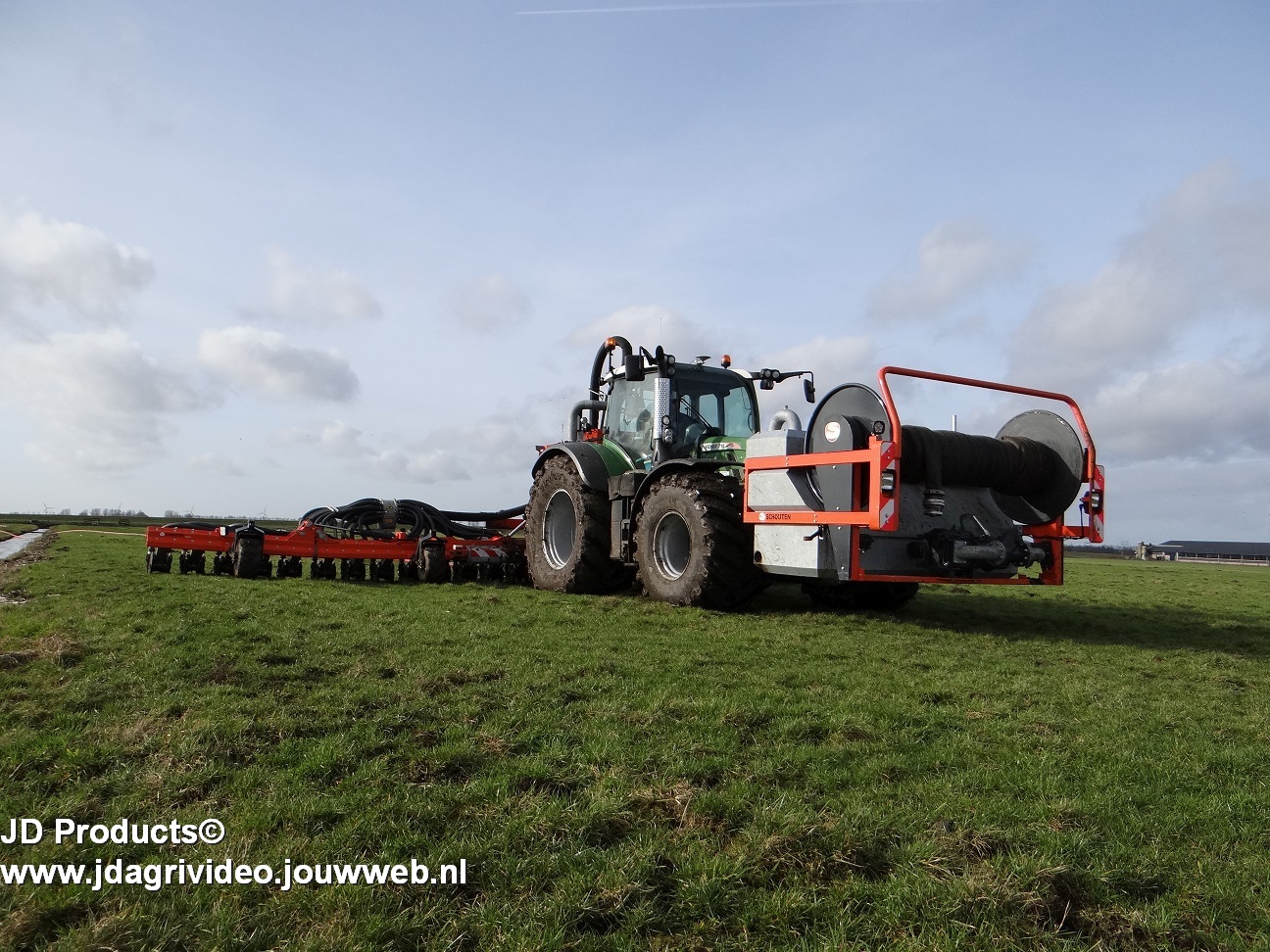 Loonbedrijf ten Hove uit Kamperveen aan het sleepslang bemesten in Oosterwolde met een Fendt 718 met een Schouten bemester.