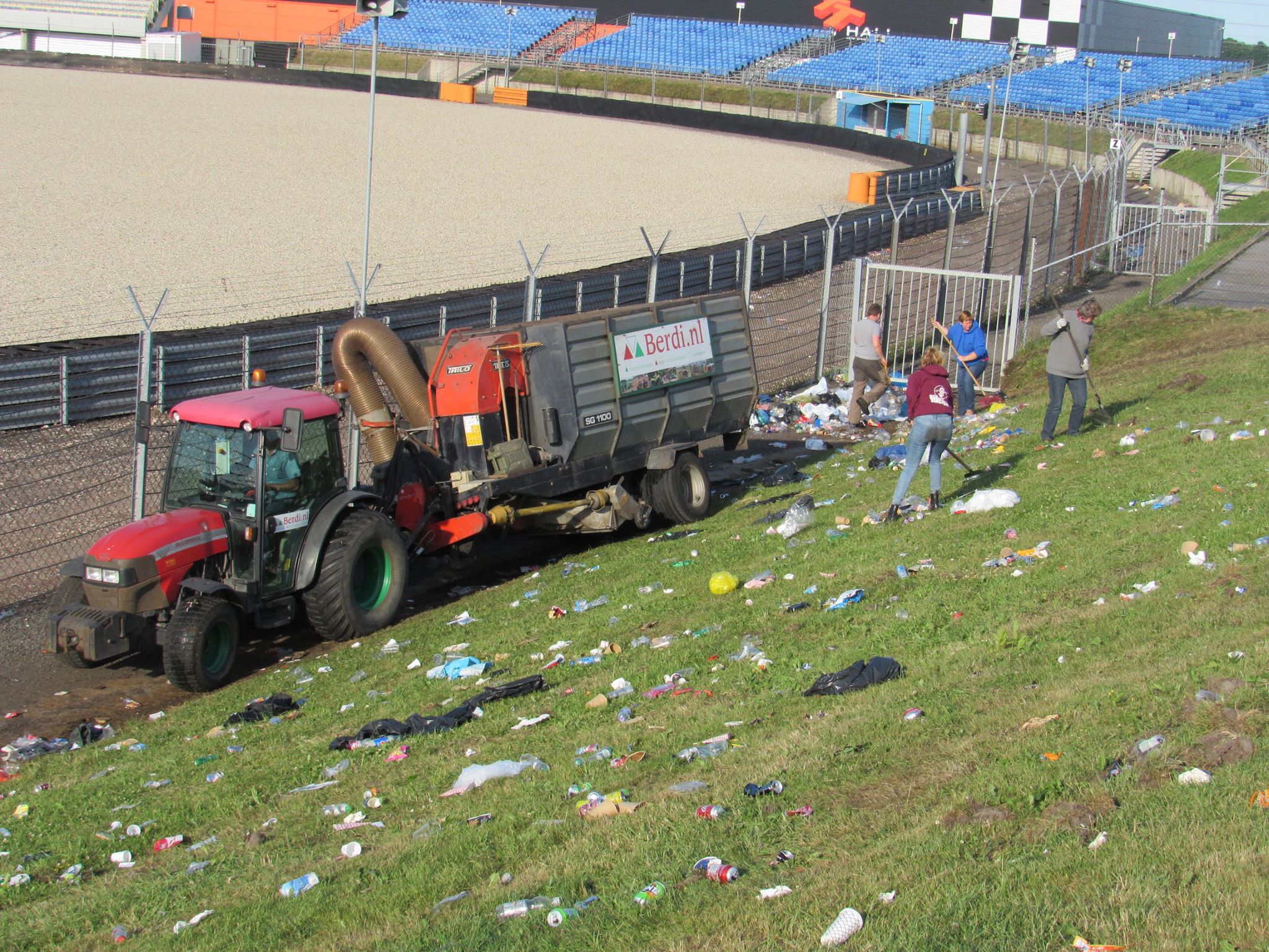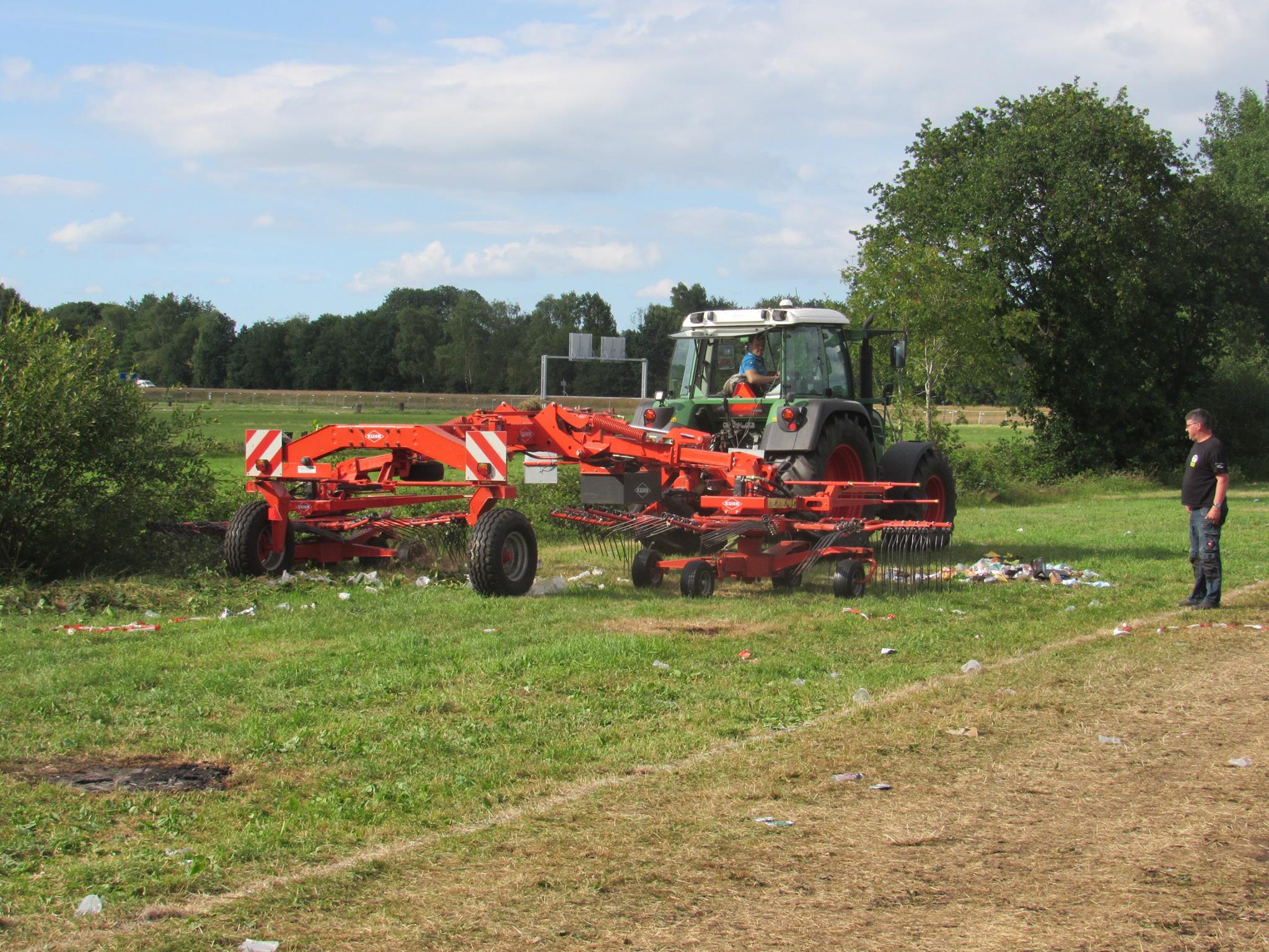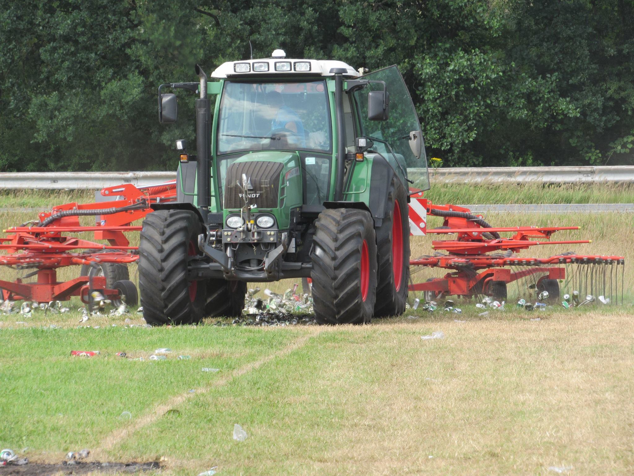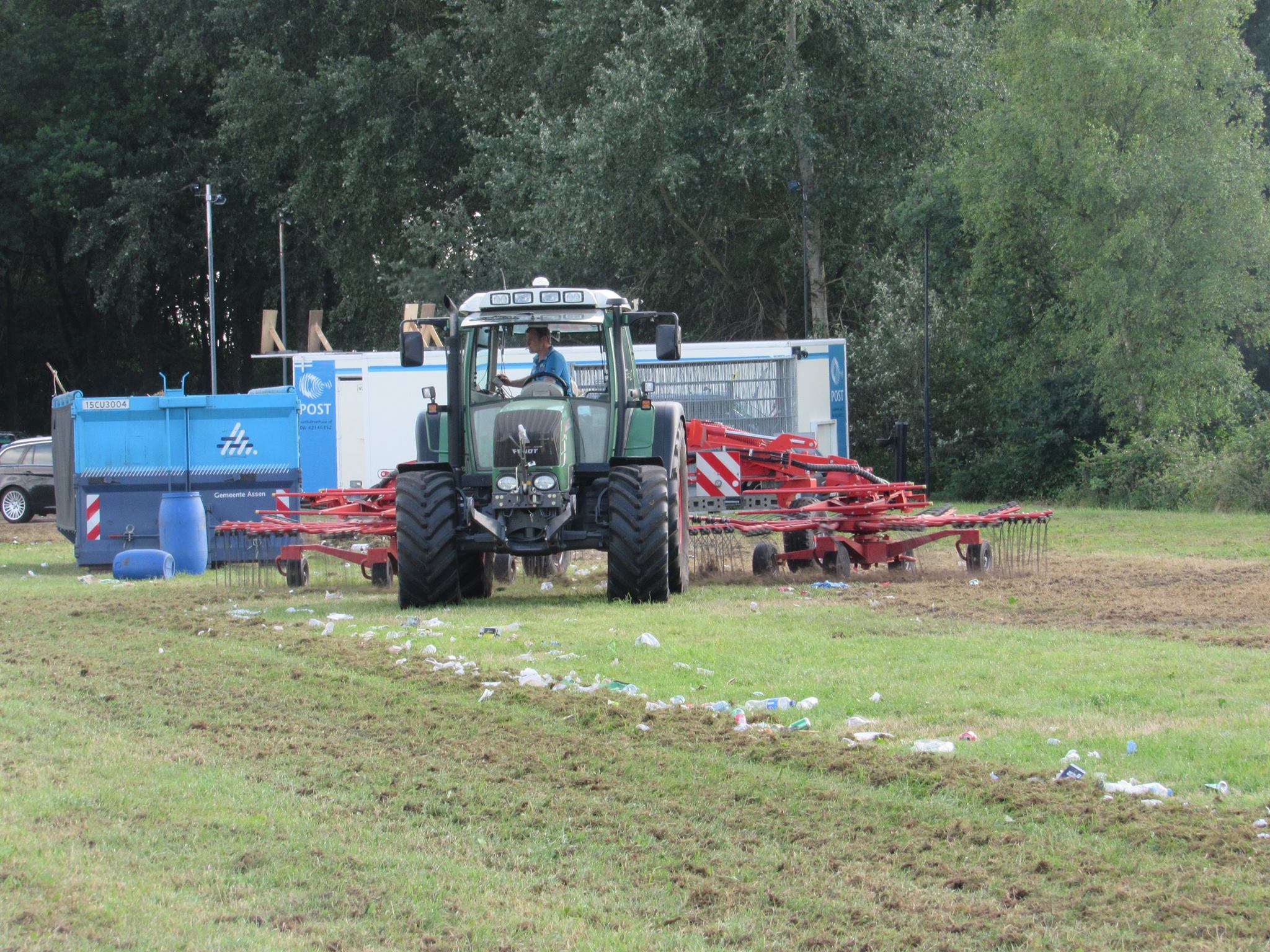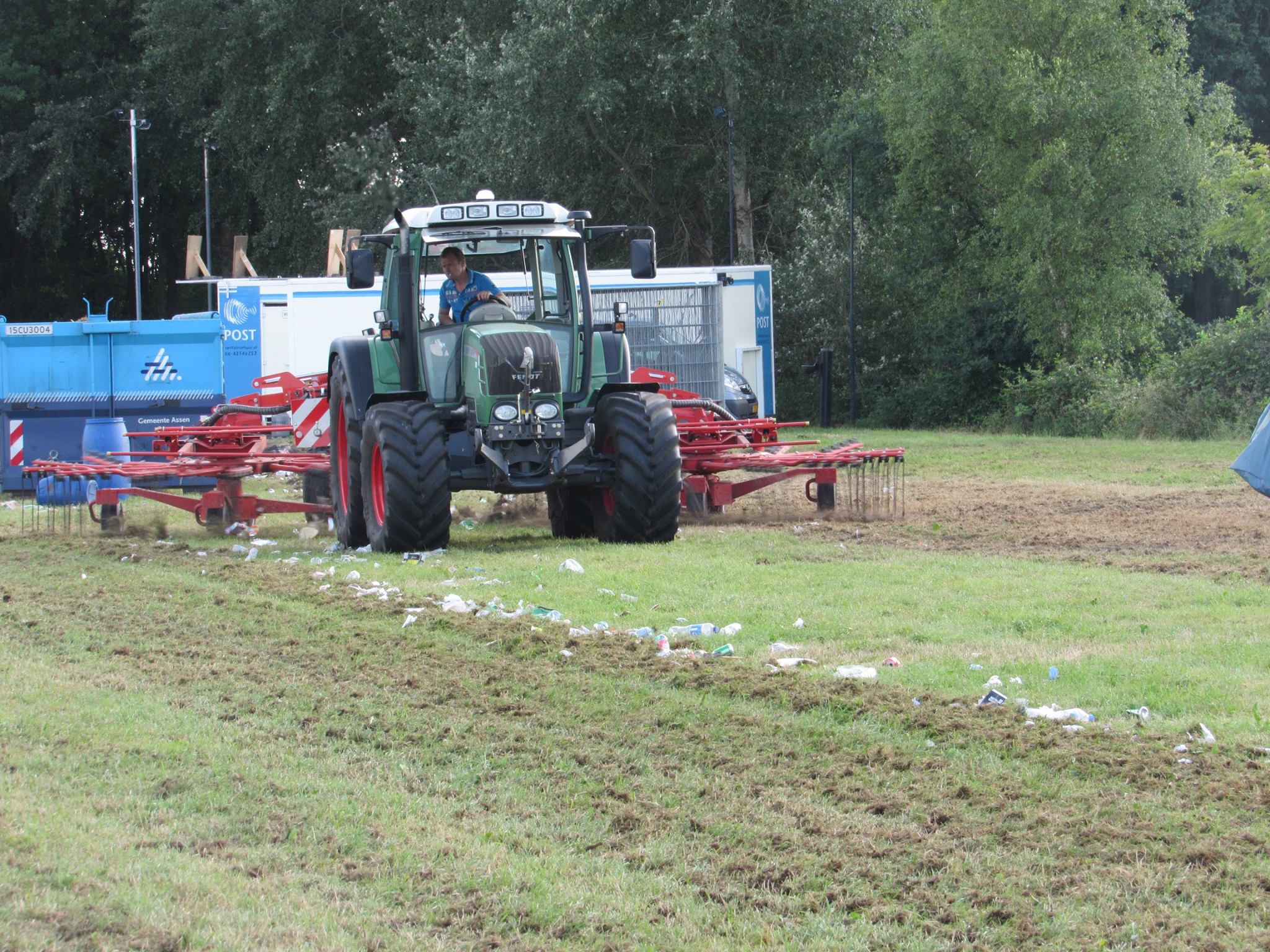 Wat je al niet kunt doen met een Kuhn hark .hier worden de bierblikjes bijmekaar geharkt die op het terrein zijn blijven liggen nade Dutch TT in assen