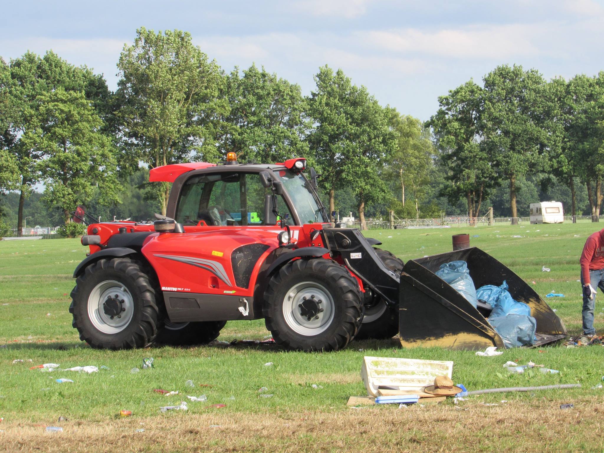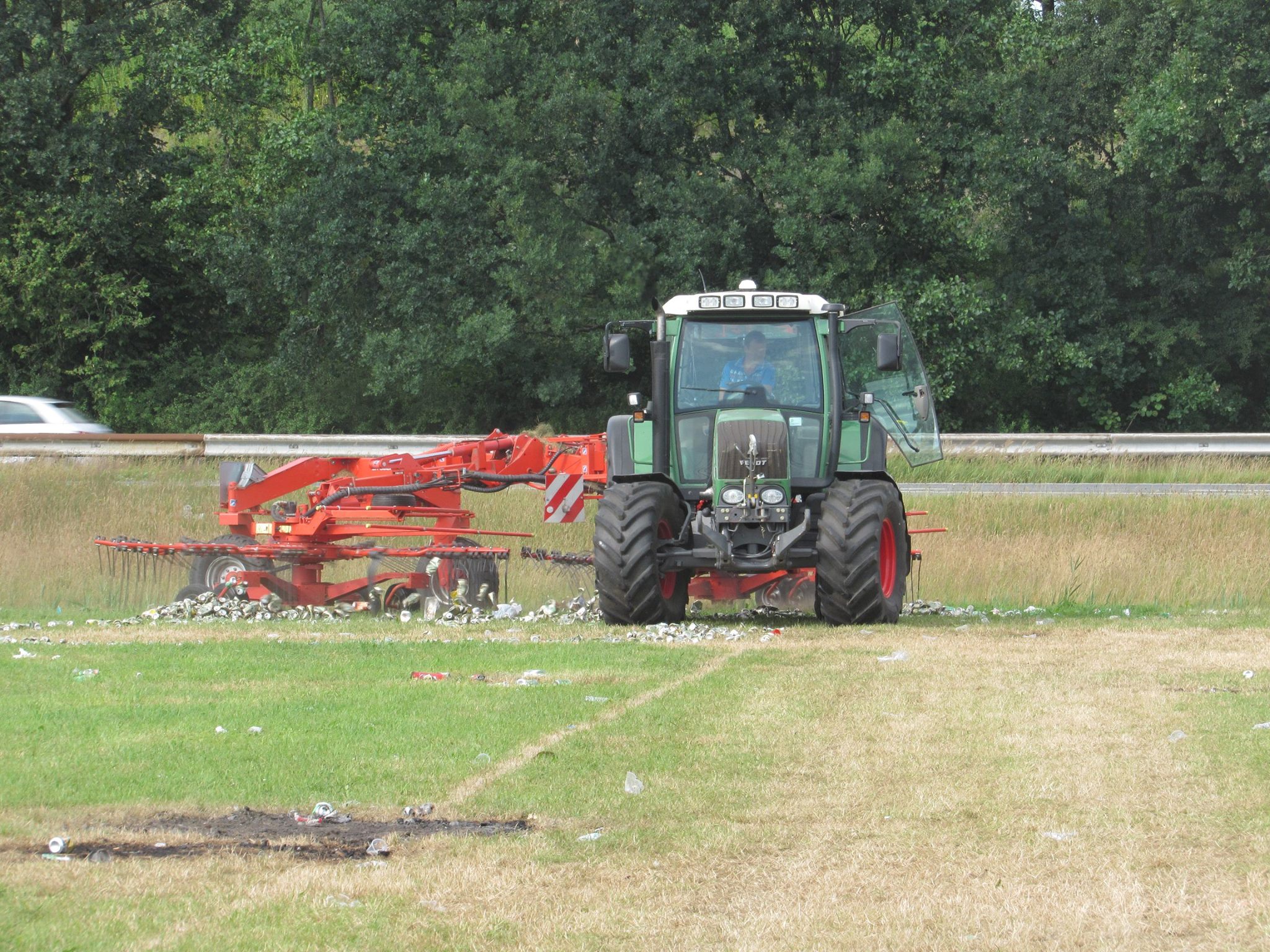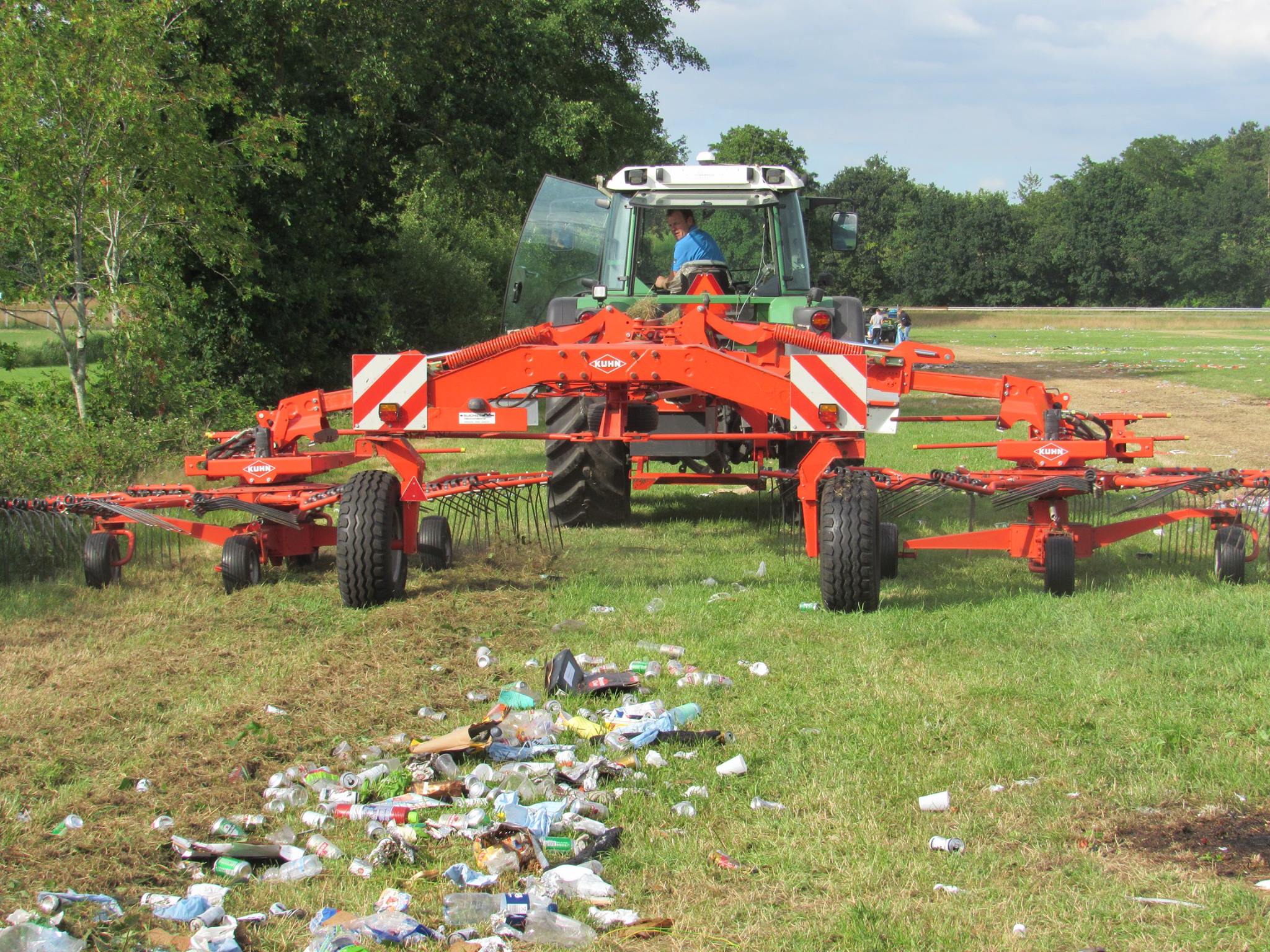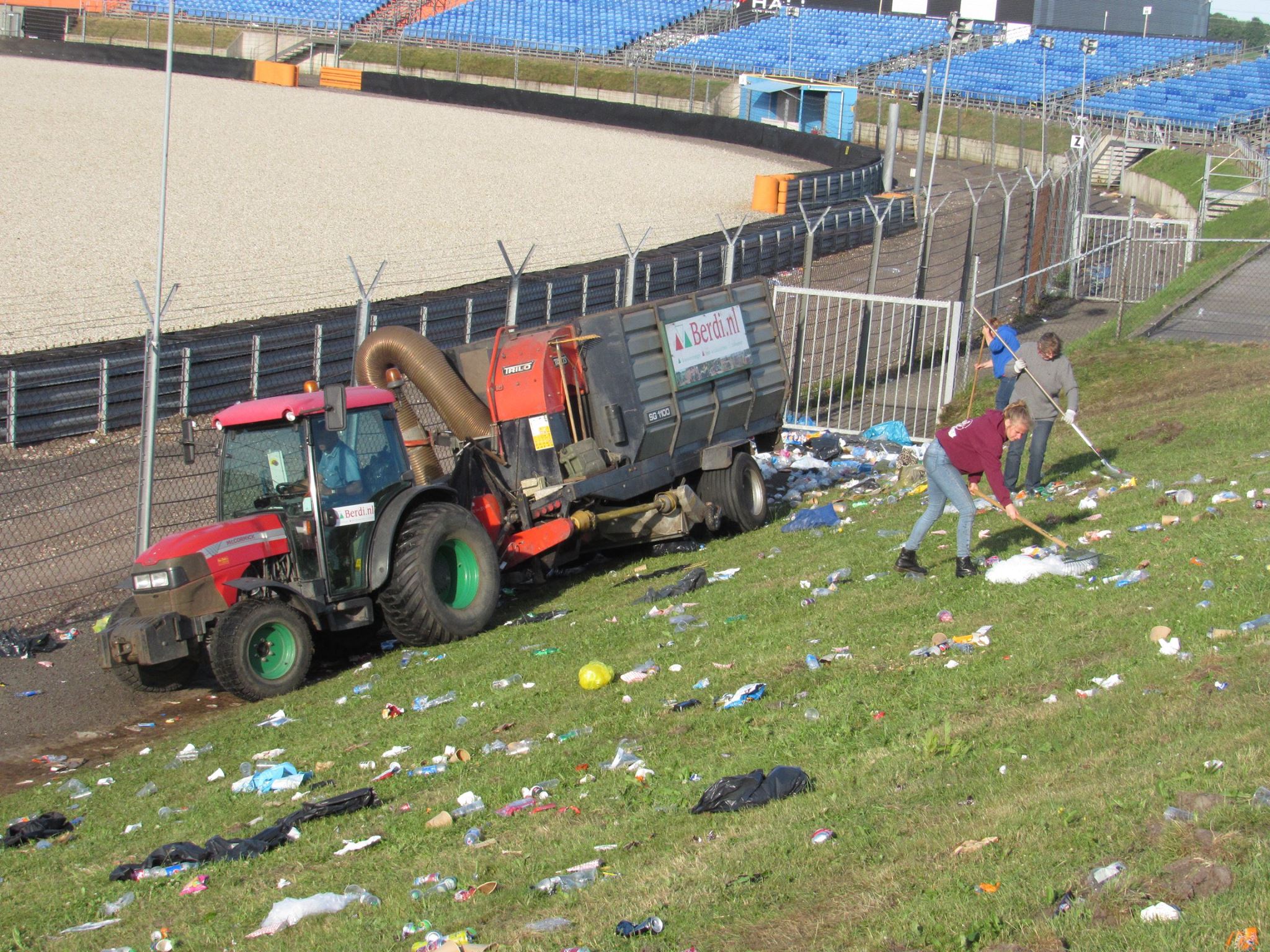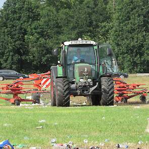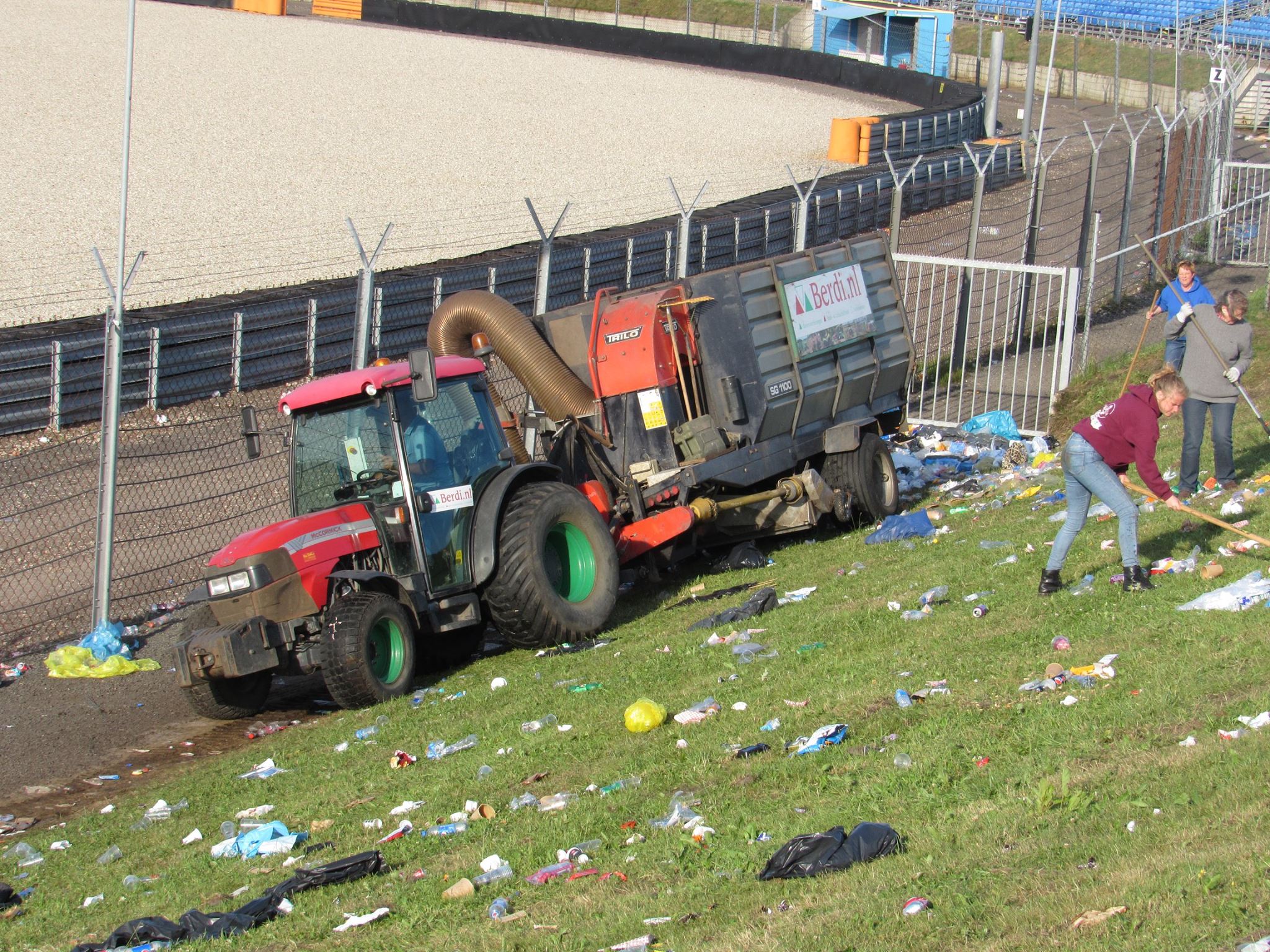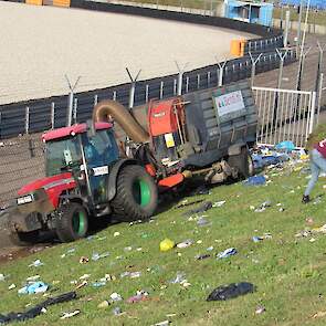 Wat je al niet kunt doen met een Kuhn hark .hier worden de bierblikjes bijmekaar geharkt die op het terrein zijn blijven liggen nade Dutch TT in assen