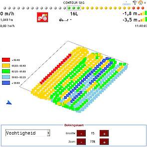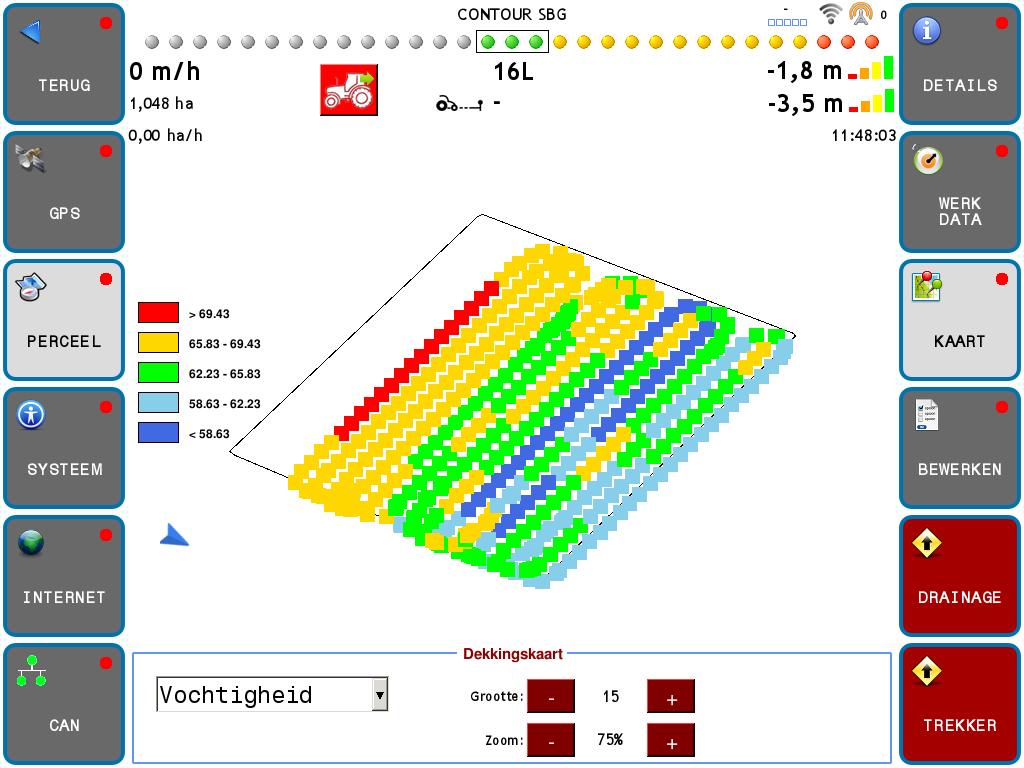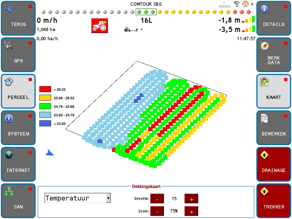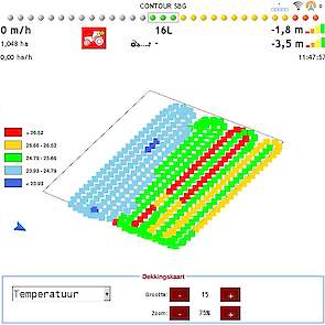 Het SBG weerstation logt en karteert temperatuur en luchtvochtigheid. De sensor is standaard uitgerust met een magneet, zodat de klant de sensor op elke gewenste plek kan plaatsen. Middels een standaard USB aansluiting is de kabel eenvoudig te verlengen zodat de sensor eventueel op een werktuig of tussen het gewas kunt plaatsen. In SBGuidance is de meetwaarde af-te-lezen, zie figuur 1. Na het laden van een perceel (A-B lijn) begint het karteren