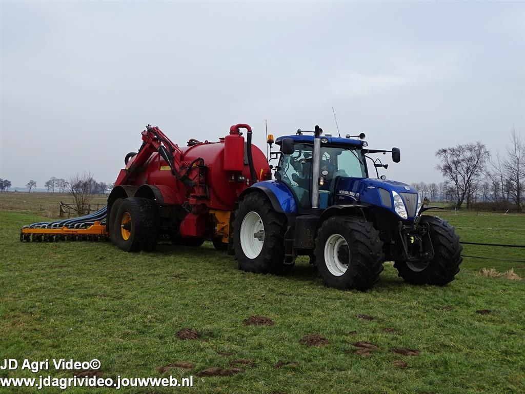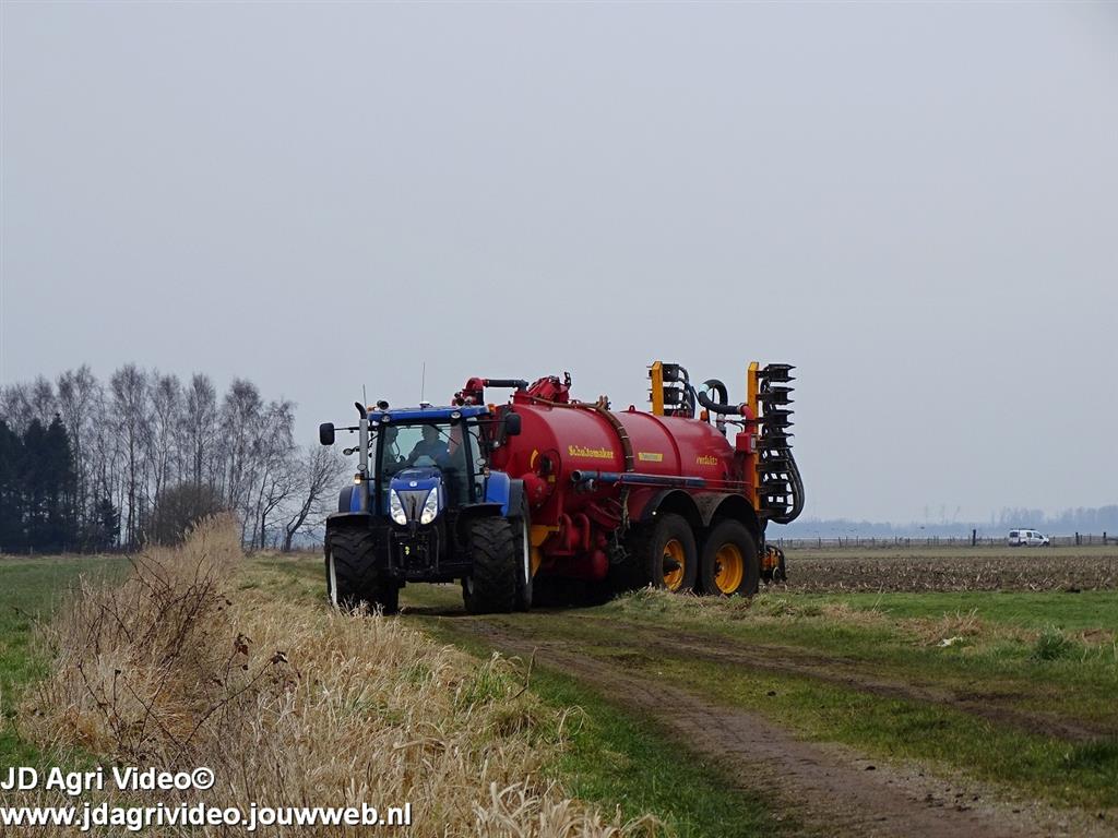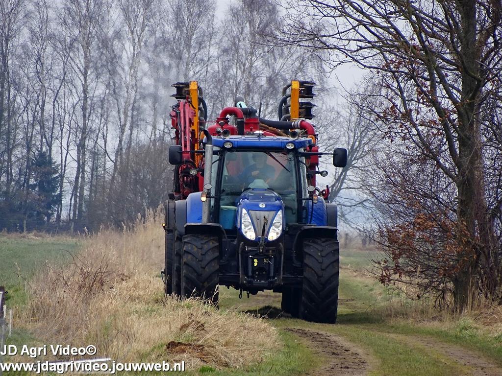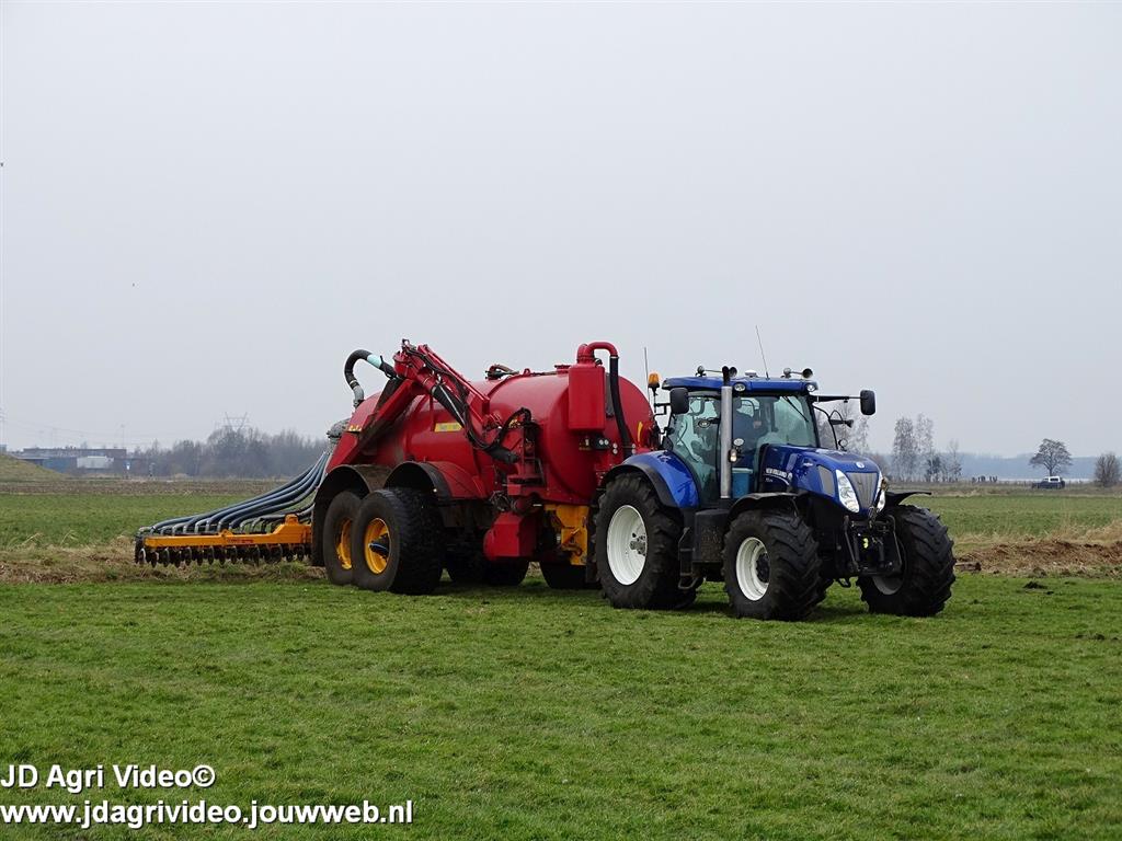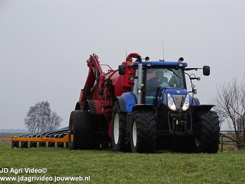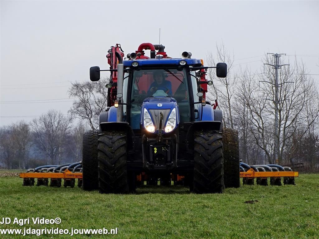 Loonbedrijf van Klompenburg uit Hulshorst aan het mest injecteren met een New Holland T7.270 Blue Power met een Schuitemaker Perfecta mesttank en Veenhuis bemester.