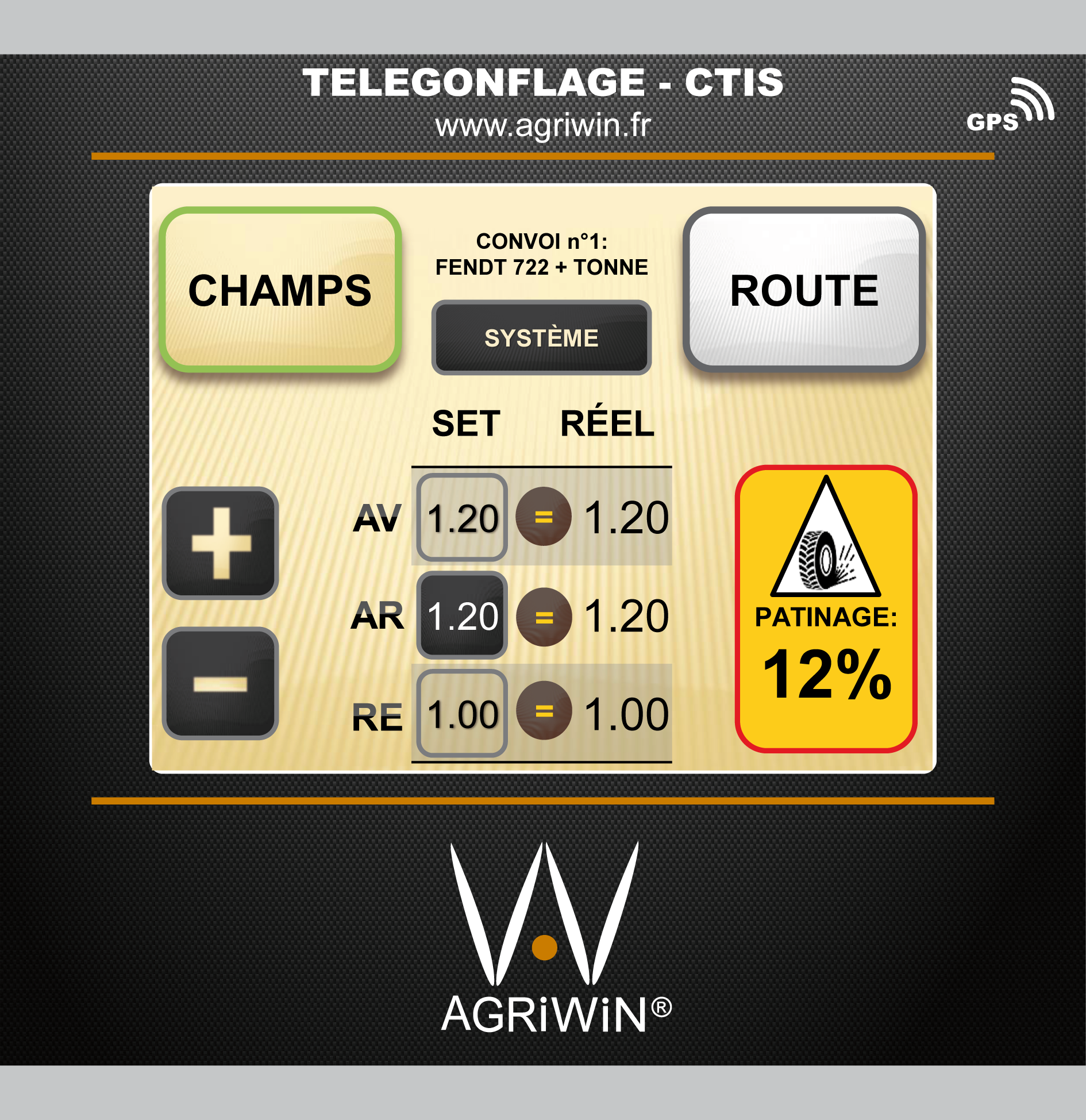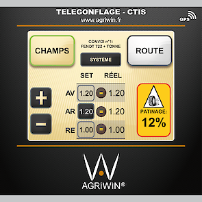 Het bandendrukwissel systeem van AGRIWIN is standaard voorzien van een GPS module waardoor het percentage slip continu gemeten wordt en een signalering optreedt als het ingestelde percentage wordt overschreden. Door vooraf in geprogrammeerde bandenspanningen kan van alle assen afzonderlijk door één druk op het Touch screen de spanning veranderd worden van veld naar transportwerk (of andersom). Het systeem is ook voor ISO Bus beschikbaar.