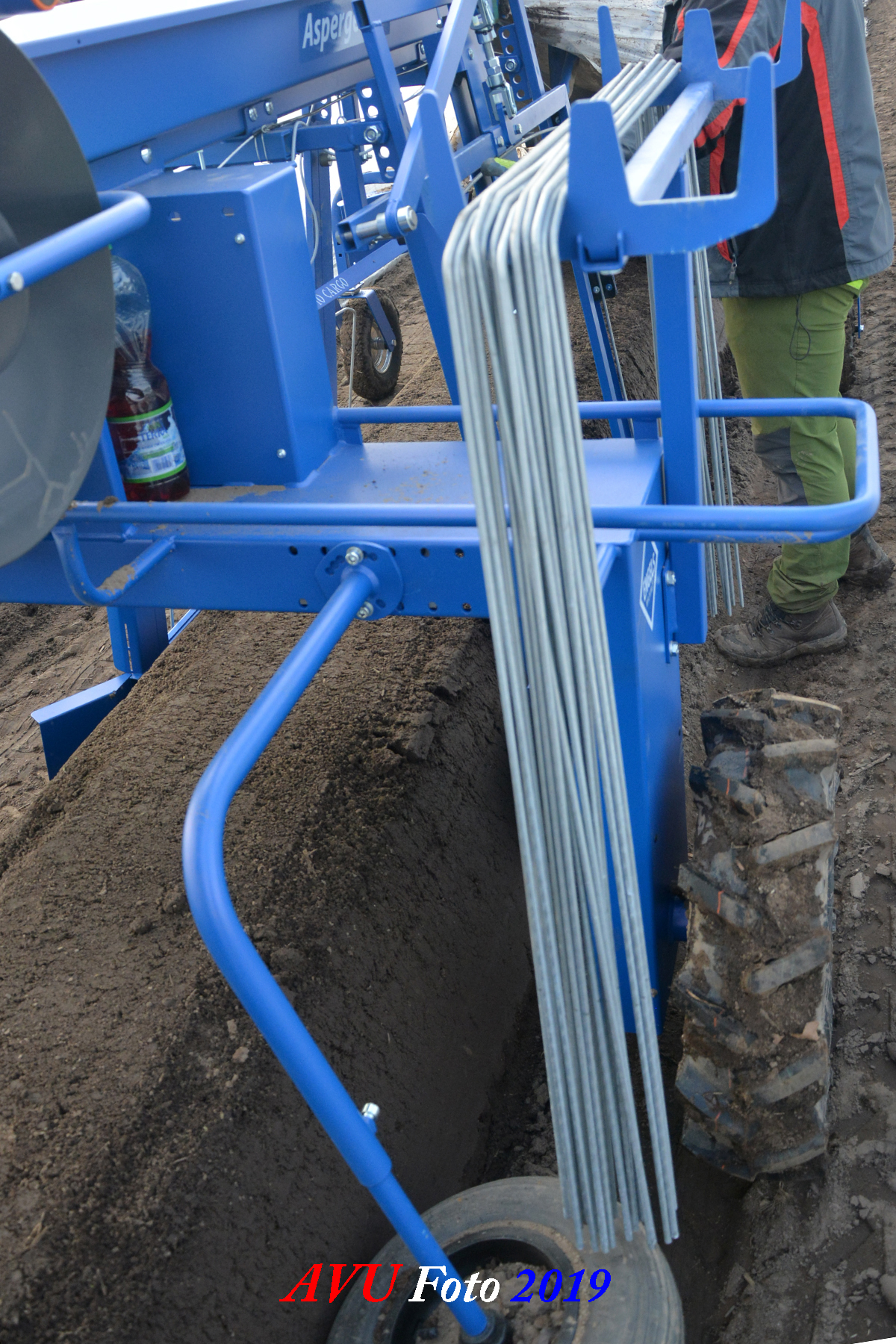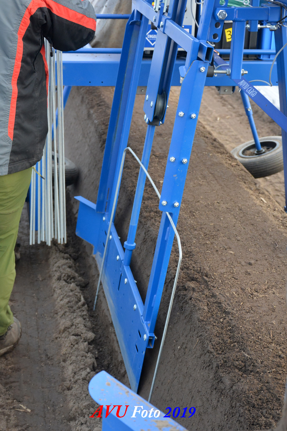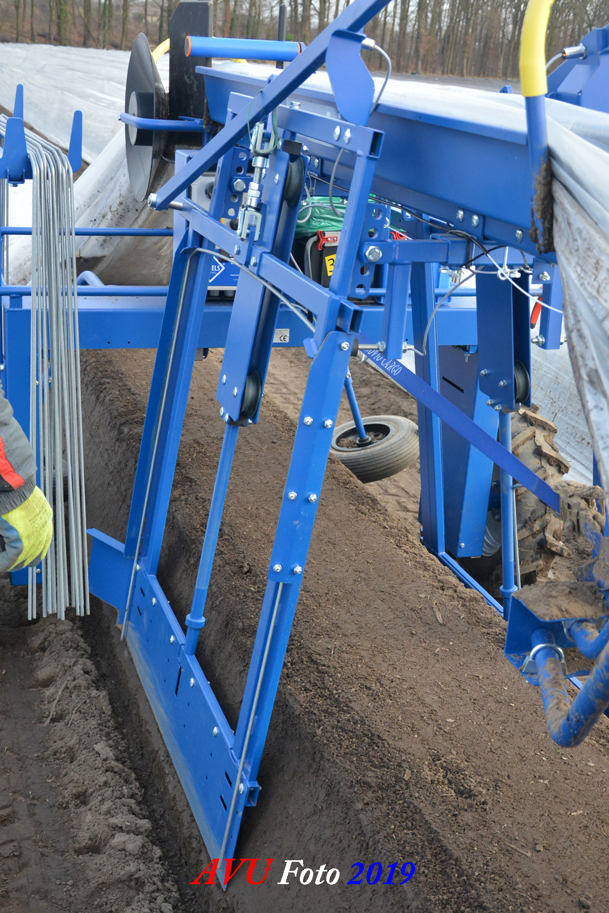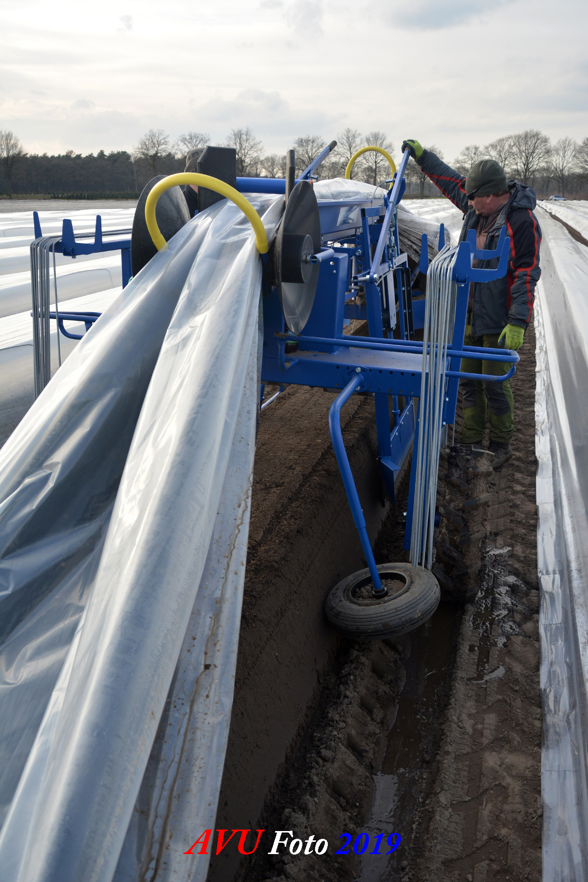Men kan de tunnels met behulp van deze nieuwe Engels MBZ (M-Bogen Zetmachine) machine plaatsen. De door een accu aangedreven unit plaatst de vooraf gebogen staven in een hulpframe om ze later in de grond te persen. Hierdoor komt er extra ruimte vrij boven de aspergeruggen welke extra opgewarmd kan worden door de zonnestralen. De verhoging is duidelijk te zien op de foto. Reageren mag.