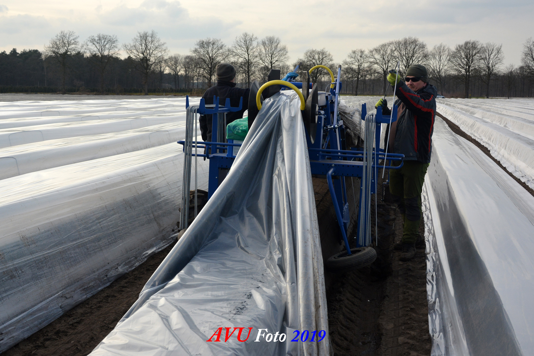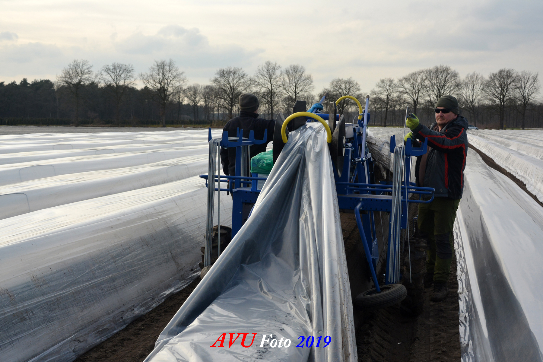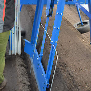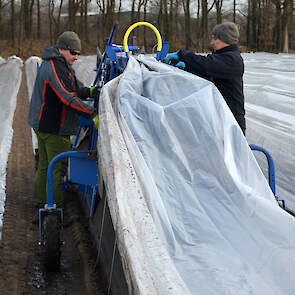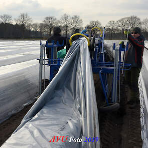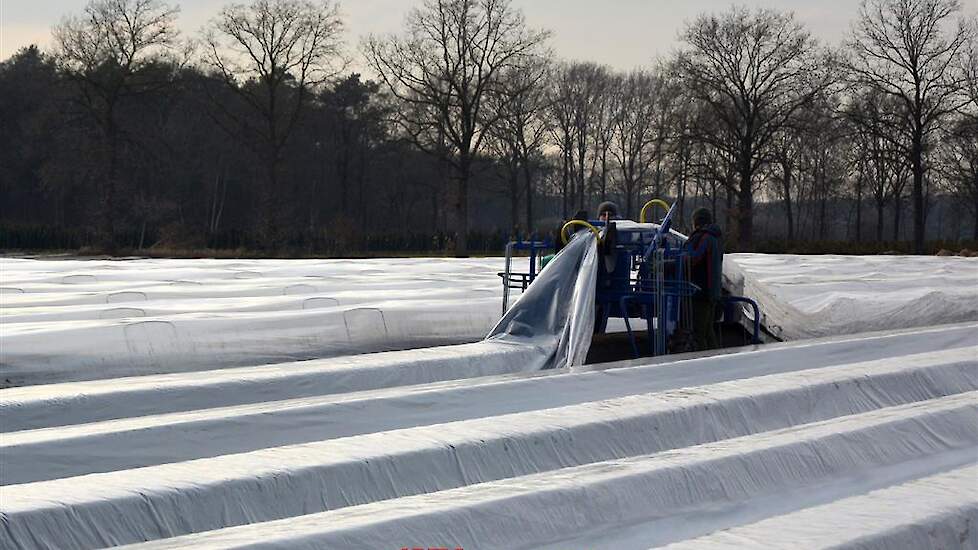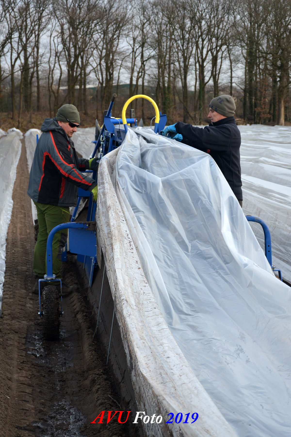 Men kan de tunnels met behulp van deze nieuwe Engels MBZ (M-Bogen Zetmachine) machine plaatsen. De door een accu aangedreven unit plaatst de vooraf gebogen staven in een hulpframe om ze later in de grond te persen. Hierdoor komt er extra ruimte vrij boven de aspergeruggen welke extra opgewarmd kan worden door de zonnestralen. De verhoging is duidelijk te zien op de foto. Reageren mag.