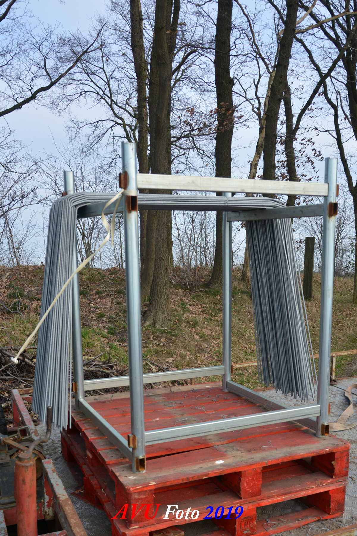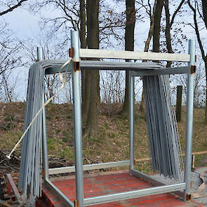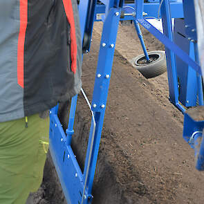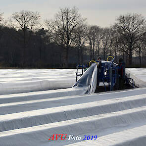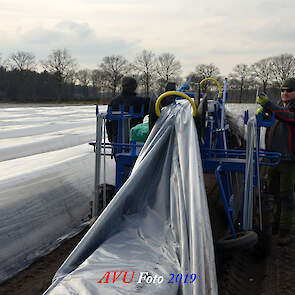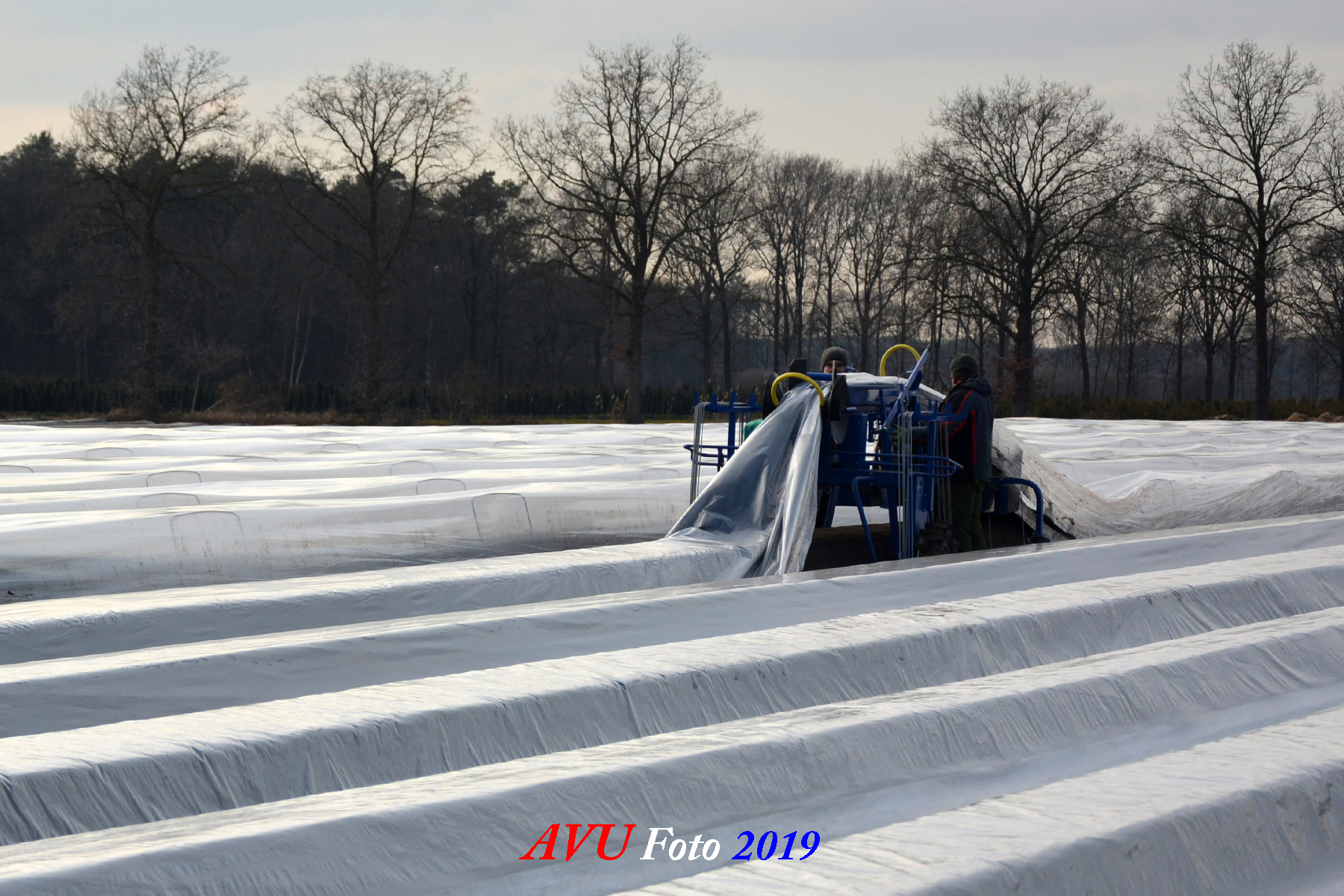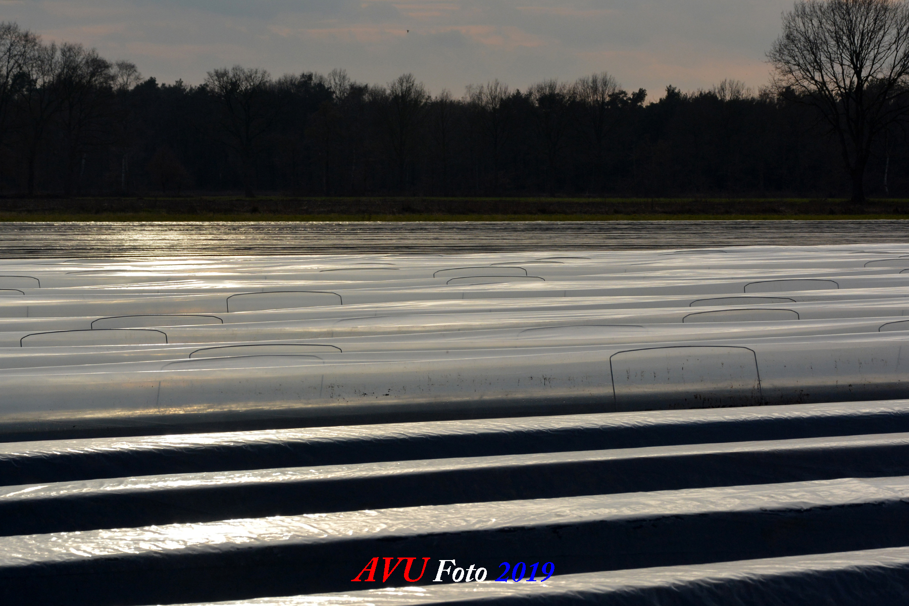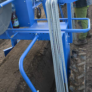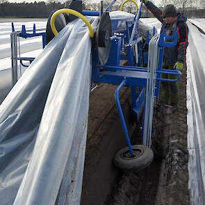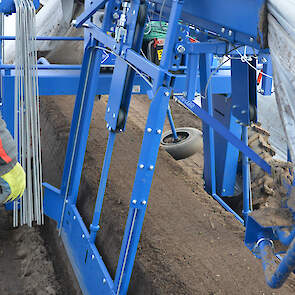 Men kan de tunnels met behulp van deze nieuwe Engels MBZ (M-Bogen Zetmachine) machine plaatsen. De door een accu aangedreven unit plaatst de vooraf gebogen staven in een hulpframe om ze later in de grond te persen. Hierdoor komt er extra ruimte vrij boven de aspergeruggen welke extra opgewarmd kan worden door de zonnestralen. De verhoging is duidelijk te zien op de foto. Reageren mag.