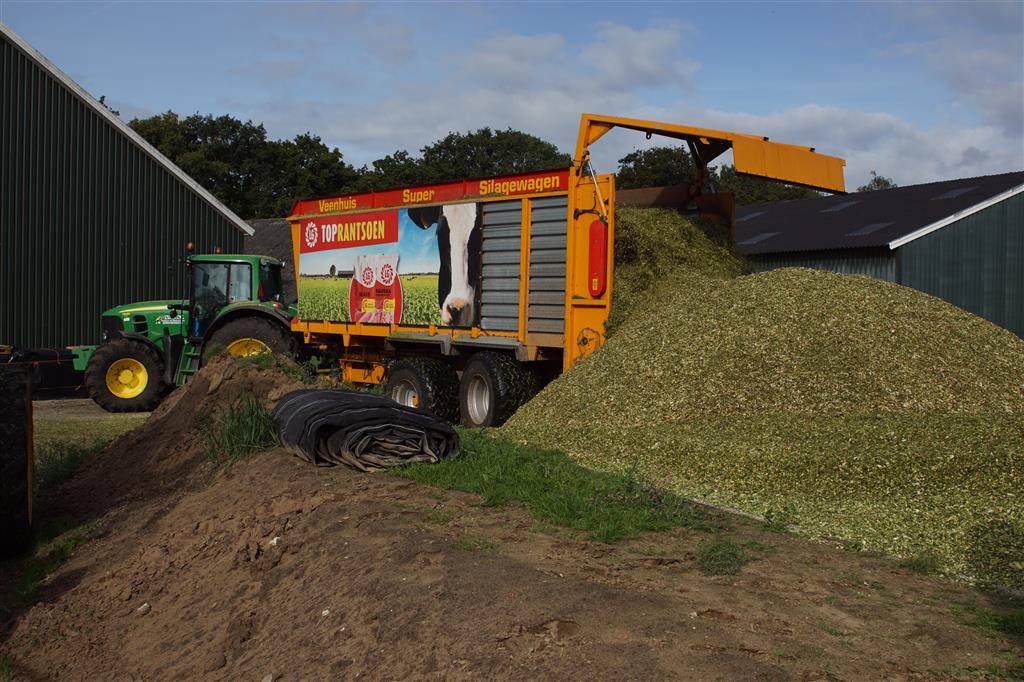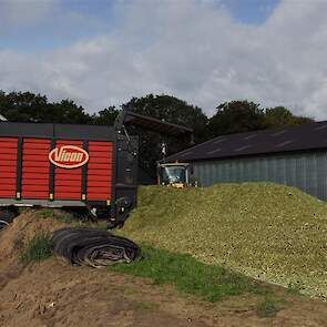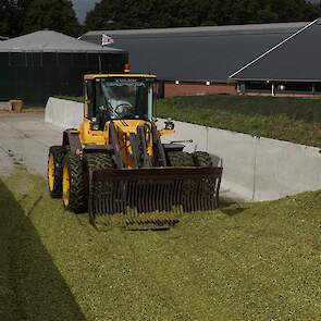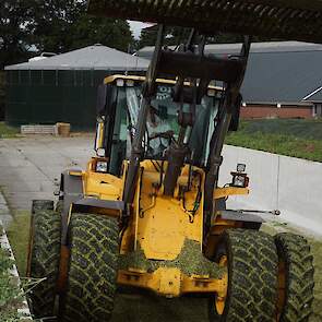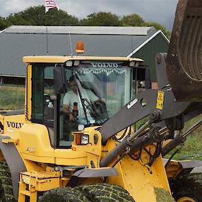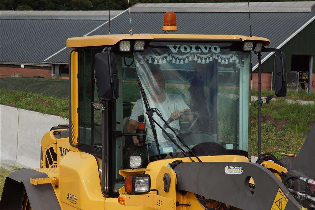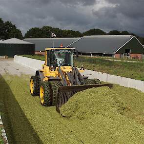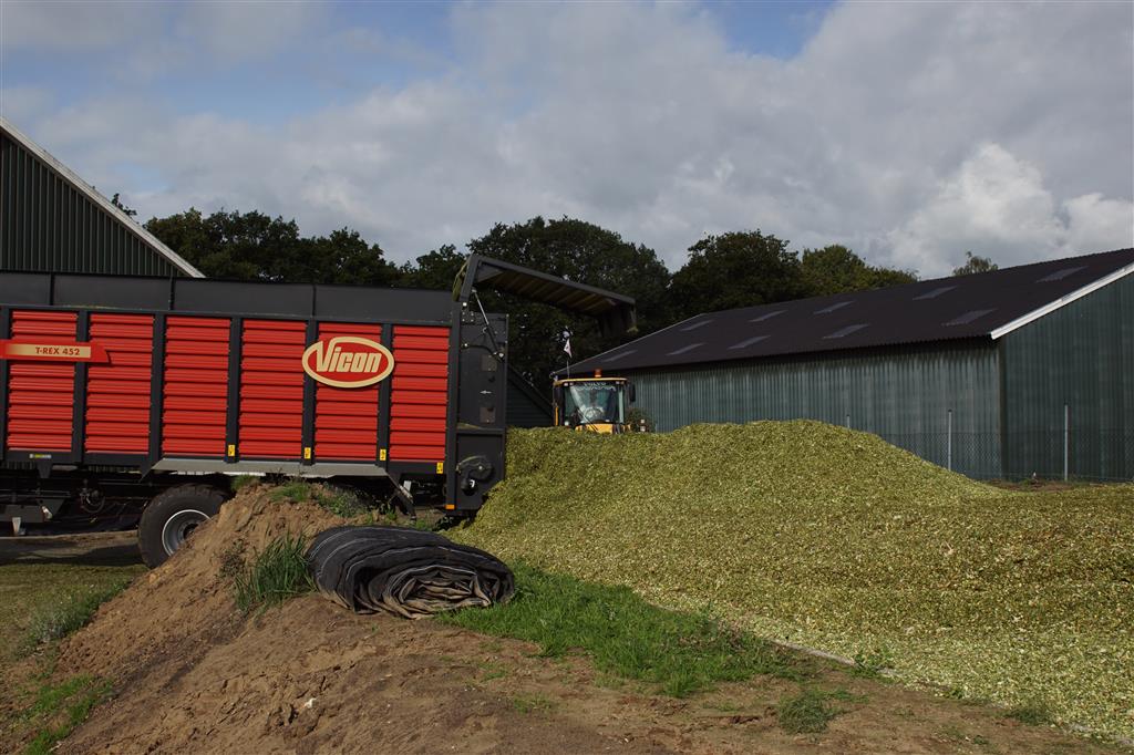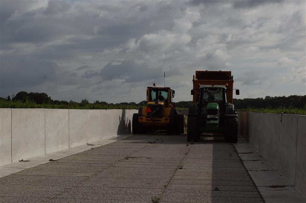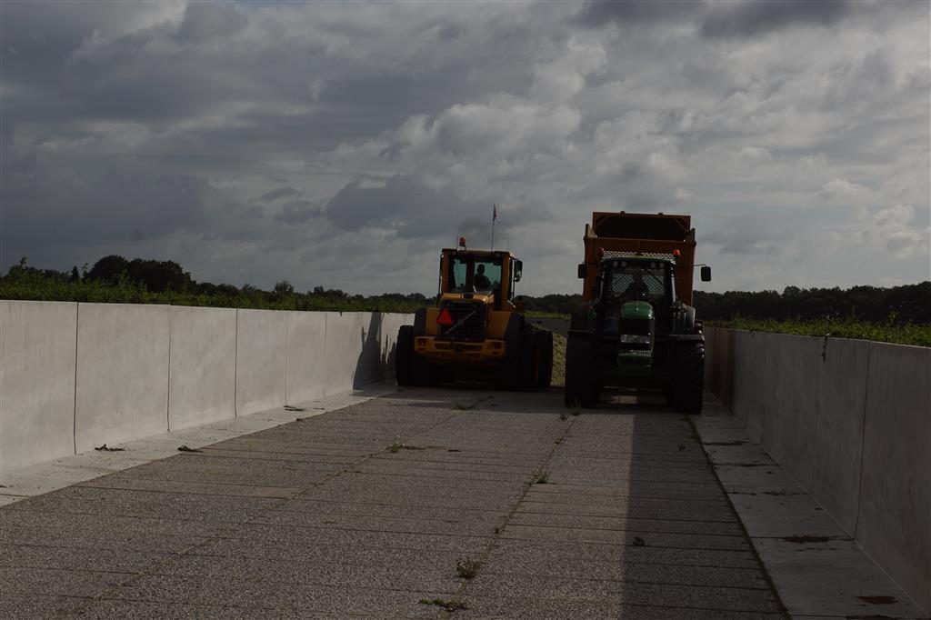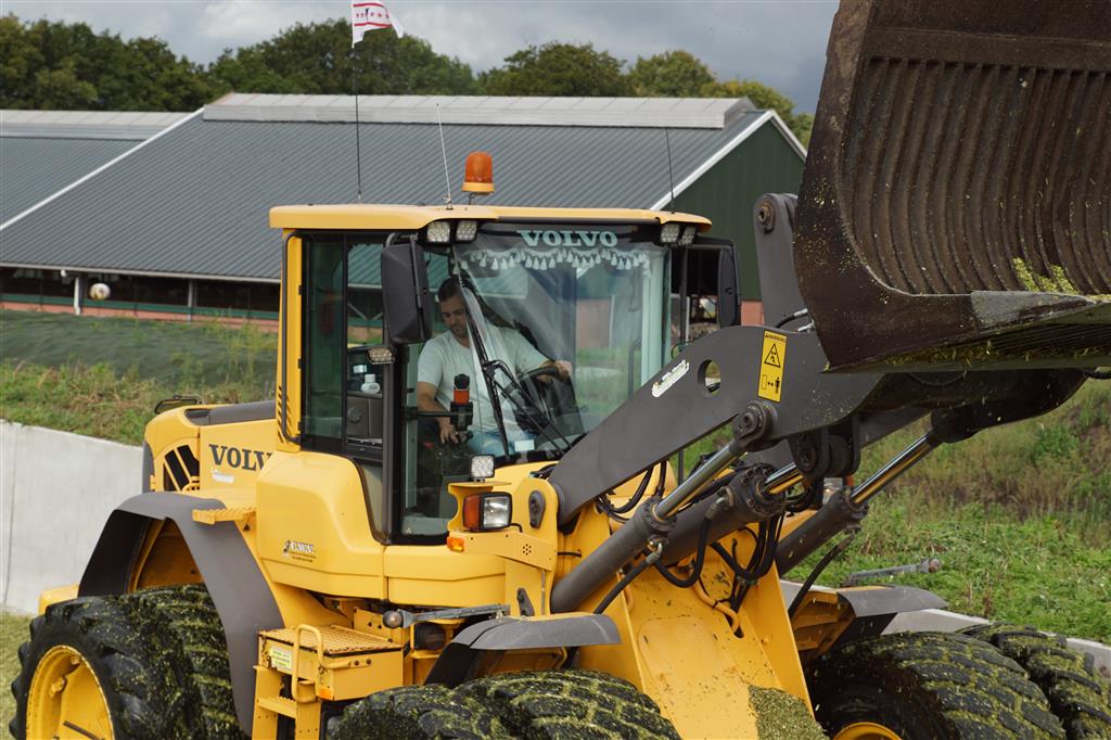 De shovelmachinist, van de Coöperatieve Werktuigenvereniging uit Emmen, is geconcentreerd bezig om er weer een mooie maiskuil van te maken.
