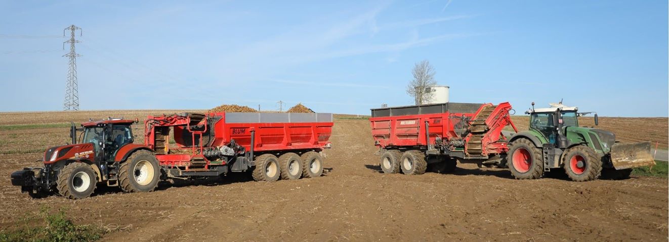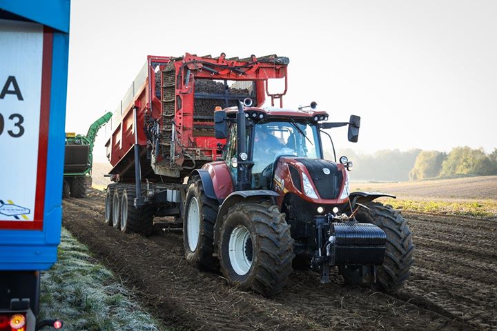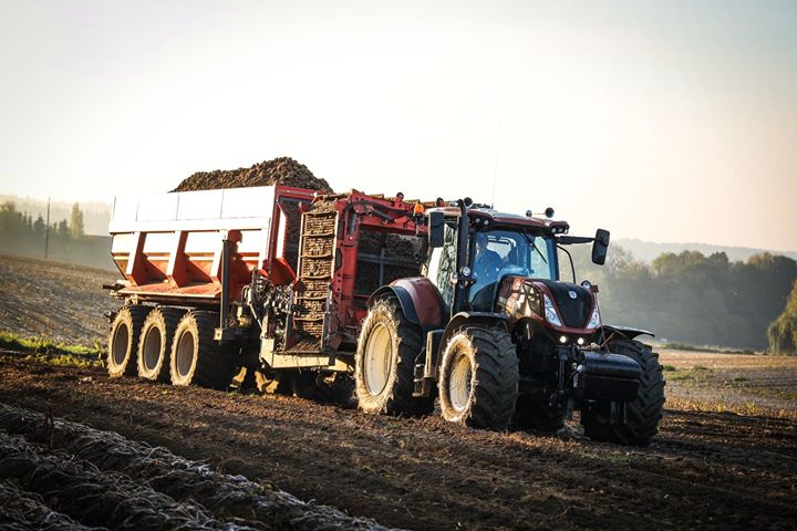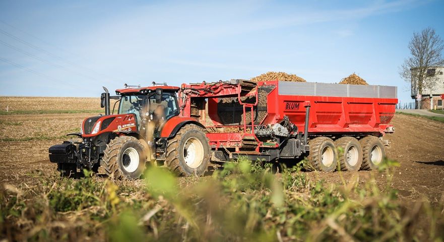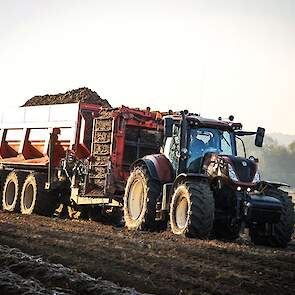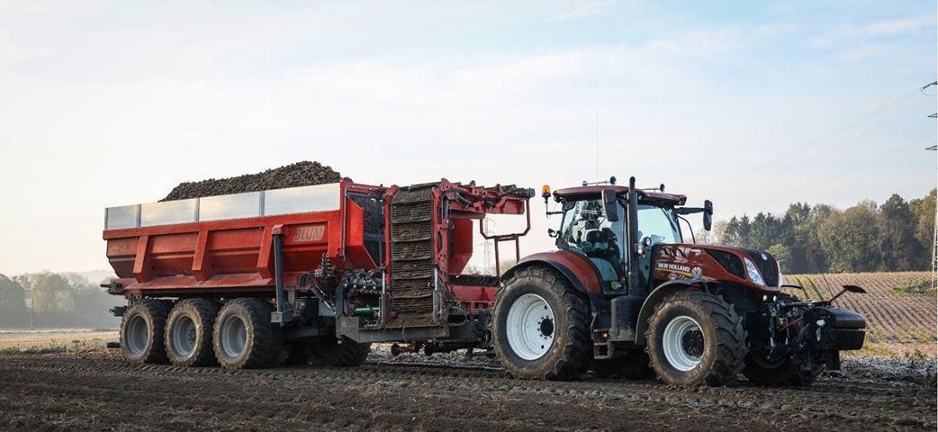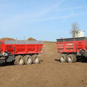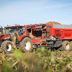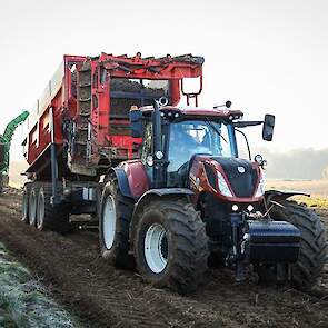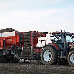 Met zéér grote loscapaciteit door bijna vlakliggende losband en 10 kuisrollen van 2.40 m breedte. Hydraulische tractie op de middenas met hogedrukpomp tot 90Kw.