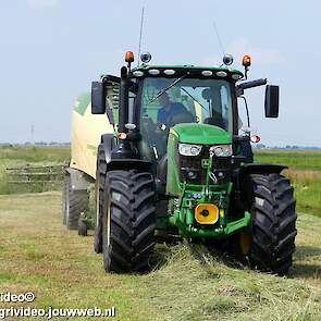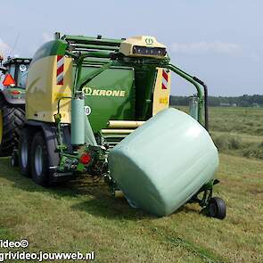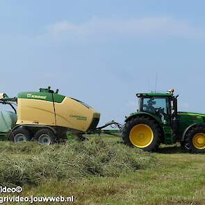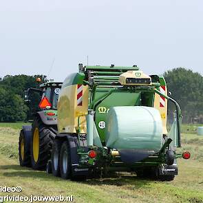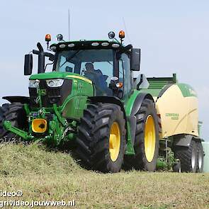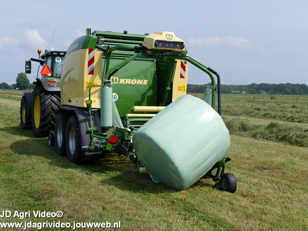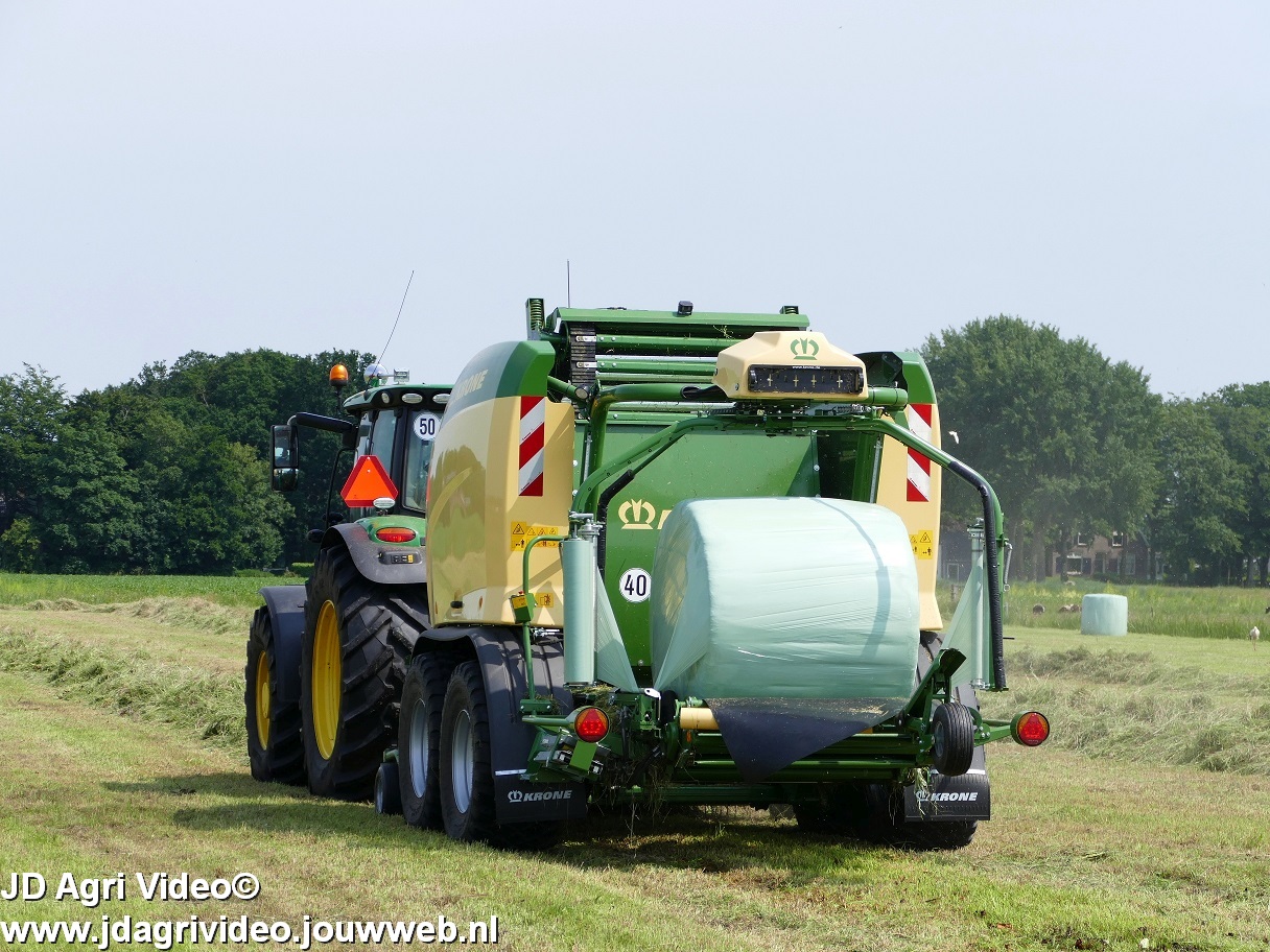 Loonbedrijf G.J. van den Berg uit Nunspeet aan het balen persen en wikkelen in Oosterwolde (GD) met een John Deere 6155R en nieuwe Krone Comprima CF 155 XC Plus.