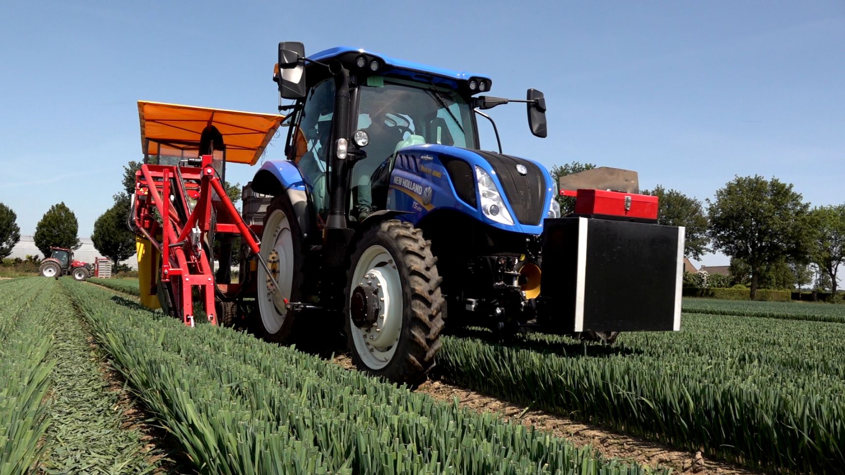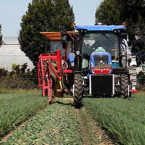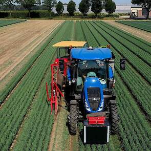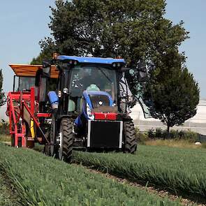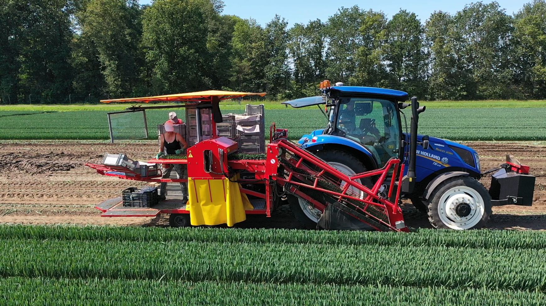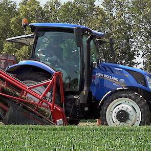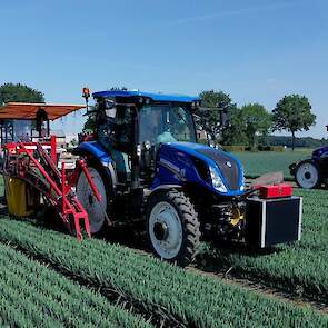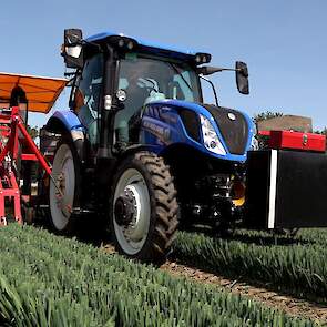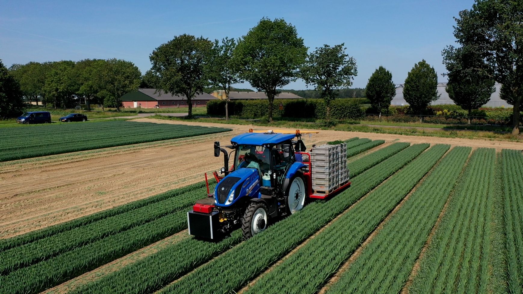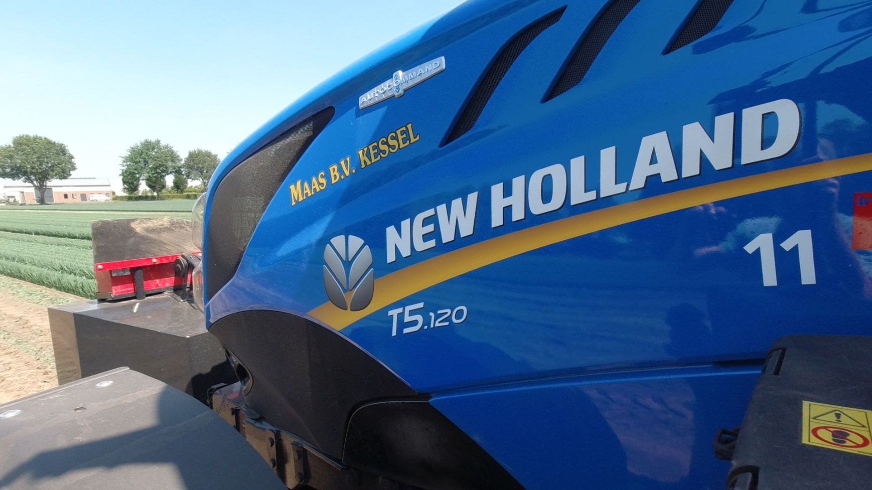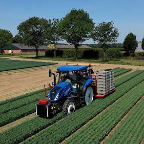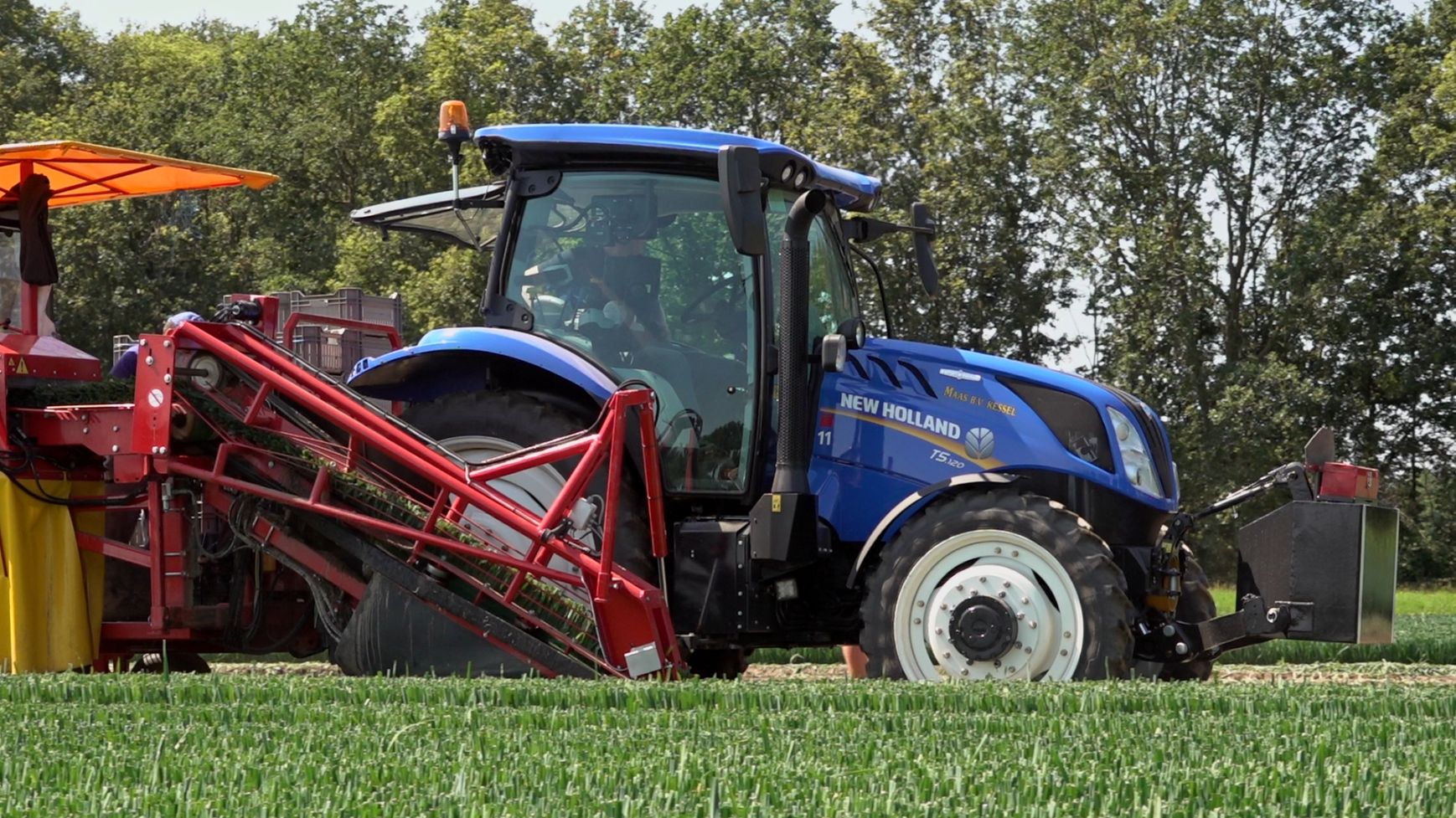 .Loonbedrijf Maas BV Kessel aan het preiplantgoed oogsten bij Lenders prei-en aspergeplanten met de New Holland T5.120 AC
