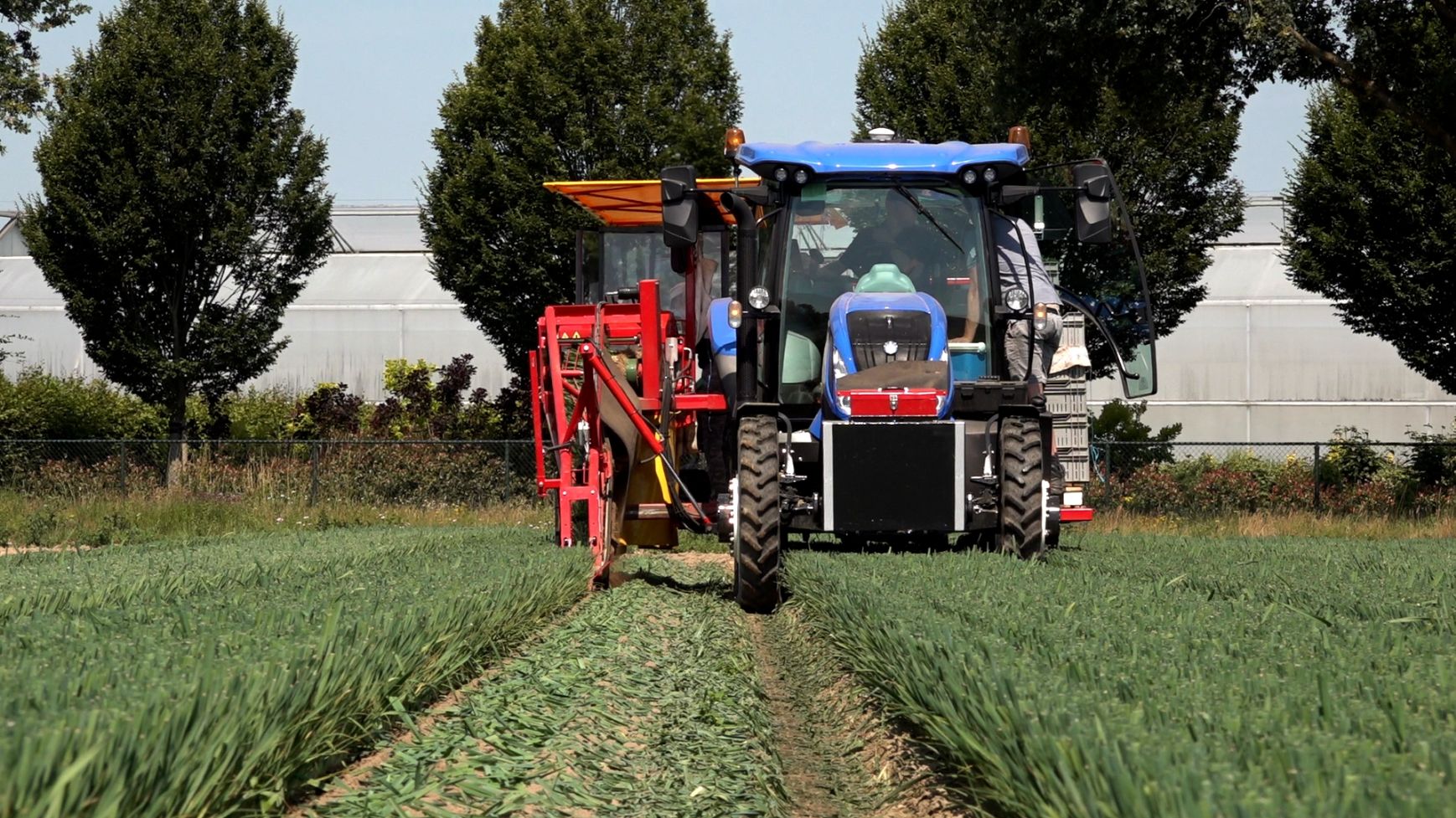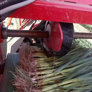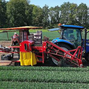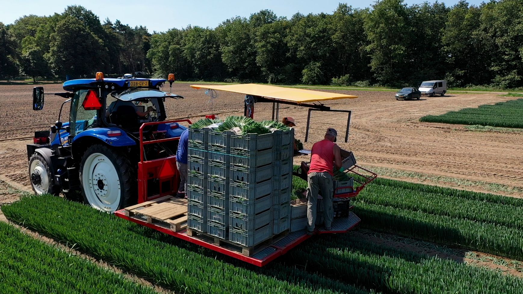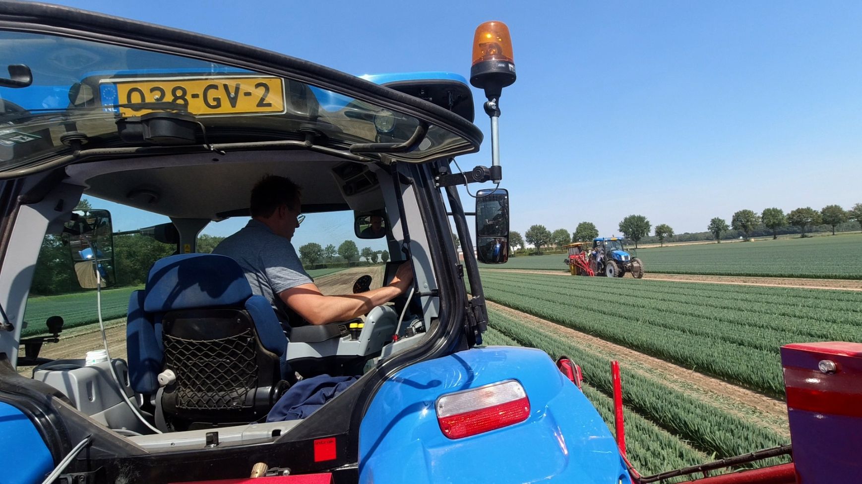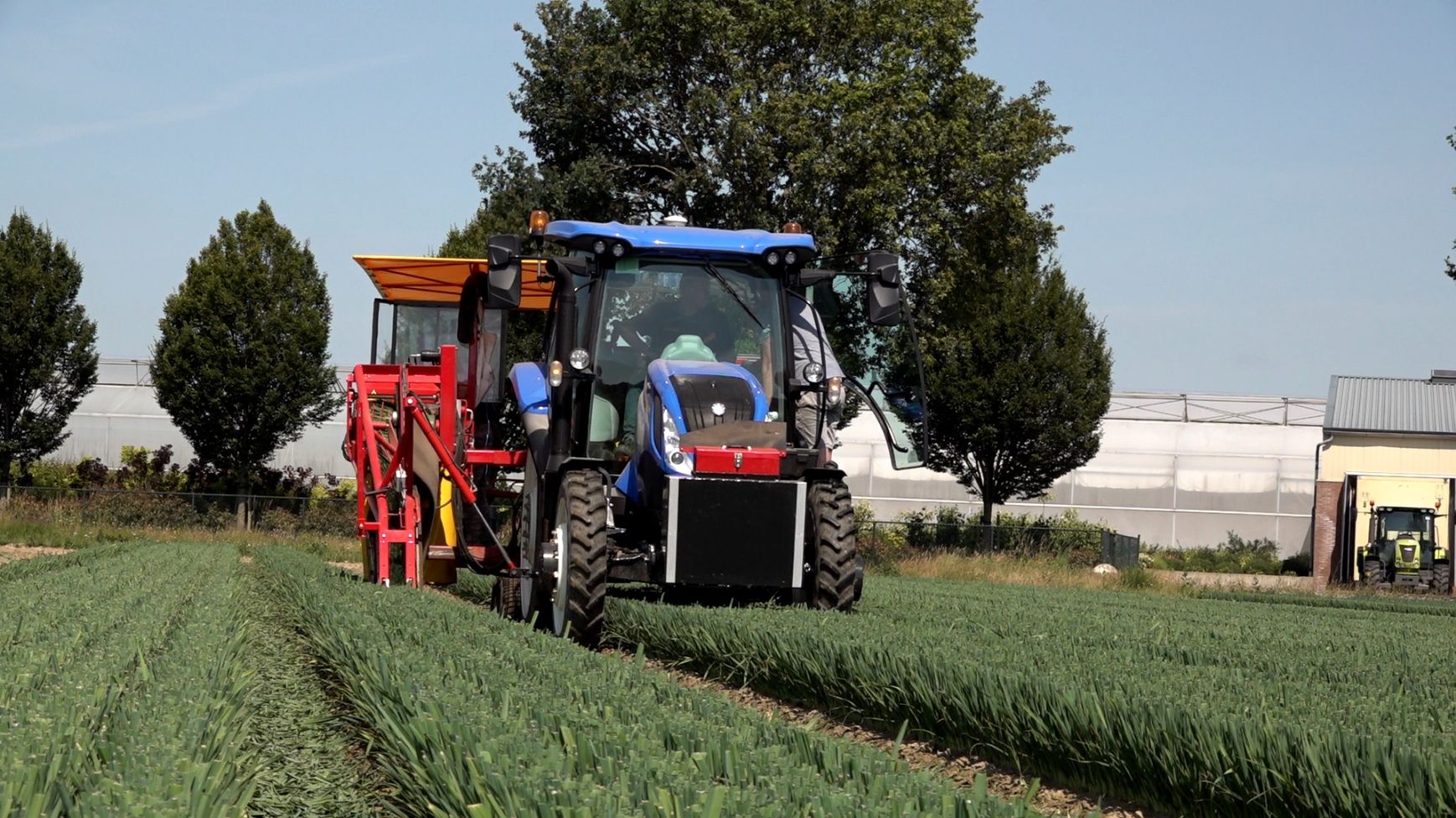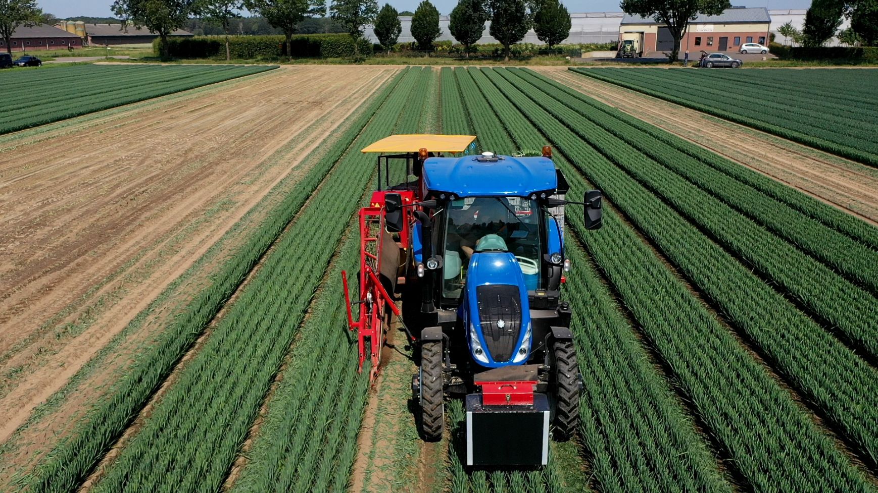 .Loonbedrijf Maas BV Kessel aan het preiplantgoed oogsten bij Lenders prei-en aspergeplanten met de New Holland T5.120 AC