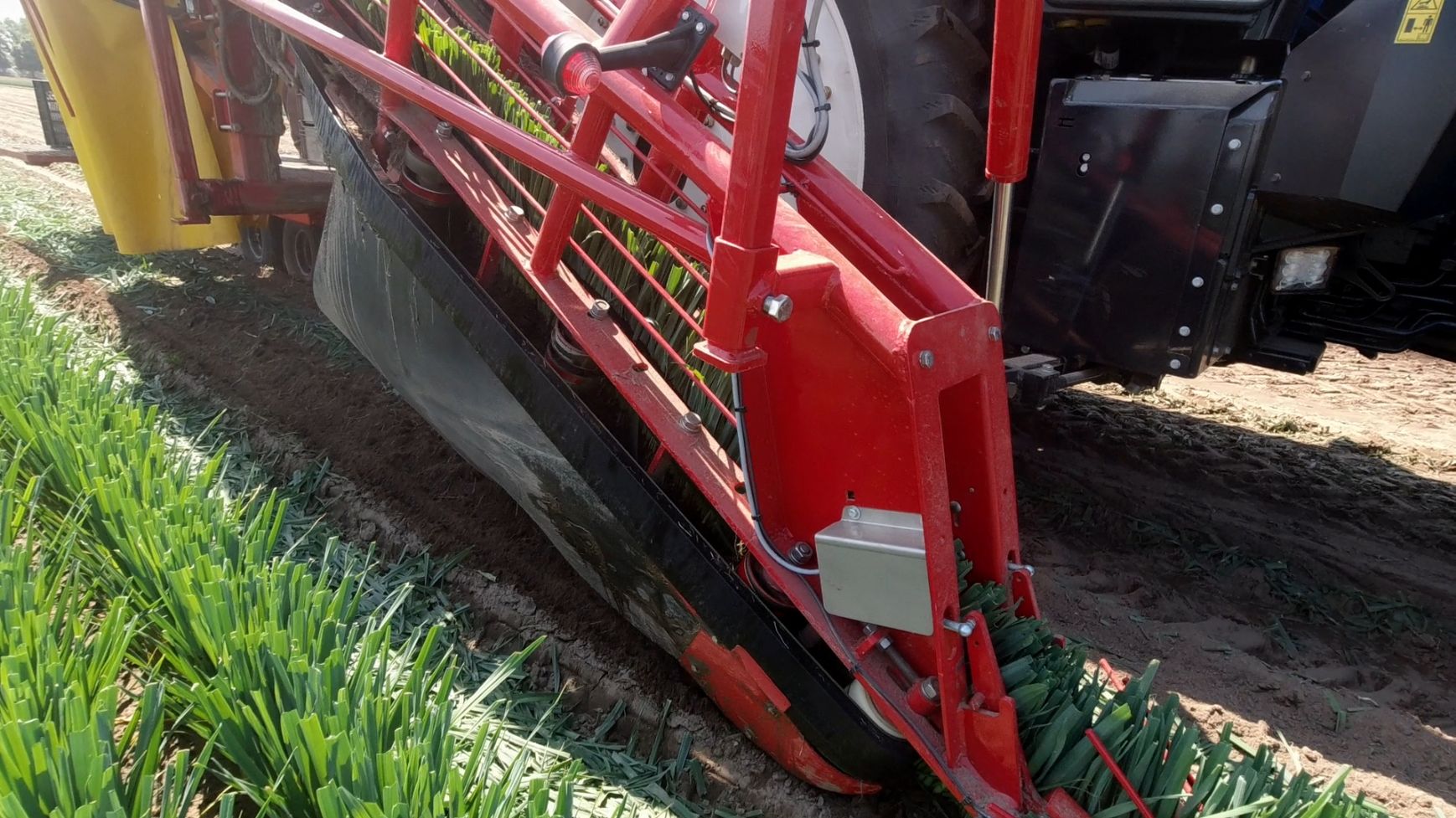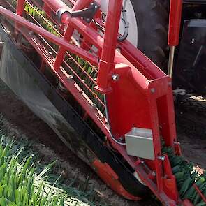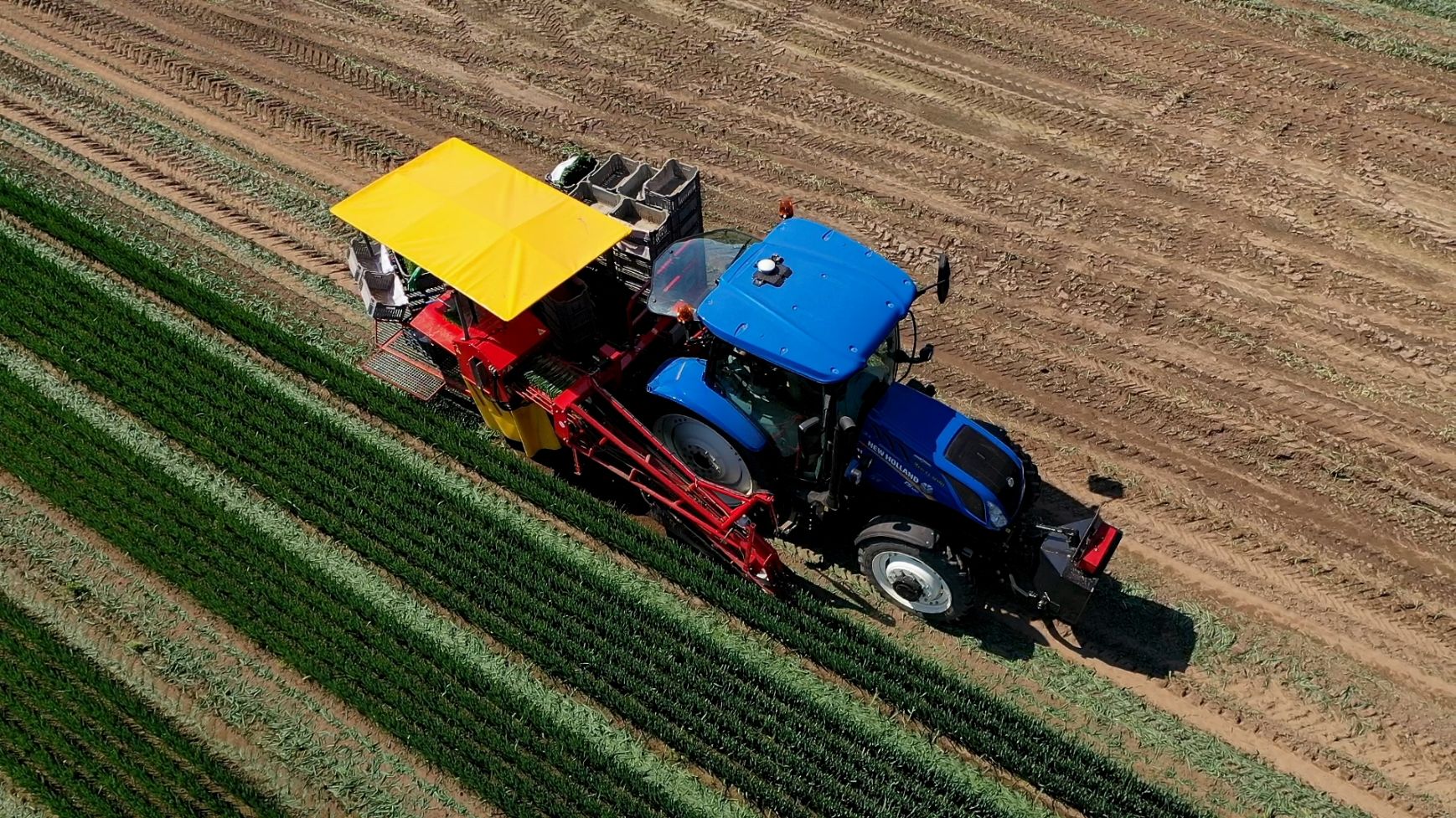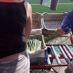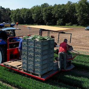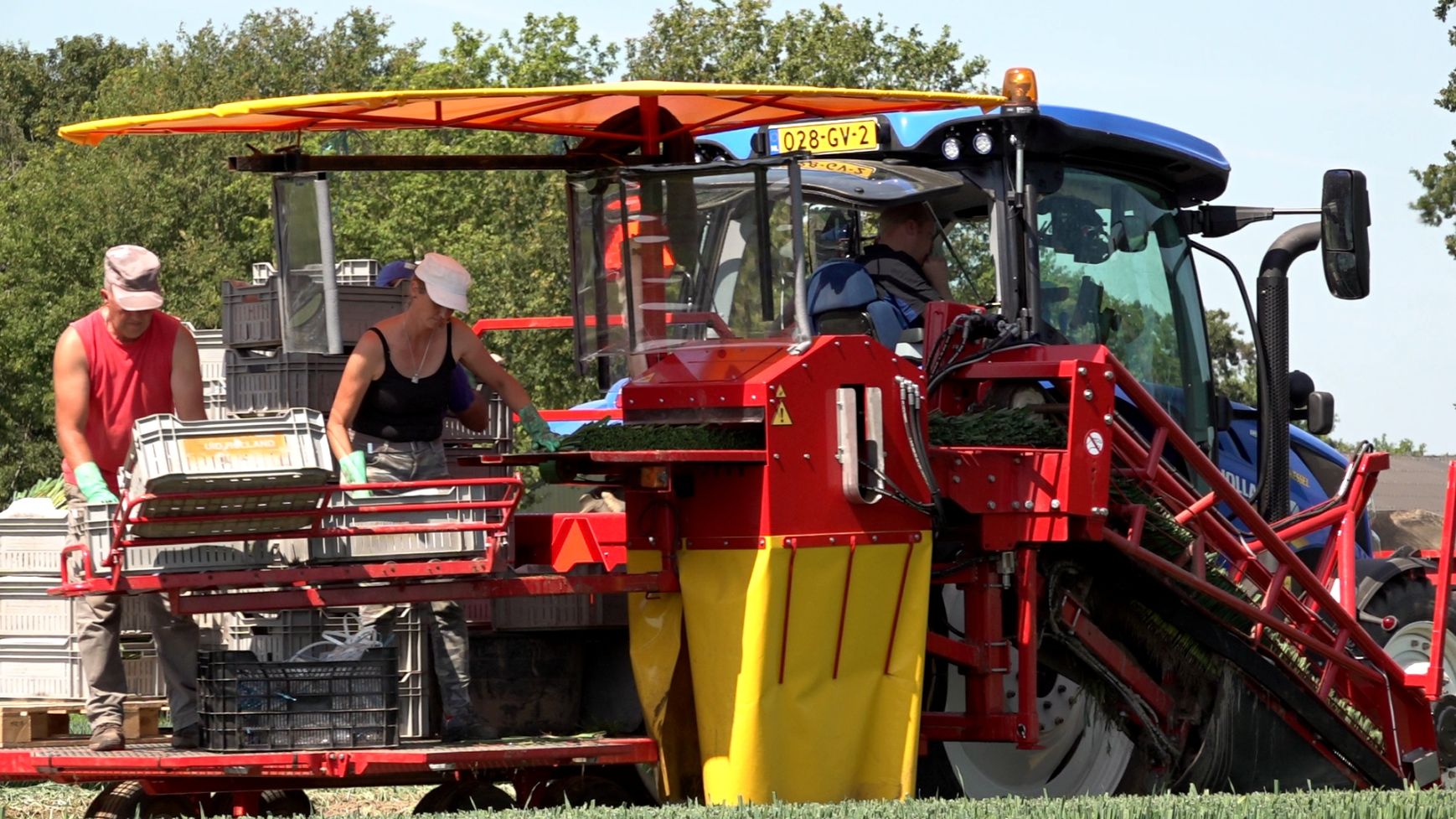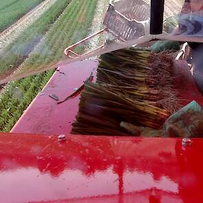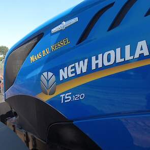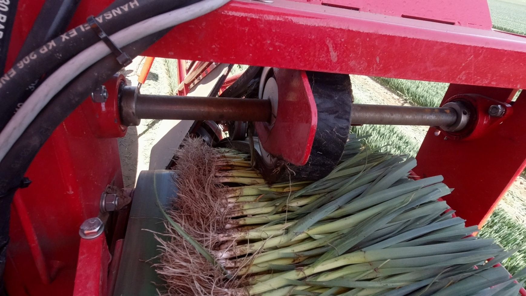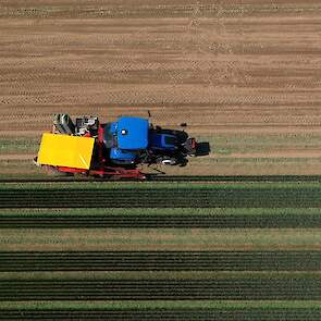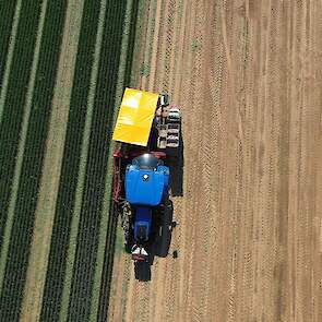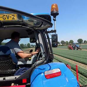 .Loonbedrijf Maas BV Kessel aan het preiplantgoed oogsten bij Lenders prei-en aspergeplanten met de New Holland T5.120 AC